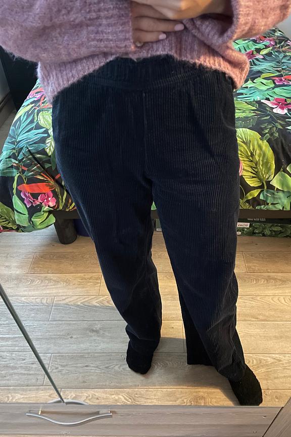 Complétez ce pantalon en velours côtelé bleu avec un pull coloré et des bottines pour un look moderne. Ses jambes amples et sa taille élastiquée ajoutent du confort, parfaites pour toutes vos journées. • Pantalon en velours côtelé • Jambes larges • Taille élastiquée • Style décontracté • Couleur bleu profond