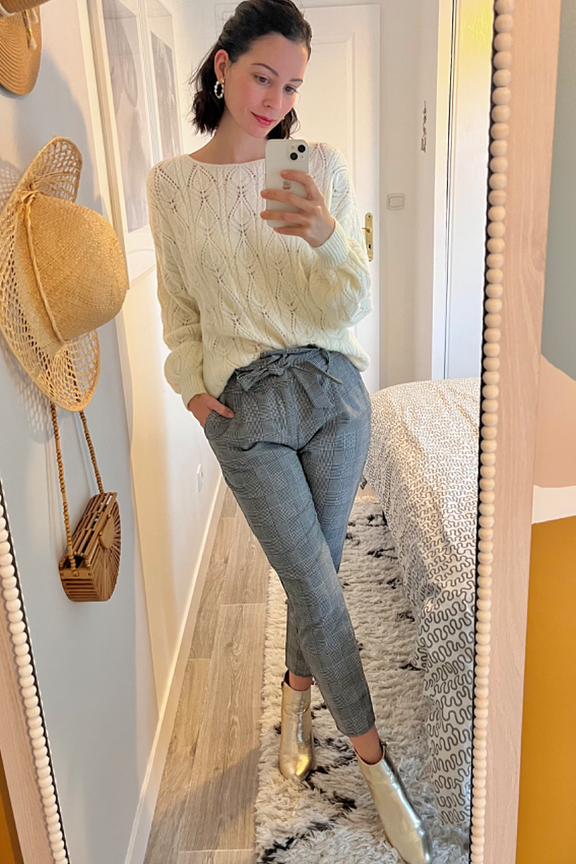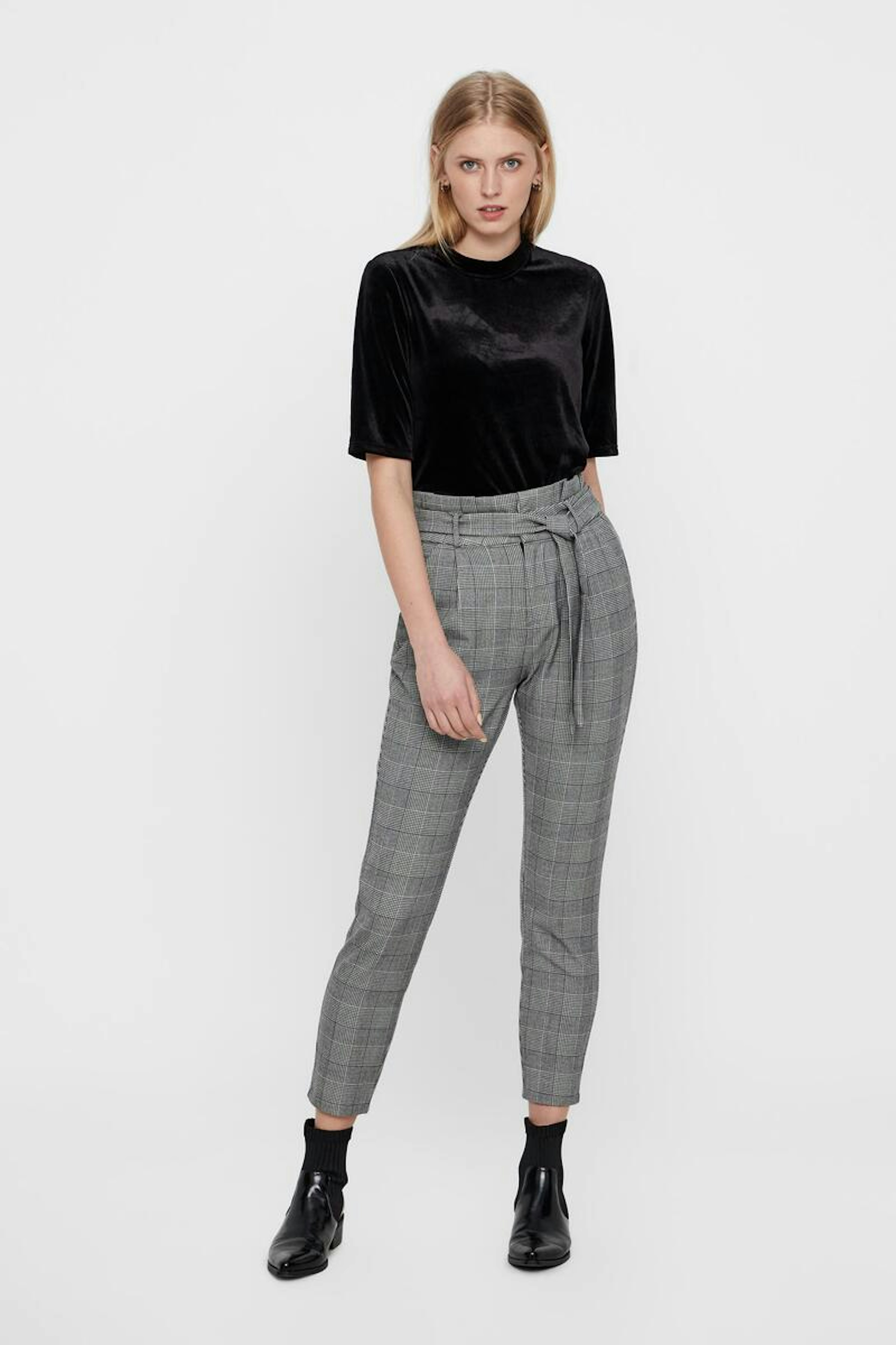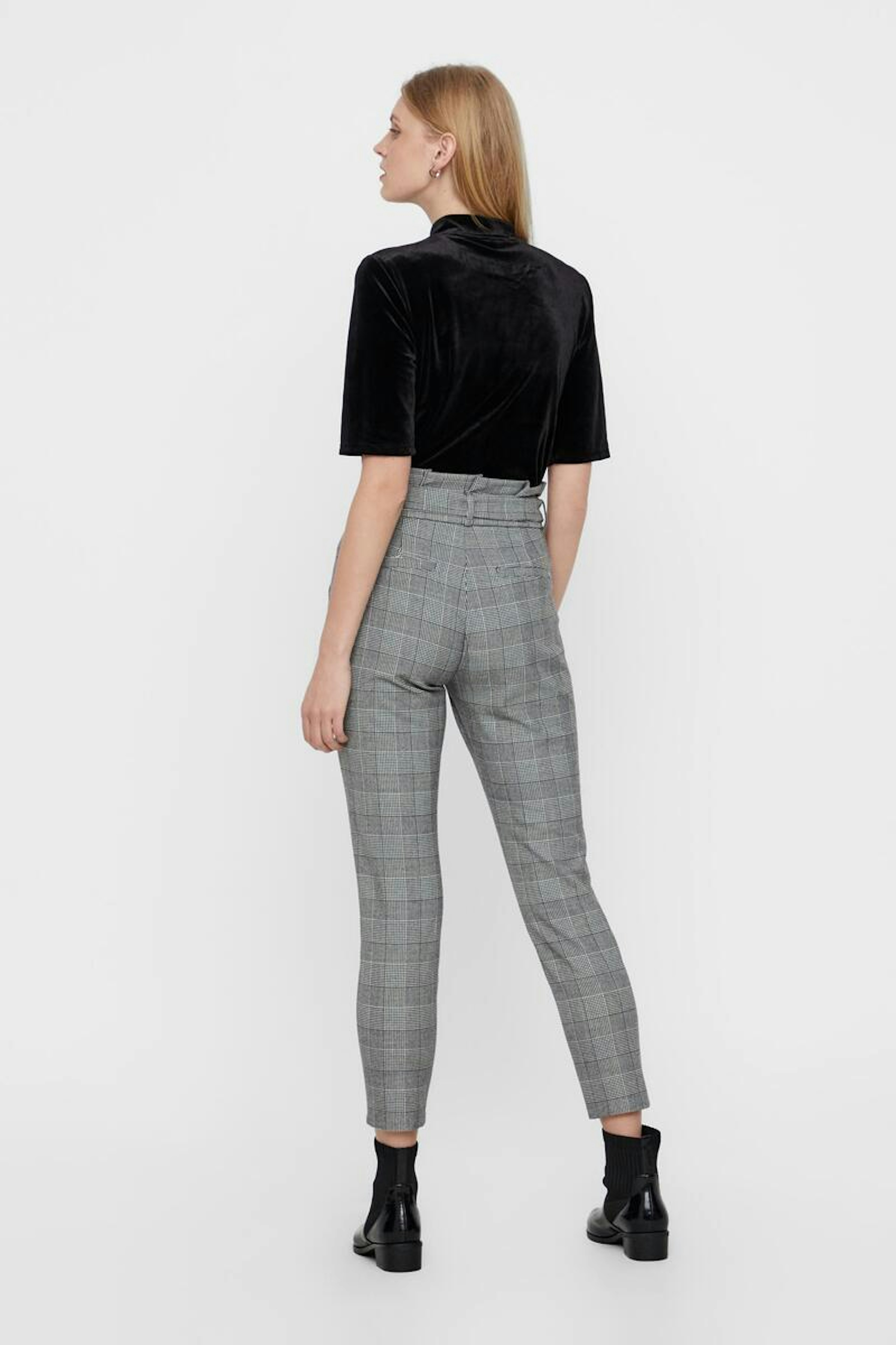 โข Pantalon forme paperbag gris โข Imprimรฉ carreaux style Prince de Galles โข Ceinture assortie โข Jambe fuselรฉe