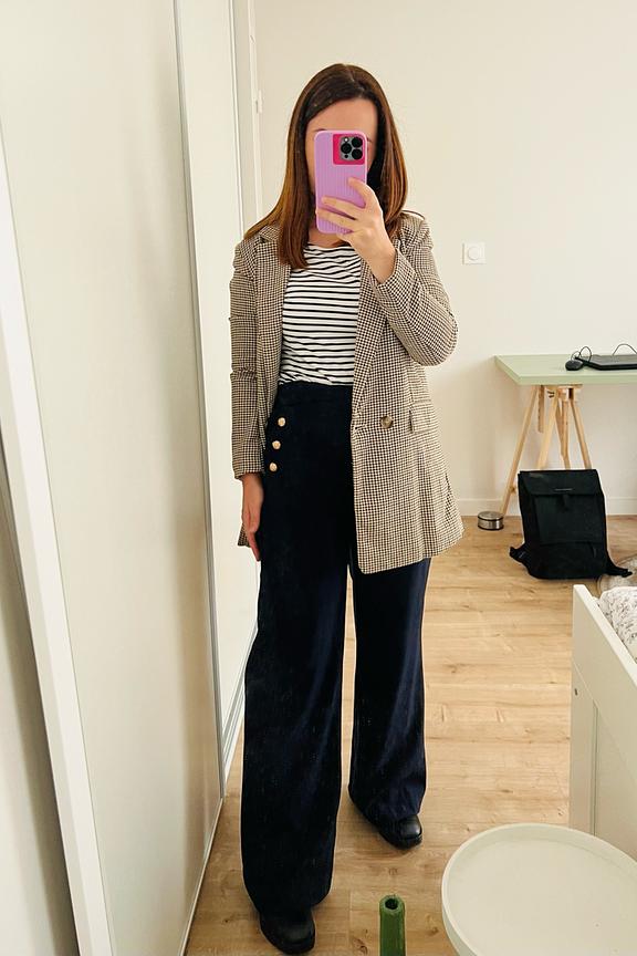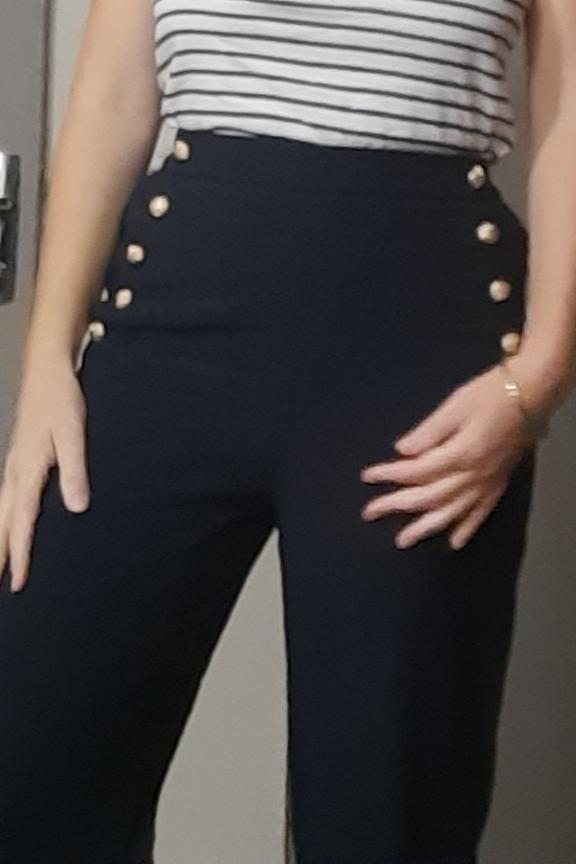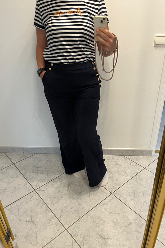 โข Pantalon ร pont, jambes larges et taille haute โข Poches italiennes cotรฉ devant et รฉlastiquรฉ au dos