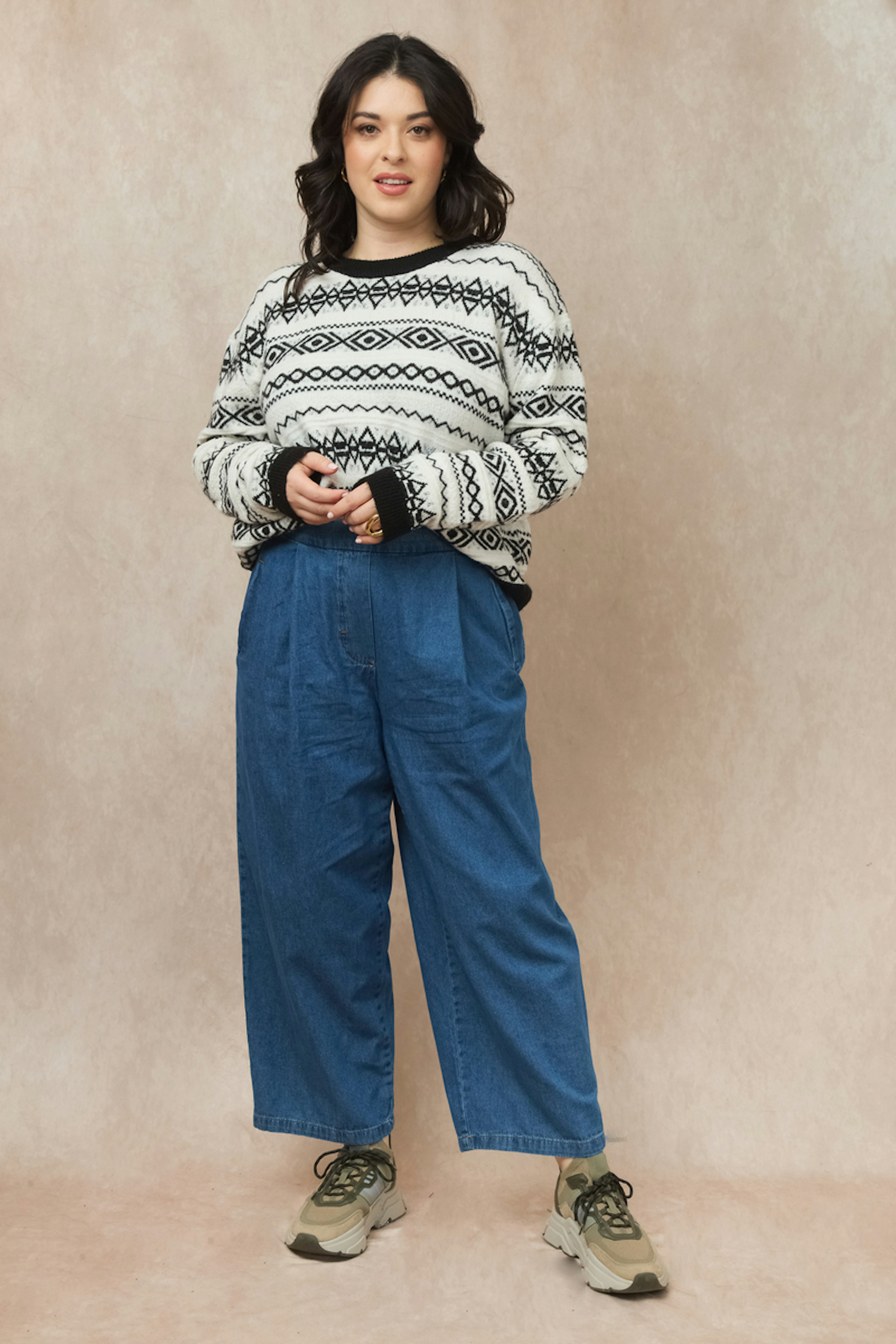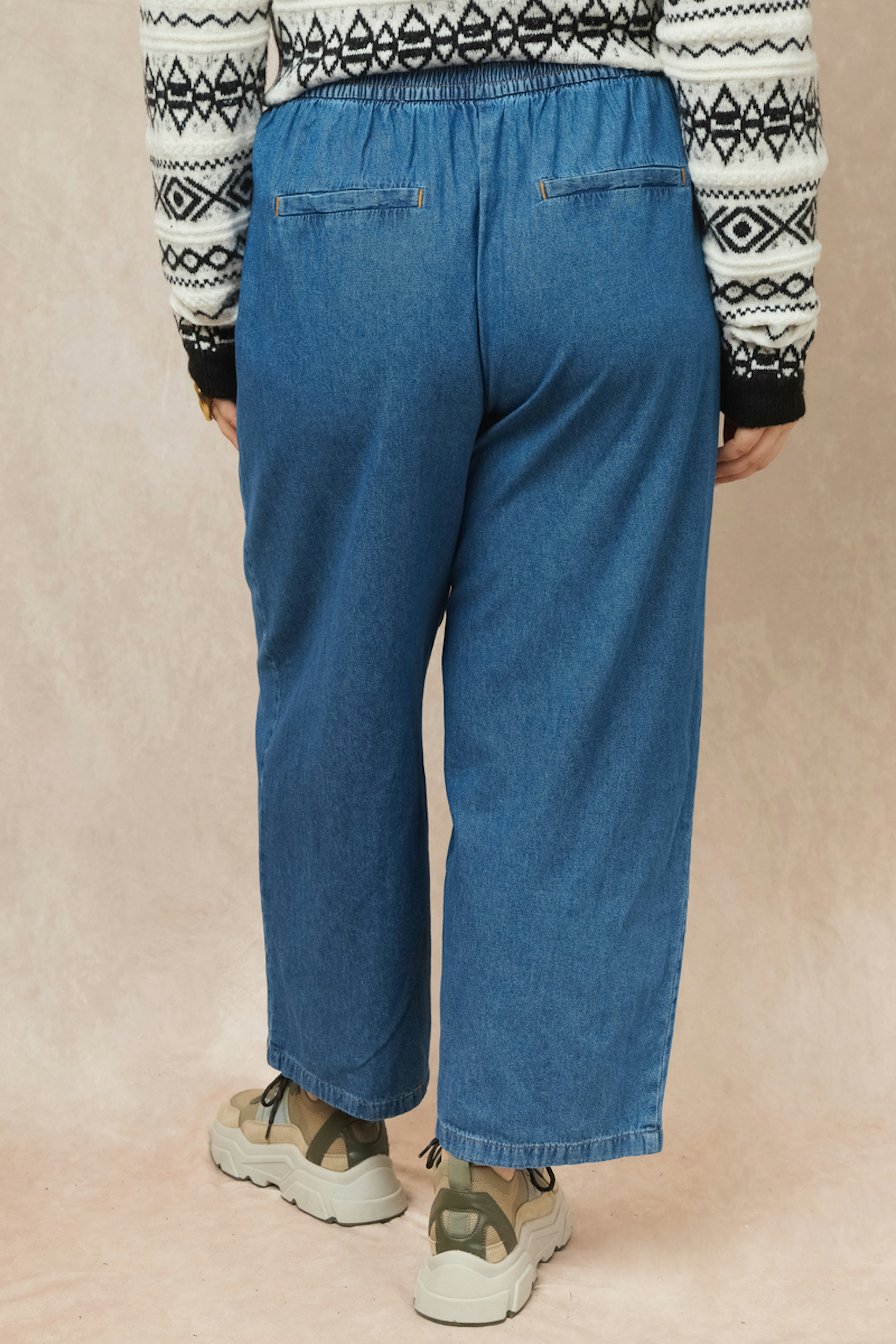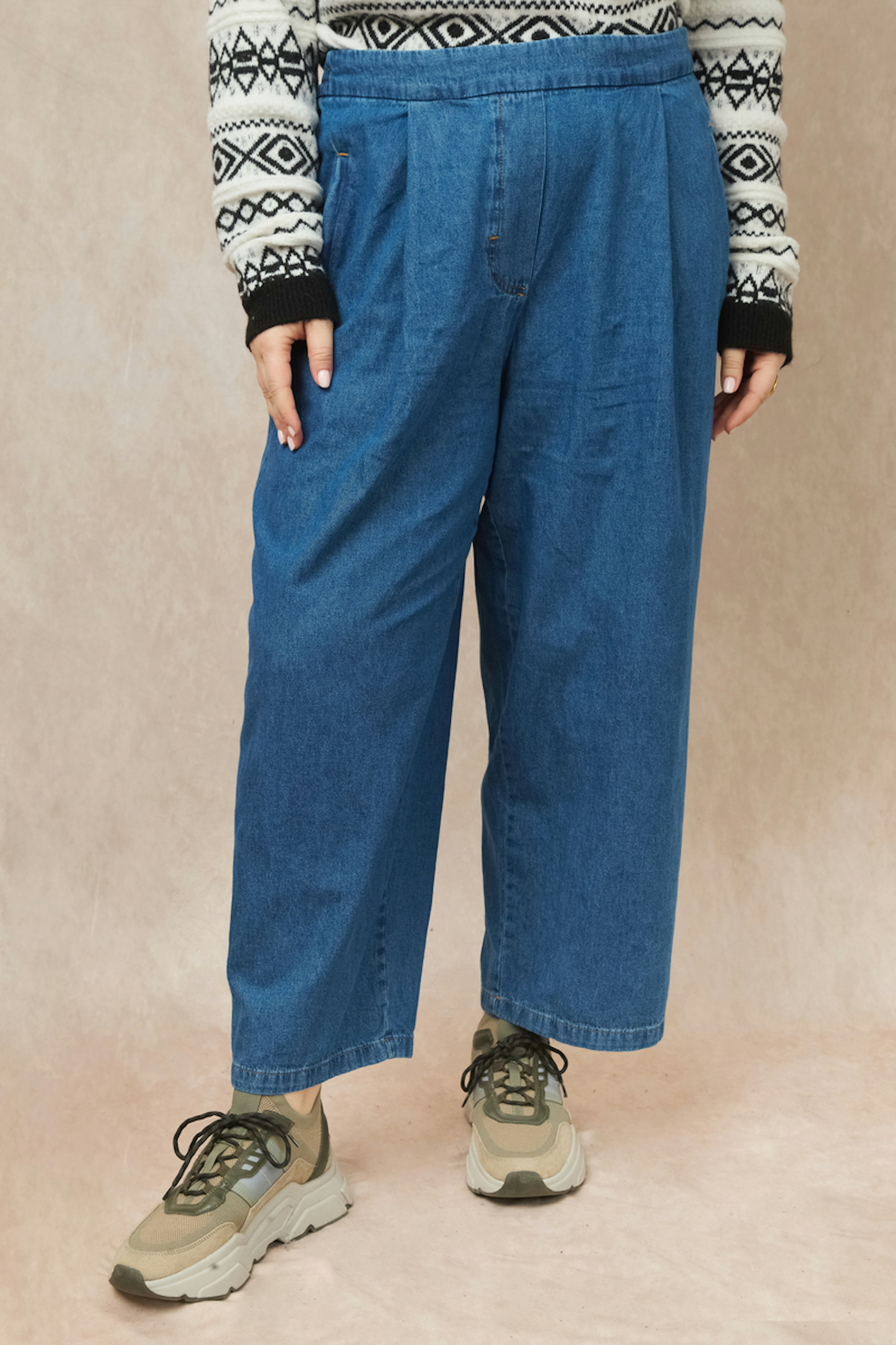 Associez ce pantalon avec un pull en laine et des baskets pour une allure décontractée. Parfait en toute saison. • Pantalon fluide en coton • Coupe large • Taille haute • Longueur cheville • Bleu intense