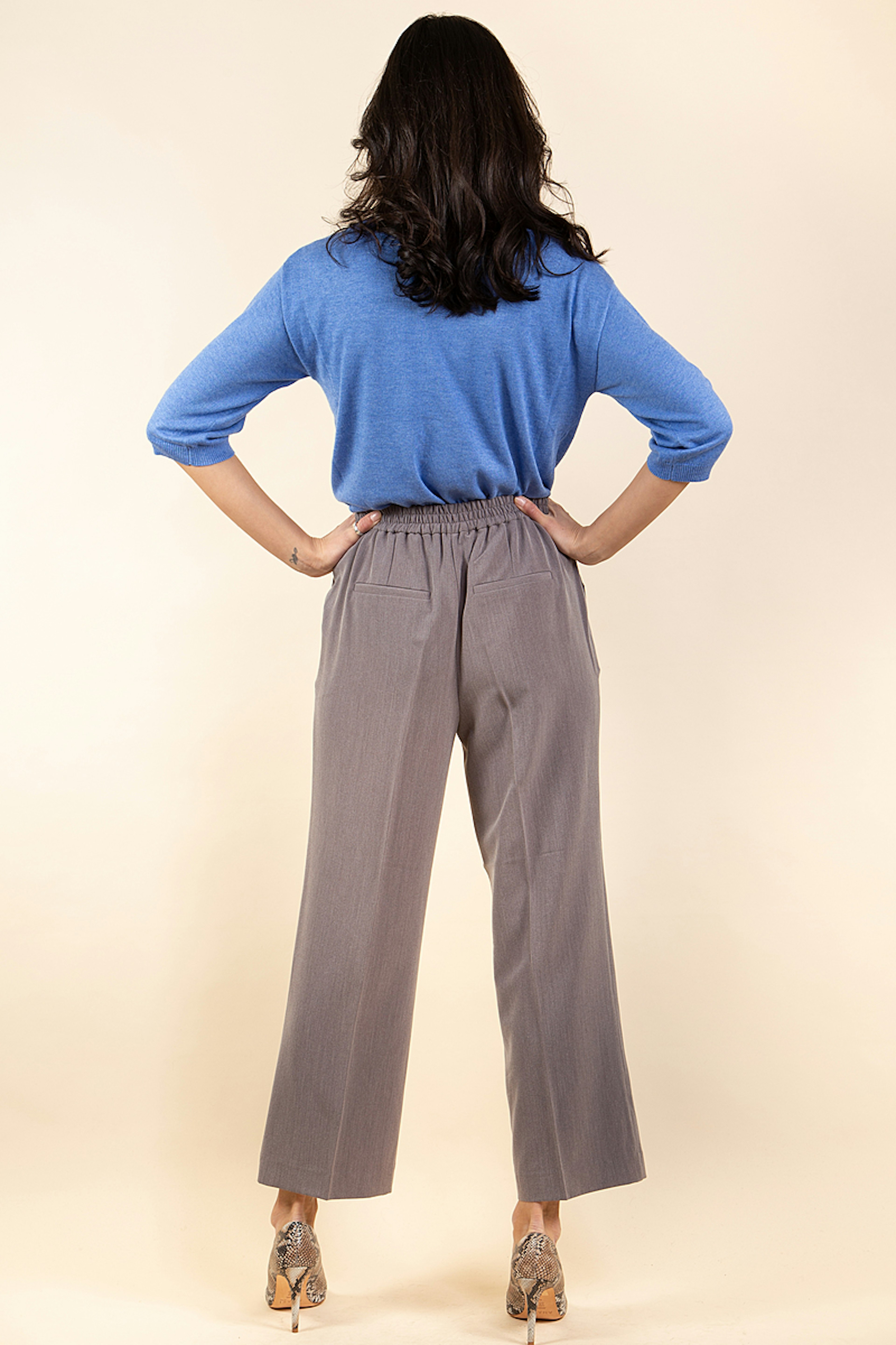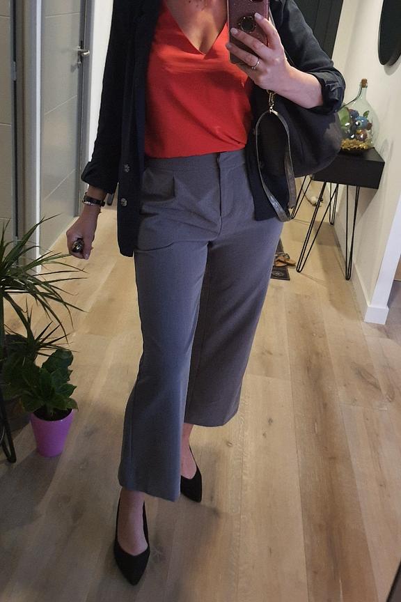 On adore ce pantalon gris ultra chic avec ses jambes รฉvasรฉes. Le plus ? Sa taille รฉlastiquรฉe qui s'adapte ร votre morphologie.