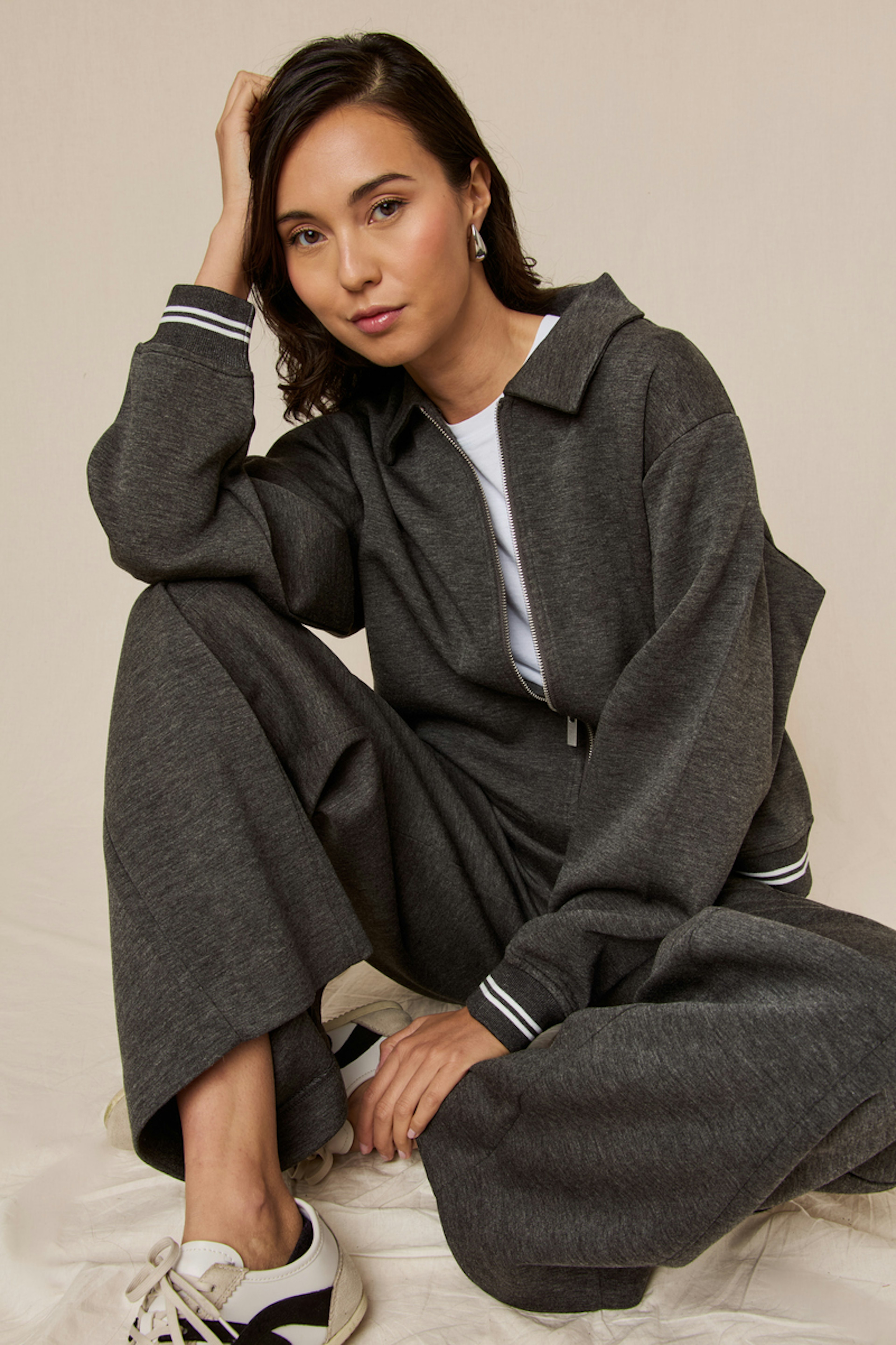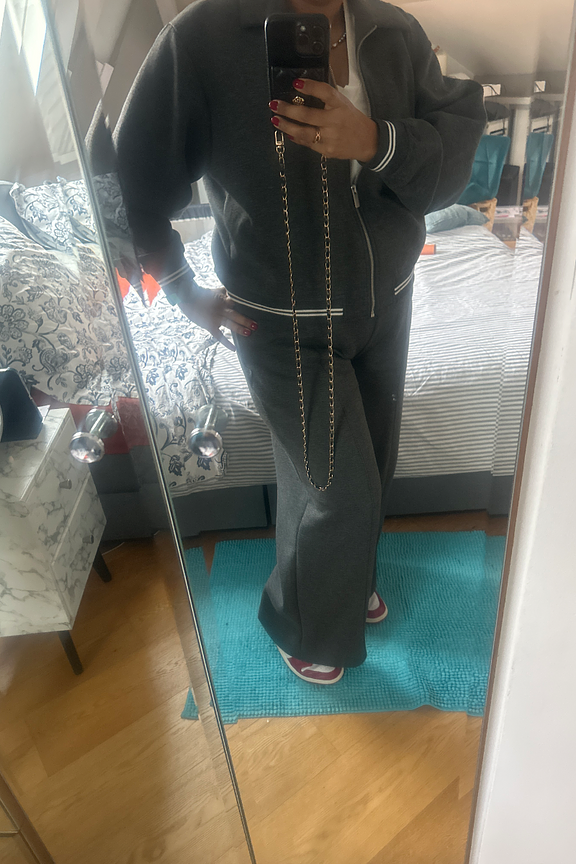 Optez pour une touche sportswear avec des baskets blanches et un sac en bandoulière pour un look urbain chic. Parfait en toute saison. • Ensemble avec veste et pantalon • Veste zippée • Manches longues • Pantalon coupe large • Détails à rayures