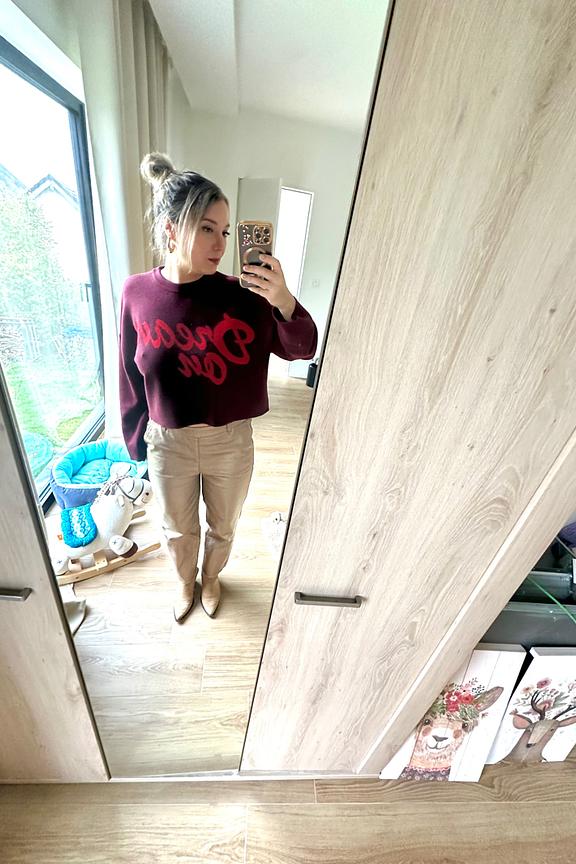 “Taille grand, la taille est élastique et on peut mettre une ceinture. Coupe droite. Très jolie couleur, pour un événement il fait son effet !”