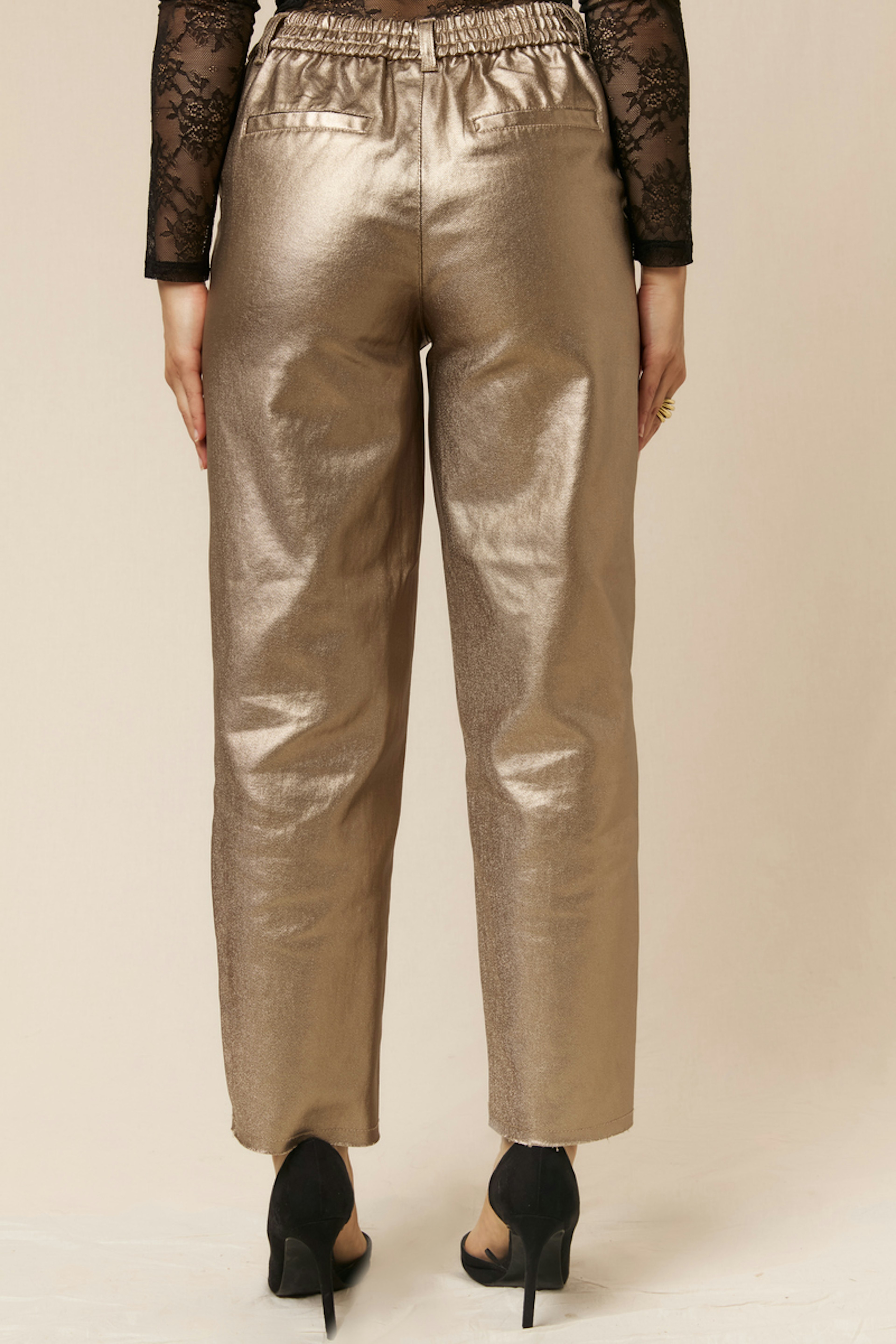 Associez ce pantalon doré scintillant à un haut ajusté noir et des escarpins noirs pour un look glamour. Idéal pour l'hiver avec un manteau chic. • Pantalon brillant • Coupe ample • Taille haute • Longueur cheville • Chaîne décorative à la taille