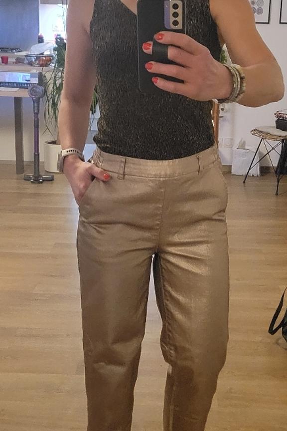 “Ce pantalon taille grand. J'ai pris du M pour mon 42 et c'est ok. Il est assez rigide, il fait du bruit quand on marche. Il est assez court. Ok pour 168 cm mais si vous êtes plus grande, ça va être trop court.”