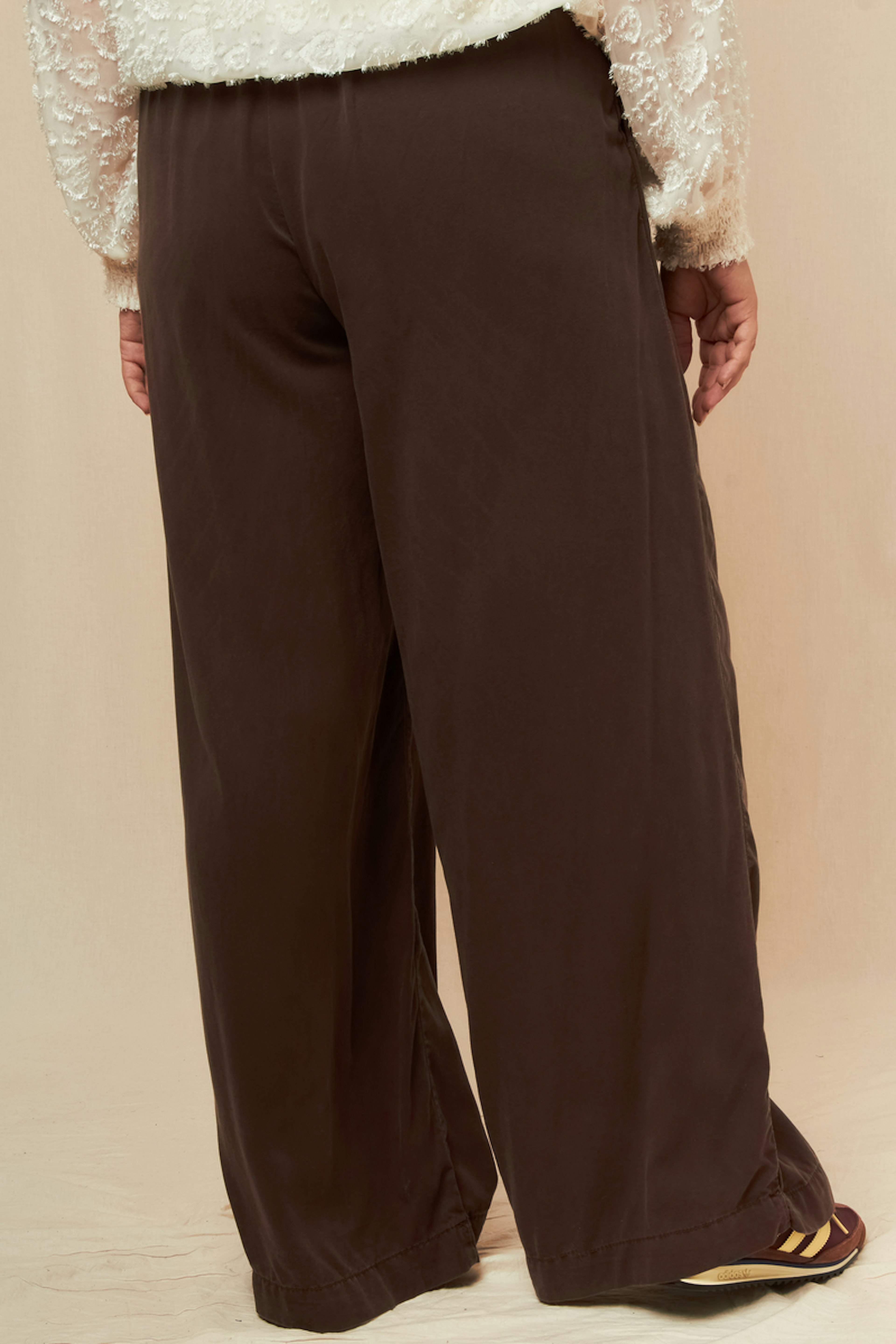 Associez ce pantalon large avec un haut ajusté pour créer un contraste élégant. Parfait pour toutes les saisons ! • Pantalon large en lyocell • Taille haute flatteuse • Jambes amples et fluides • Toucher doux et soyeux • Couleur marron riche et intense