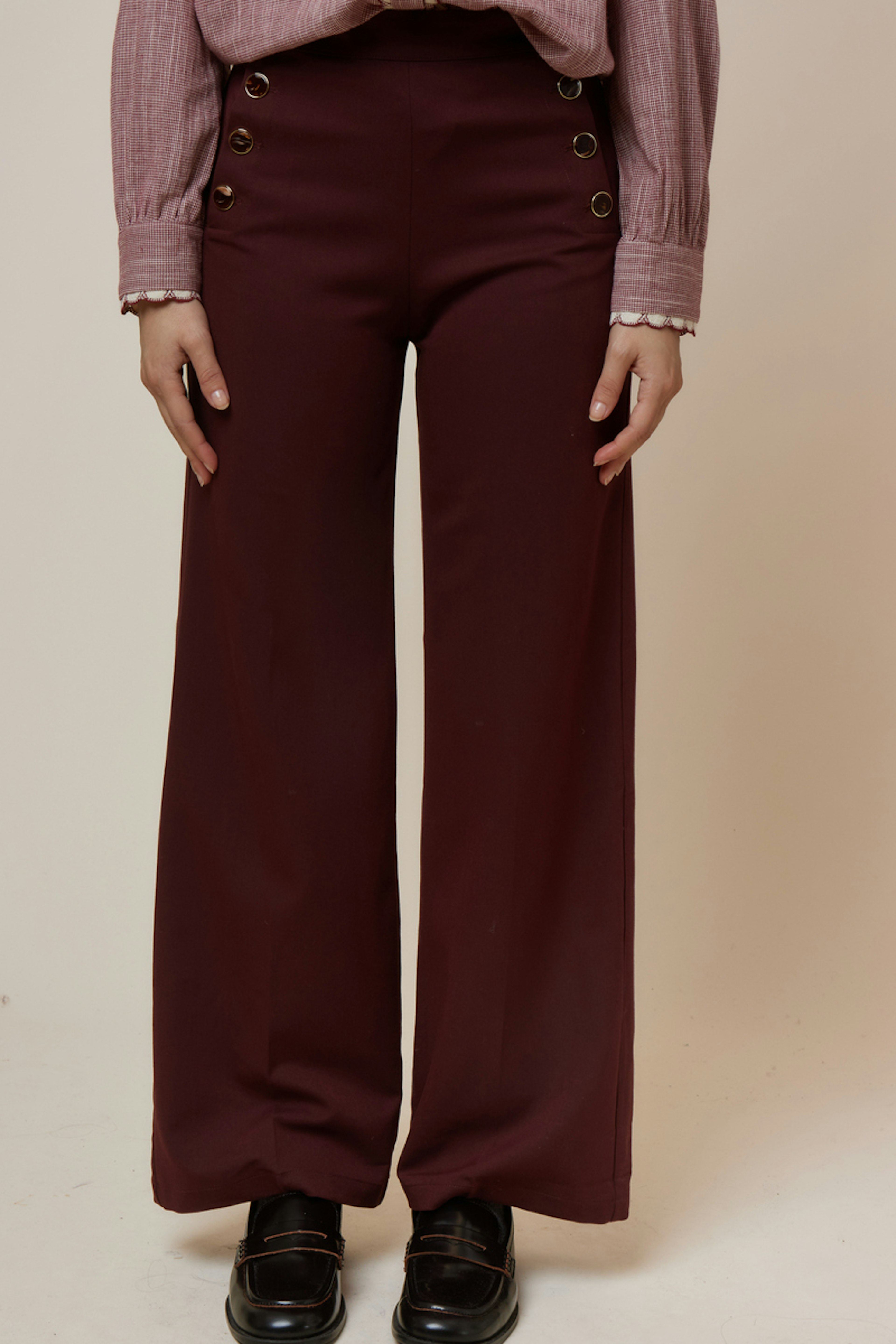 Ce pantalon marron se mariera élégamment avec un chemisier crème et des bottines à talons pour un look chic d'hiver. • Pantalon coupe droite • Taille haute • Fermeture ajustée • Détails boutons dorés • Sans pinces devant