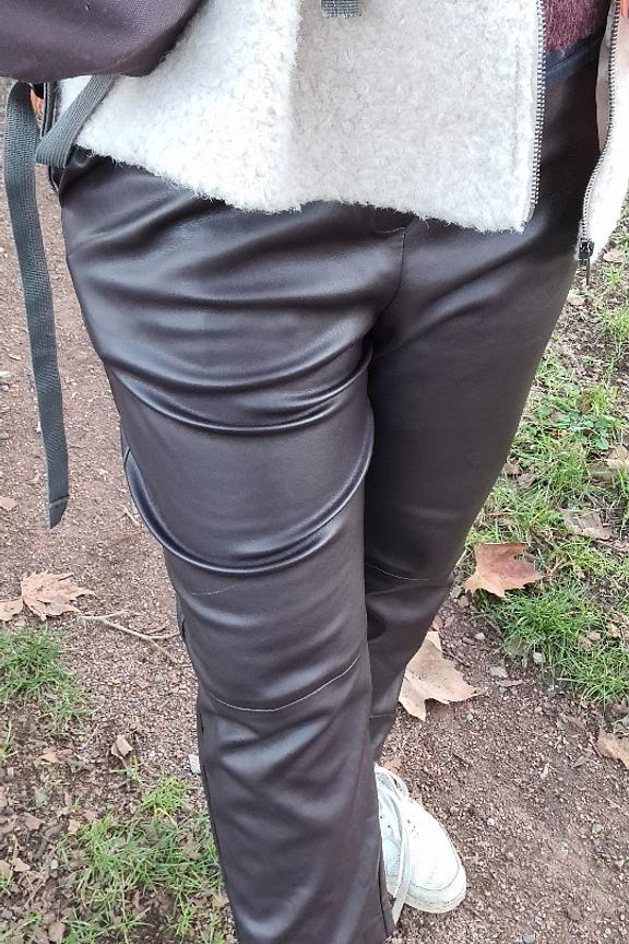 Associez ce pantalon avec un pull en cachemire doux et des bottines pour un style รฉlรฉgant et confortable. โข Pantalon ร coupe confortable โข Taille รฉlastiquรฉe pour l'aisance โข Jambes droites pour une allure moderne โข Imitation cuir pour un look chic โข Couleur marron chic et polyvalente