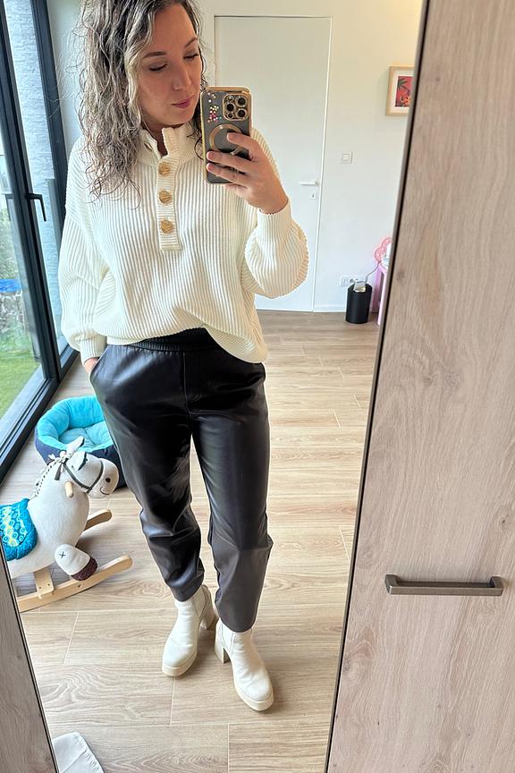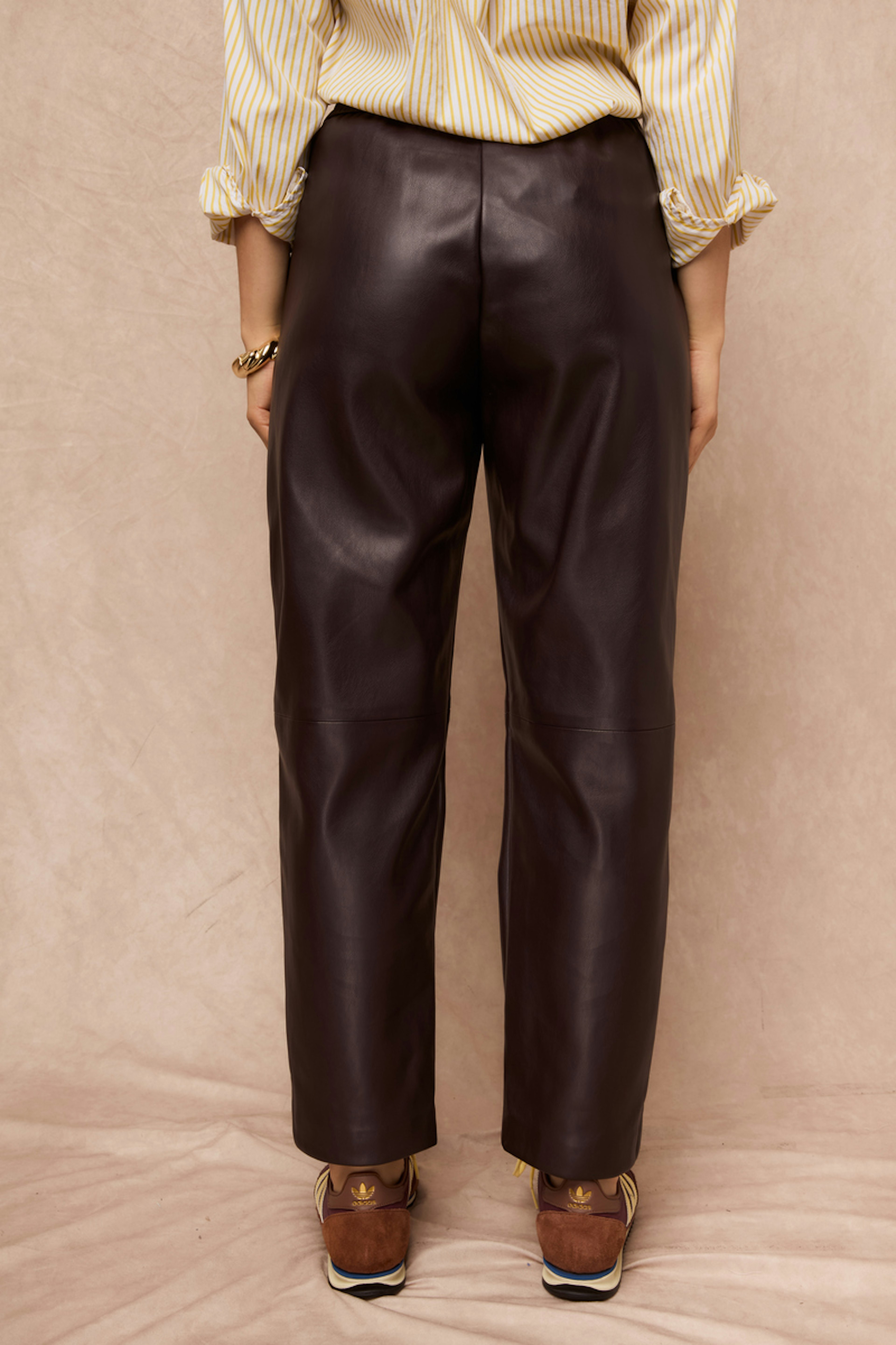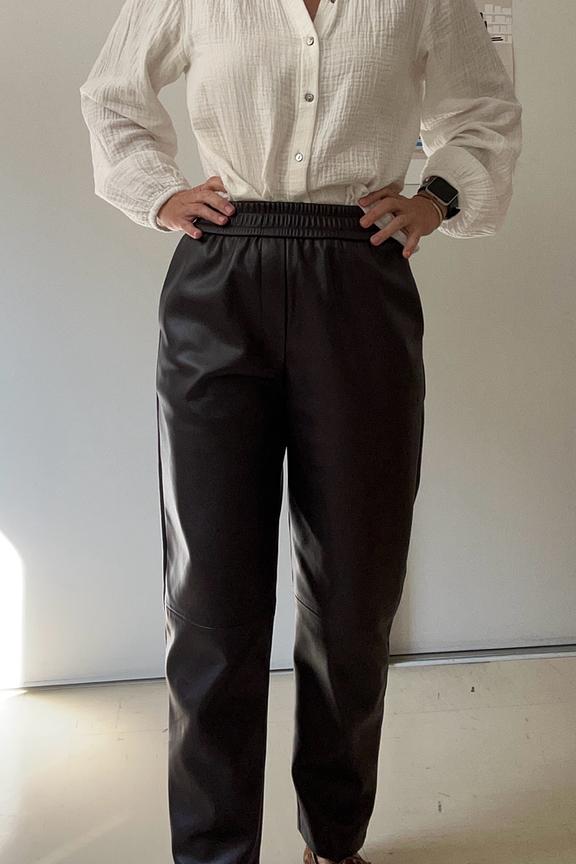 Associez ce pantalon avec un pull en cachemire doux et des bottines pour un style élégant et confortable. • Pantalon à coupe confortable • Taille élastiquée pour l'aisance • Jambes droites pour une allure moderne • Imitation cuir pour un look chic • Couleur marron chic et polyvalente