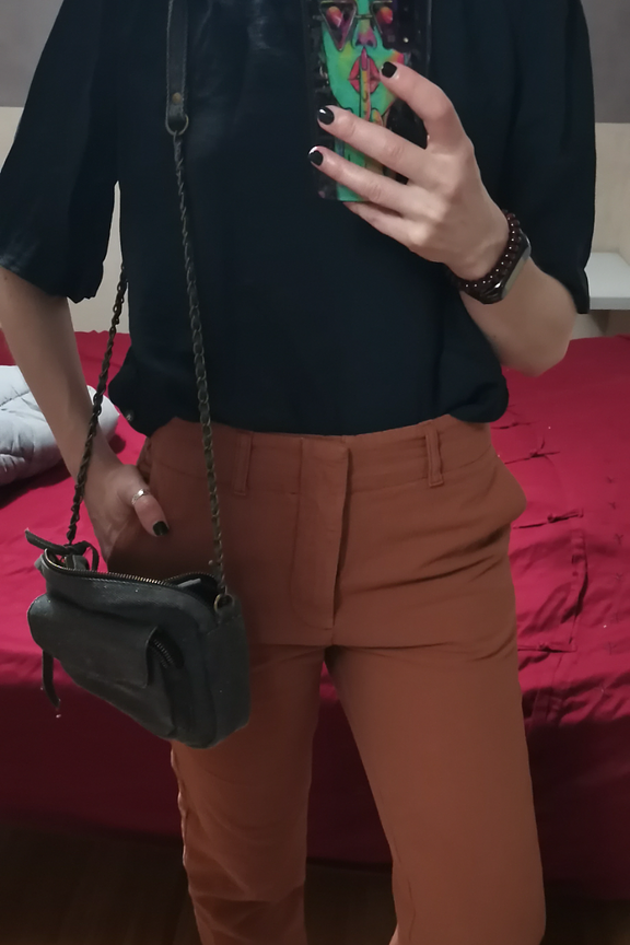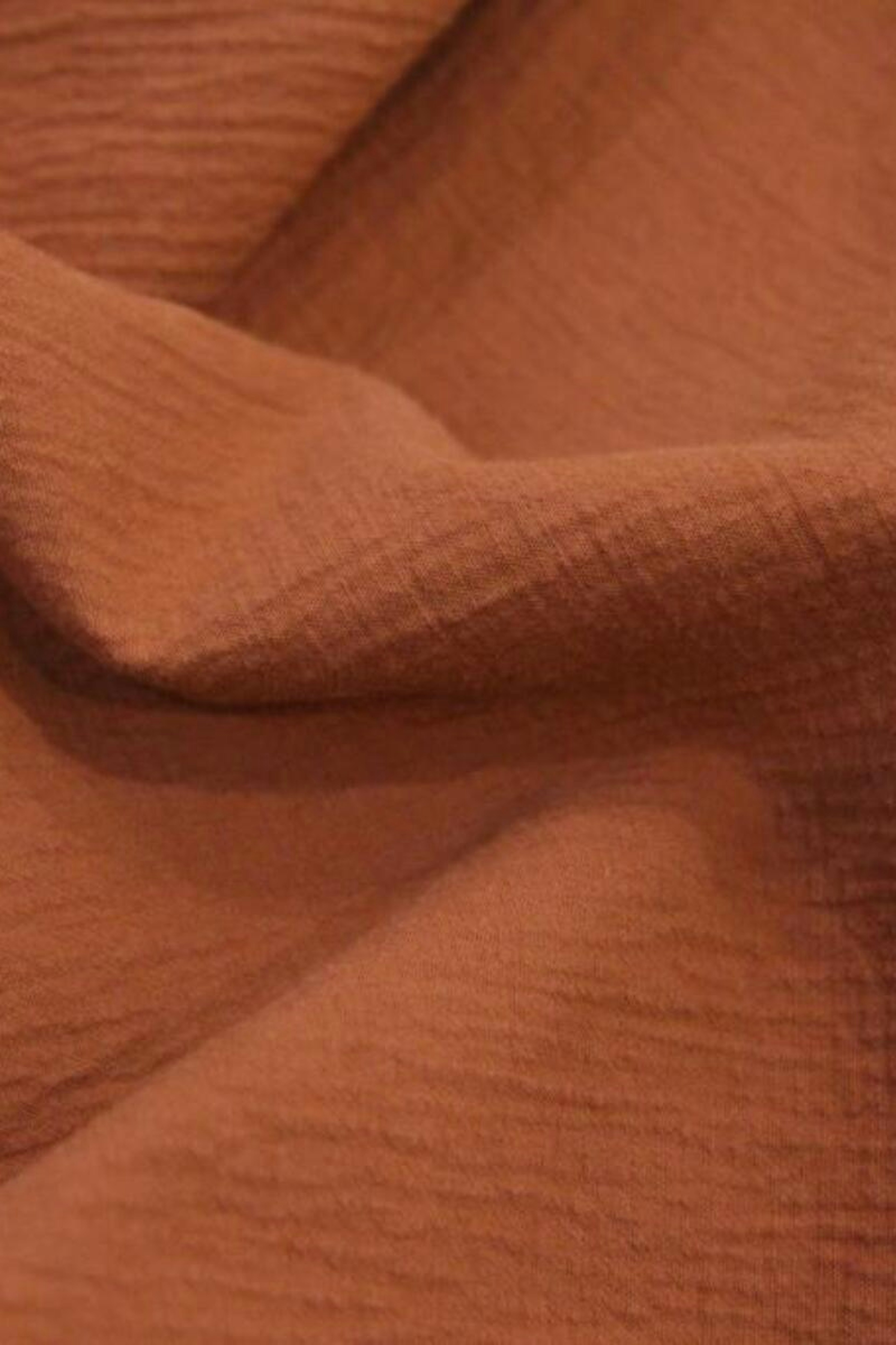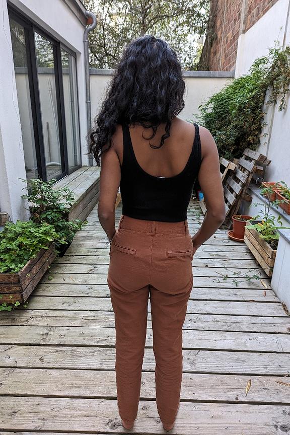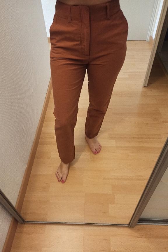 โข Pantalon en gaz de coton marron โข Coupe droite โข Taille haute โข Passants de ceinture โข Poches arriรจre, poches latรฉrales