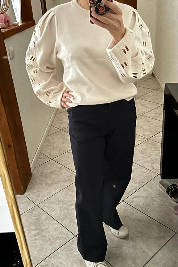 “Bonne longueur, confortable mais beaucoup trop grand à la taille ! Le pantalon tombe littéralement sur les hanches, alors je fais rentrer un pull épais dedans pour que ça tienne sans utiliser de ceinture. Puisque le tissu est souple ça passe sans problème et sans comprimer le ventre. Le tissu est fin donc plutôt adapté à la demi-saison.”