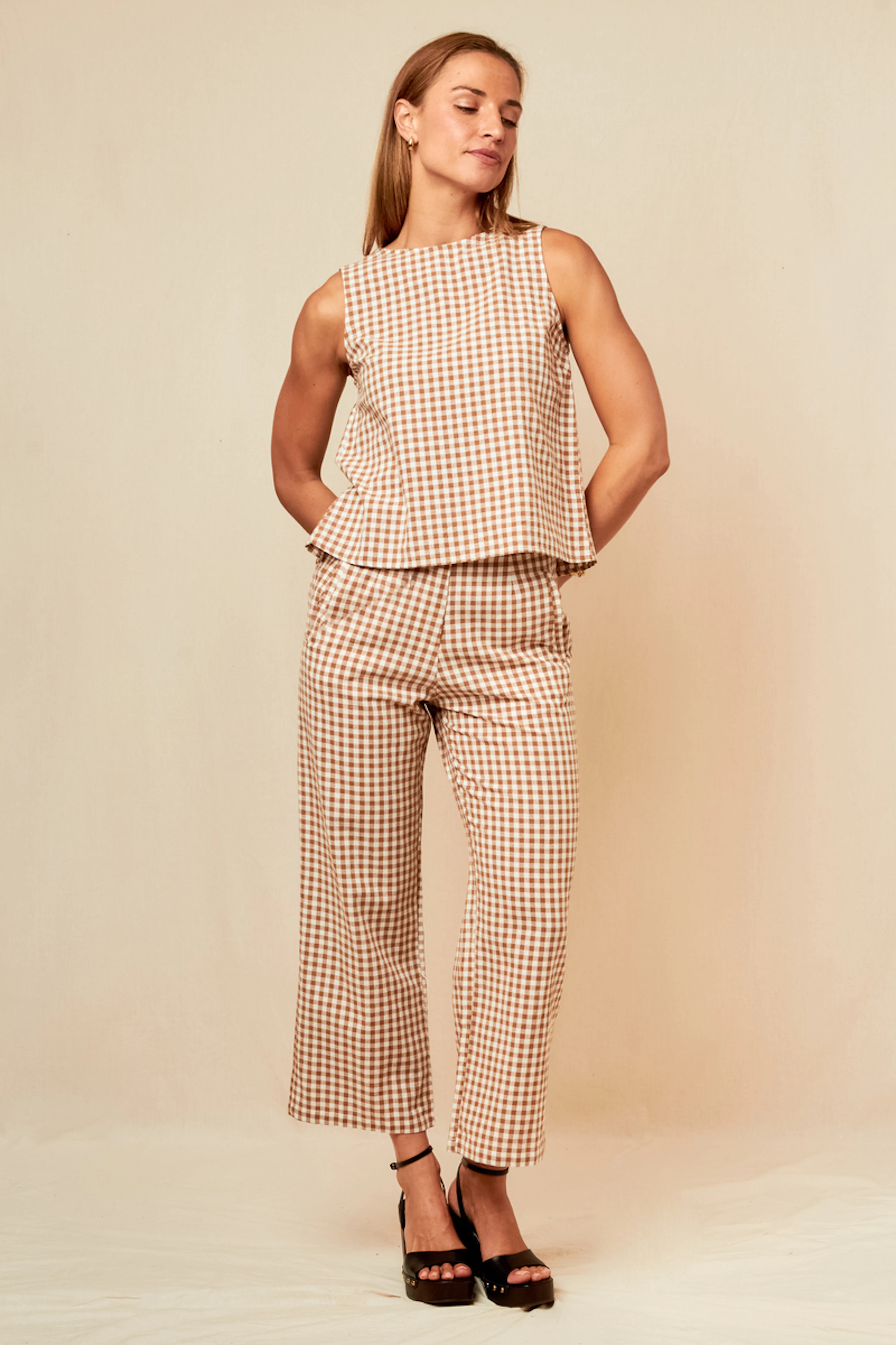 Associez ce pantalon imprimé à un top blanc fluide et des sandales à talons pour une allure chic d'été. • Pantalon en coton • Coupe droite • Taille mi-haute • Longueur cheville • Imprimé à carreaux