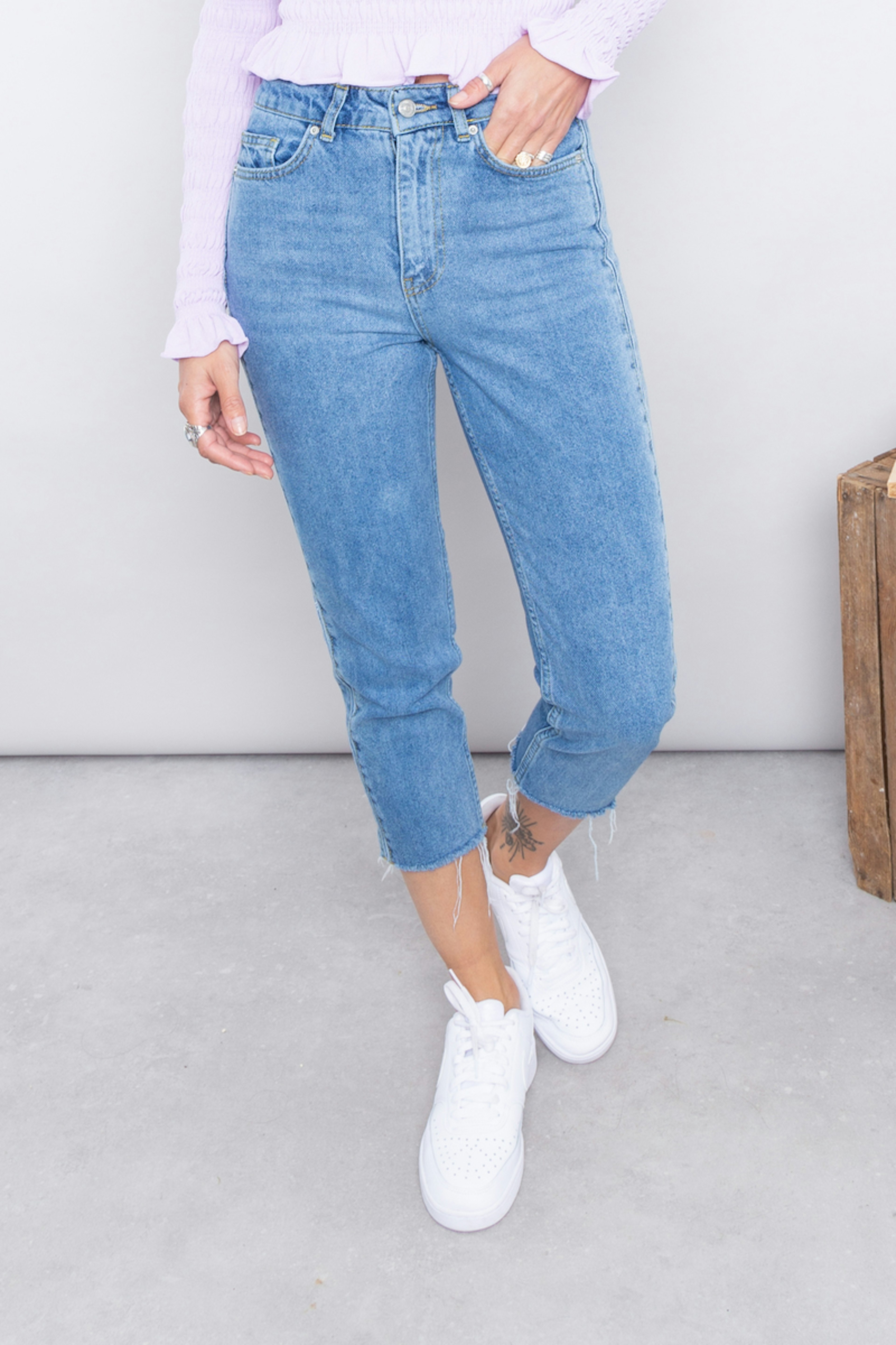 โข Jean cropped en denim clair โข Bandes blanches graphiques sur le cรดtรฉ โข Bord franc โข Coupe slim โข Poches