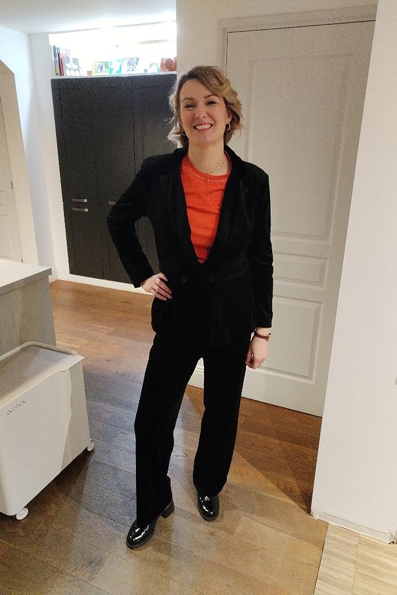 Ajoutez une touche de chic à votre tenue en combinant ce pantalon avec une veste structurée et des chaussures à talons ouverts. Parfait pour un look sophistiqué au bureau ou en soirée. • Pantalon en velours lisse • Coupe straight fit élégante • Taille mi-haute flatteuse • Passants de ceinture pratiques • Fermeture à boutons et glissière