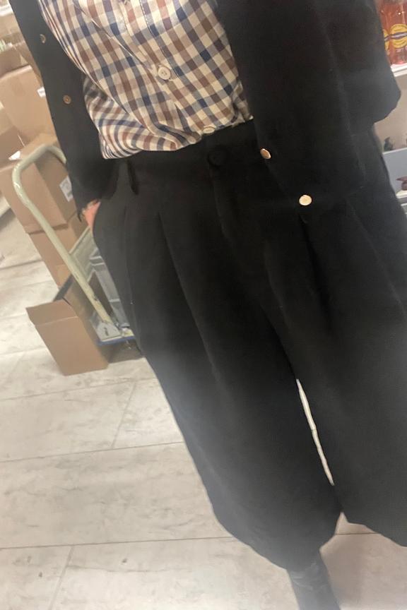 Associez ce pantalon ample avec un pull doux et des bottines en cuir pour une allure élégante et confortable cet hiver. • Pantalon ample • Taille haute plissée • Longueur cheville • Matière mélangée • Couleur noire