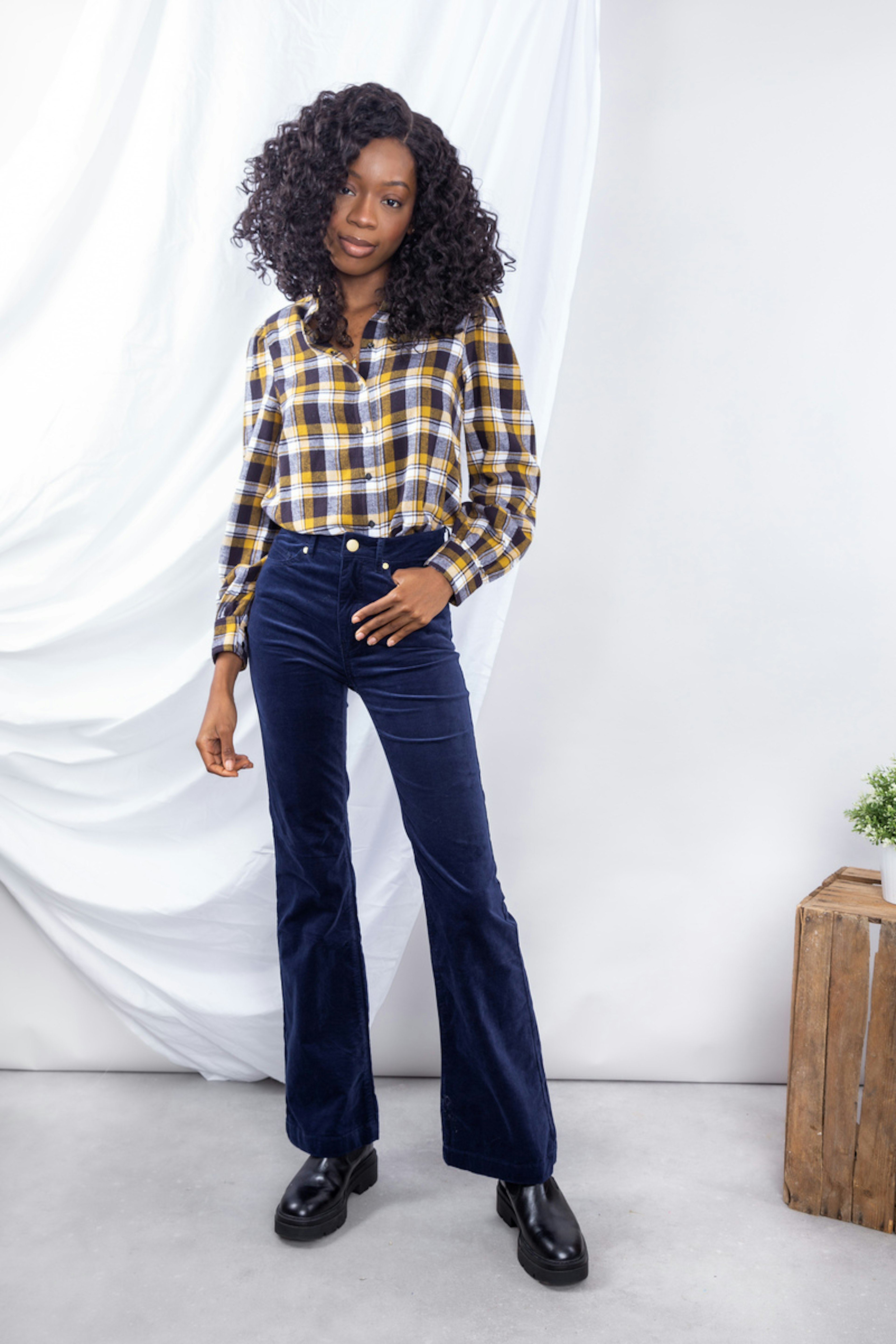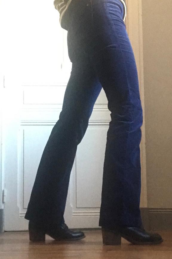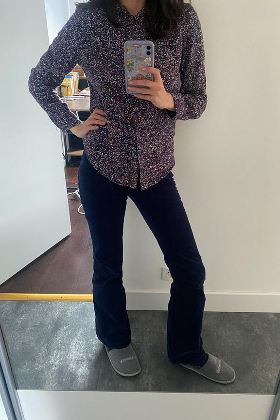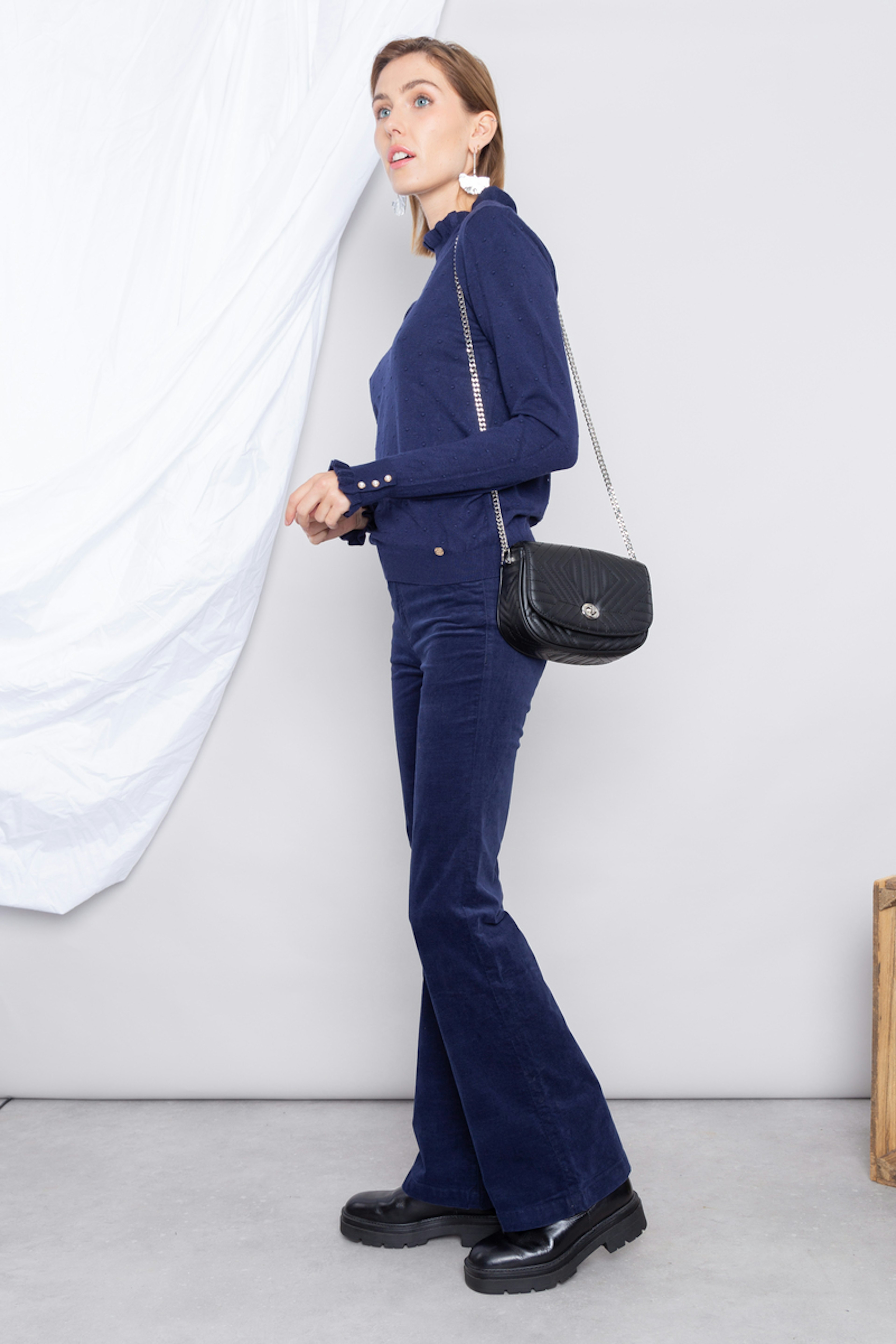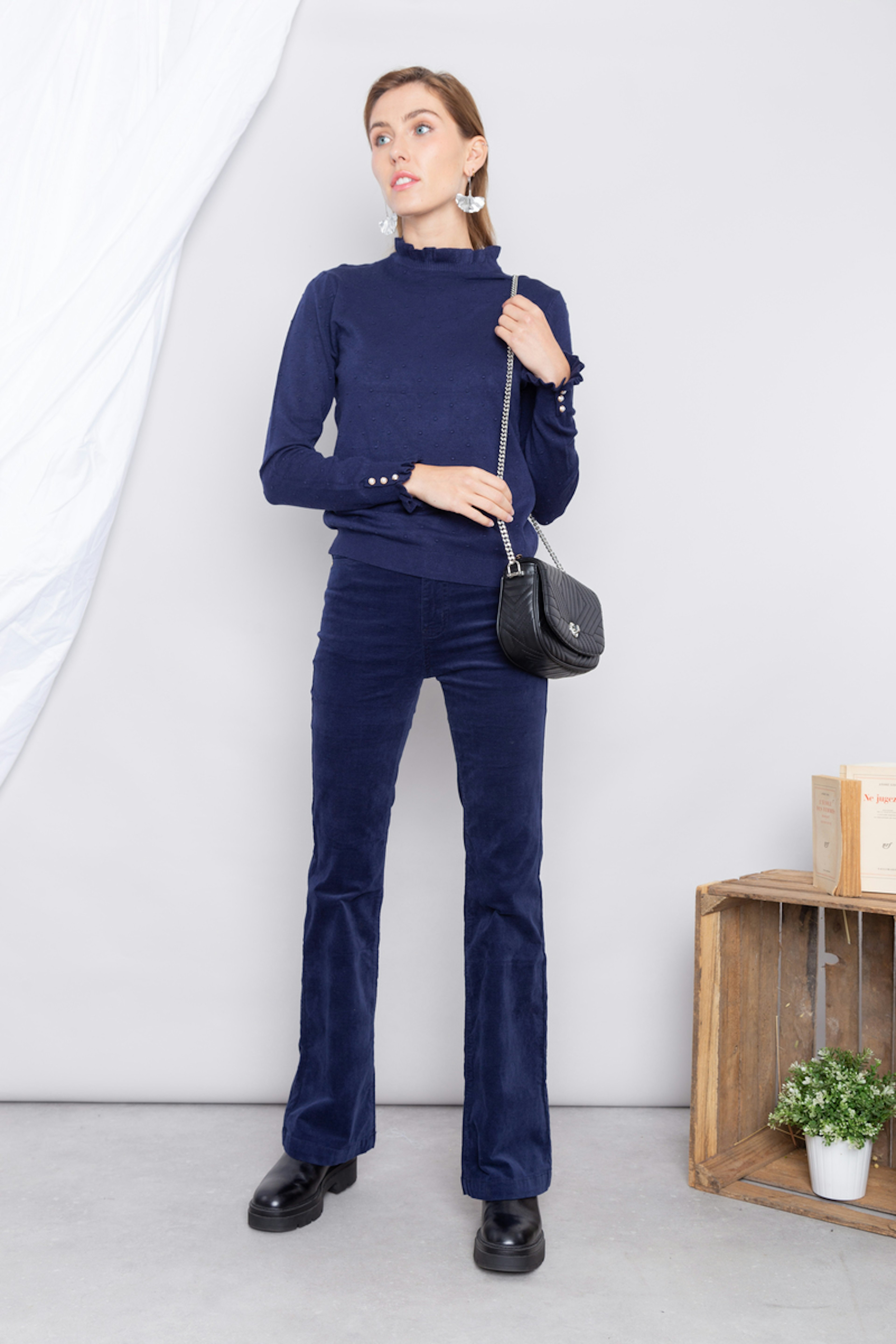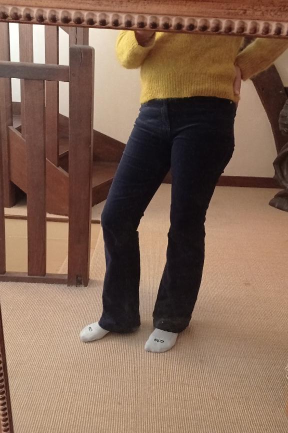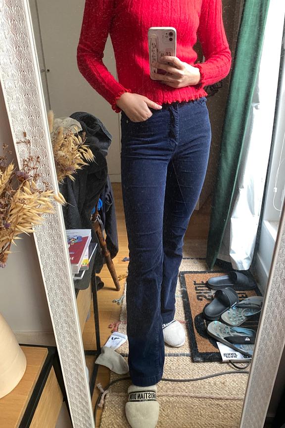 โข Pantalon en velours cรดtelรฉ marine โข Coupe รฉvasรฉe en bas de jambes โข Fausses poches passepoilรฉes sur le devant โข Patte de boutonnage dรฉmarquรฉe avec bouton et zip โข Jacron en cuir ยซ LA PETITE รTOILE ยป โข Passants pour ceinture