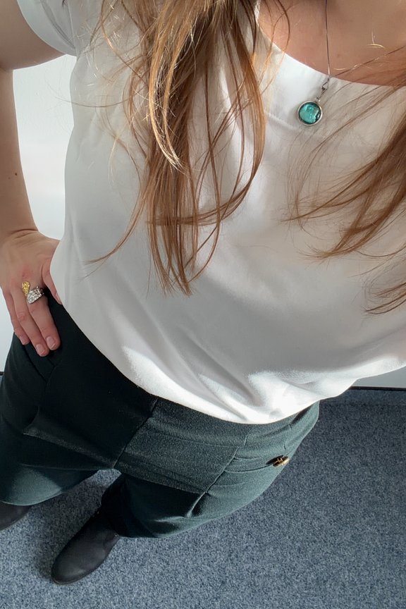 Portez-le avec un pull oversize et des mocassins pour un look chic et relax. Parfait en toute saison. • Pantalon à coupe droite • Taille haute flatteuse • Ourlets retroussés • Poches à boutons dorés • Tissu doux et élégant