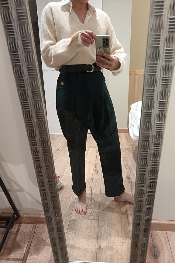 Portez-le avec un pull oversize et des mocassins pour un look chic et relax. Parfait en toute saison. • Pantalon à coupe droite • Taille haute flatteuse • Ourlets retroussés • Poches à boutons dorés • Tissu doux et élégant