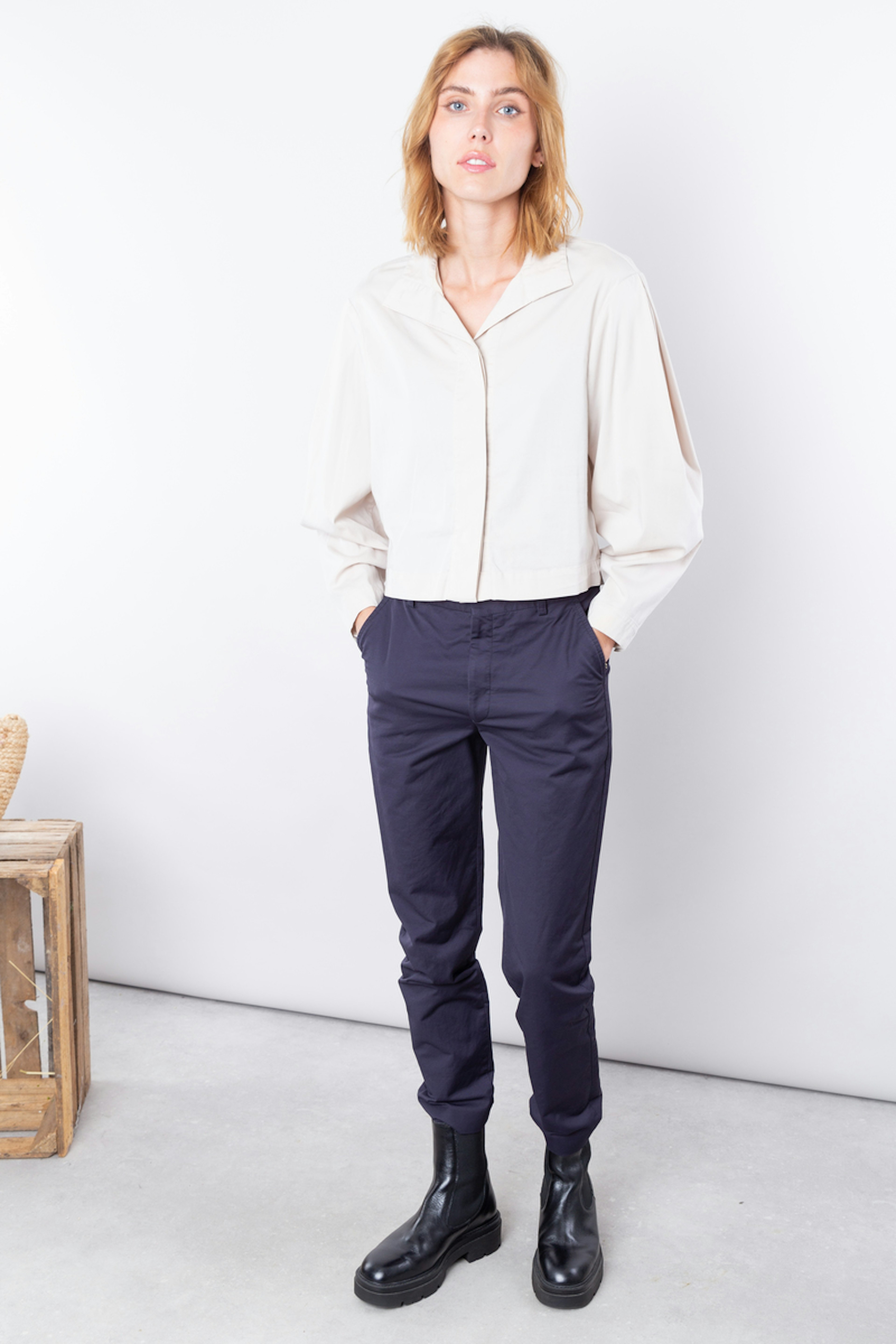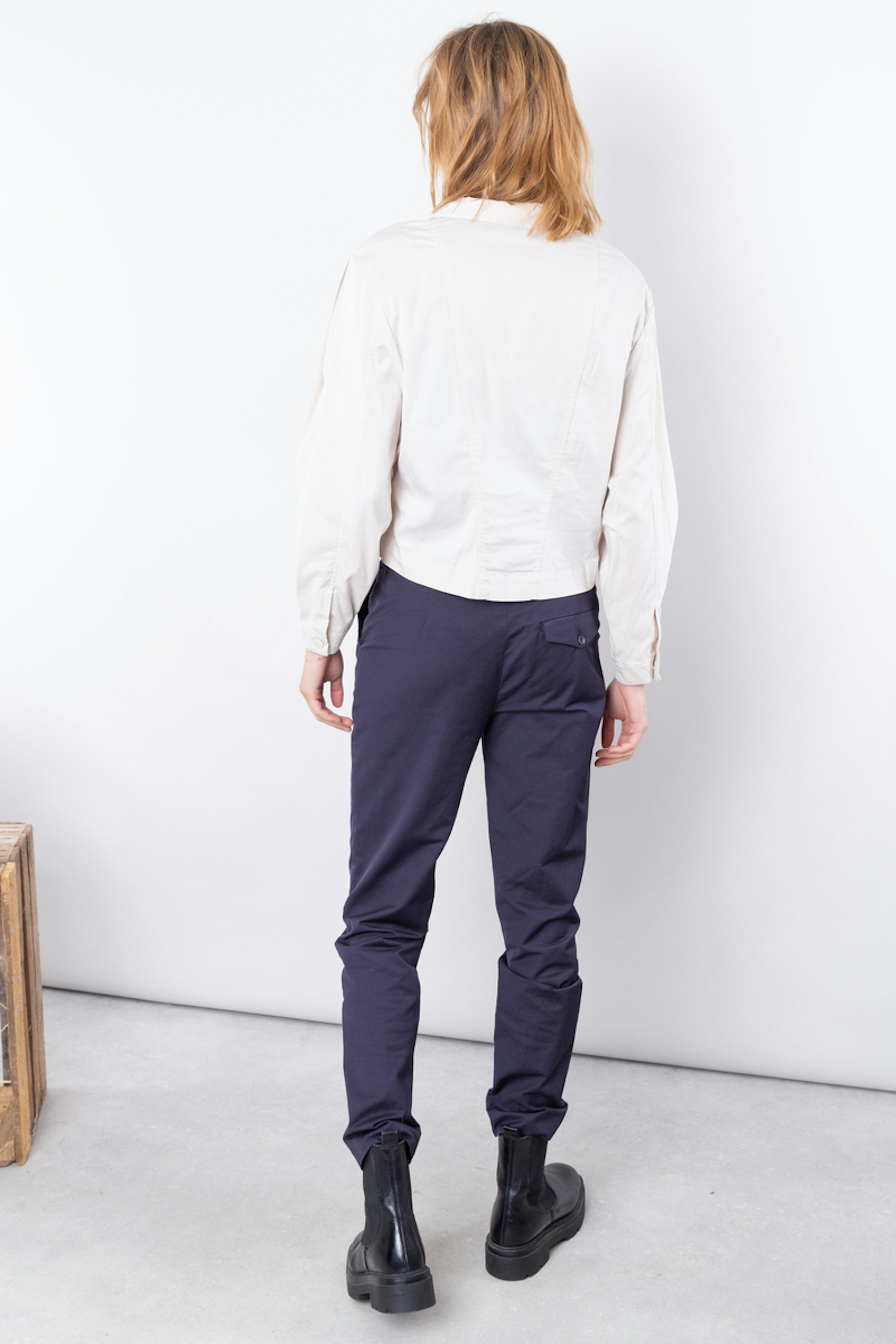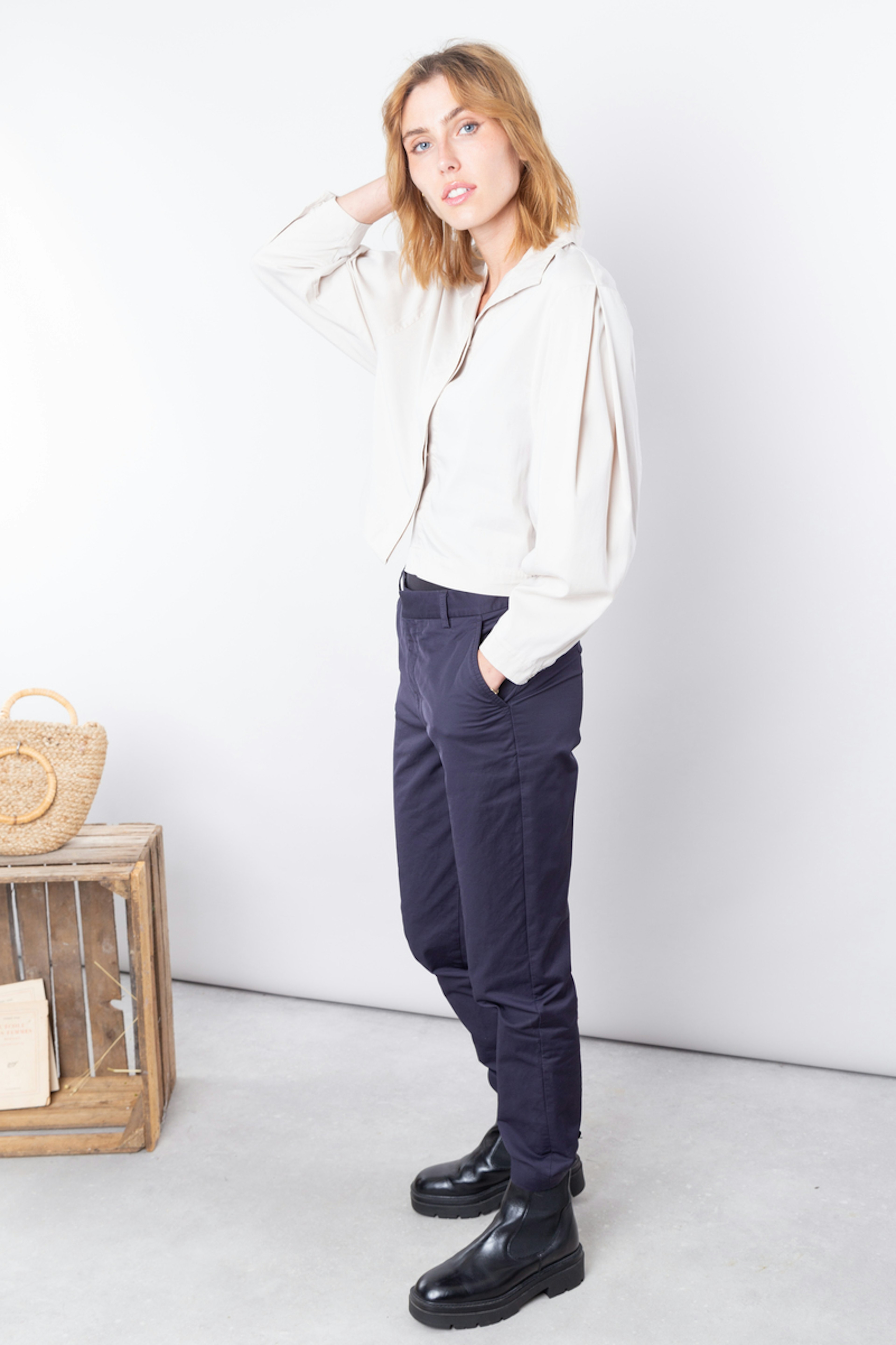 โข Pantalon bleu marine โข Coupe droite โข Poches ouvertes โข Boutons agrafes et zip โข Passants de ceinture