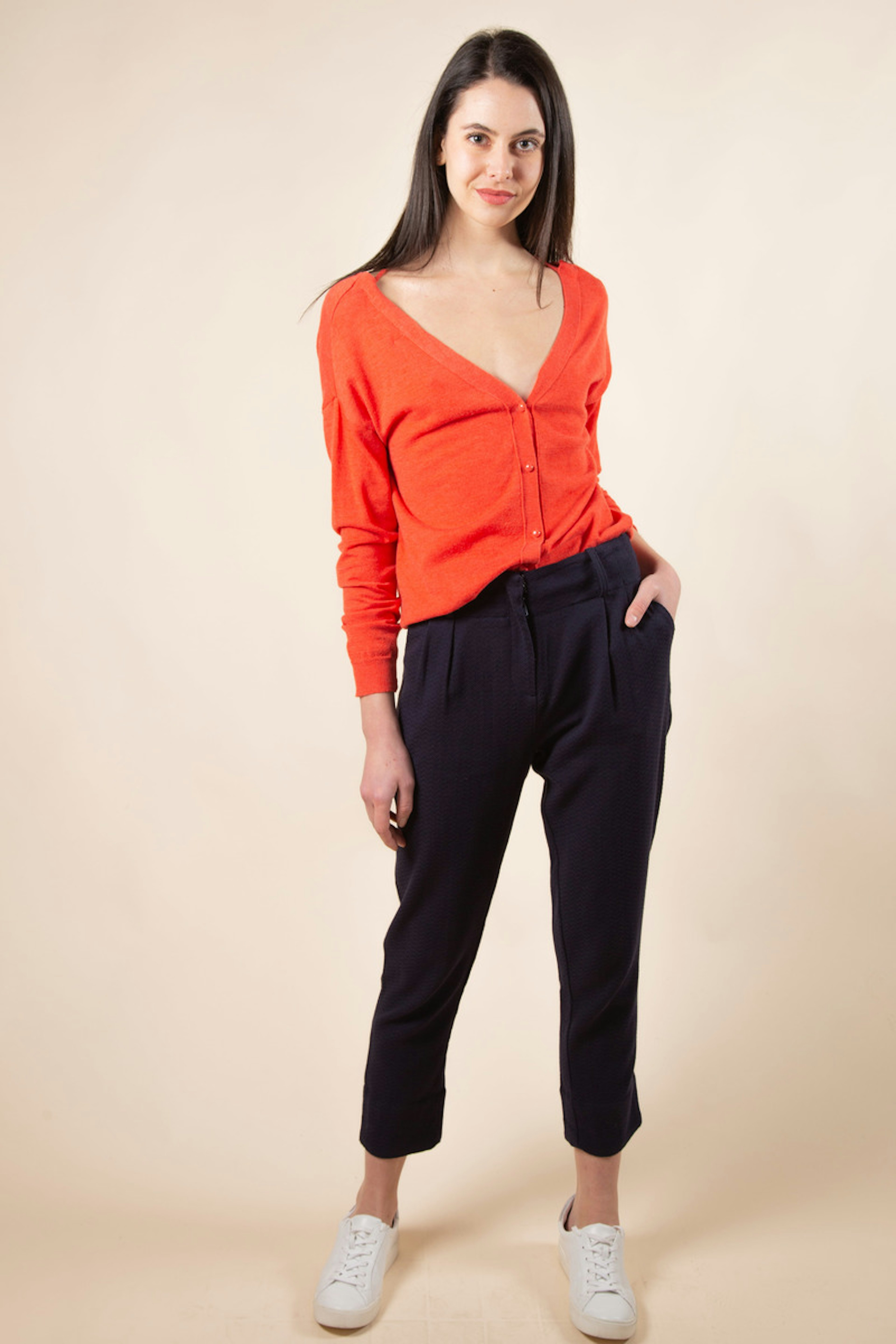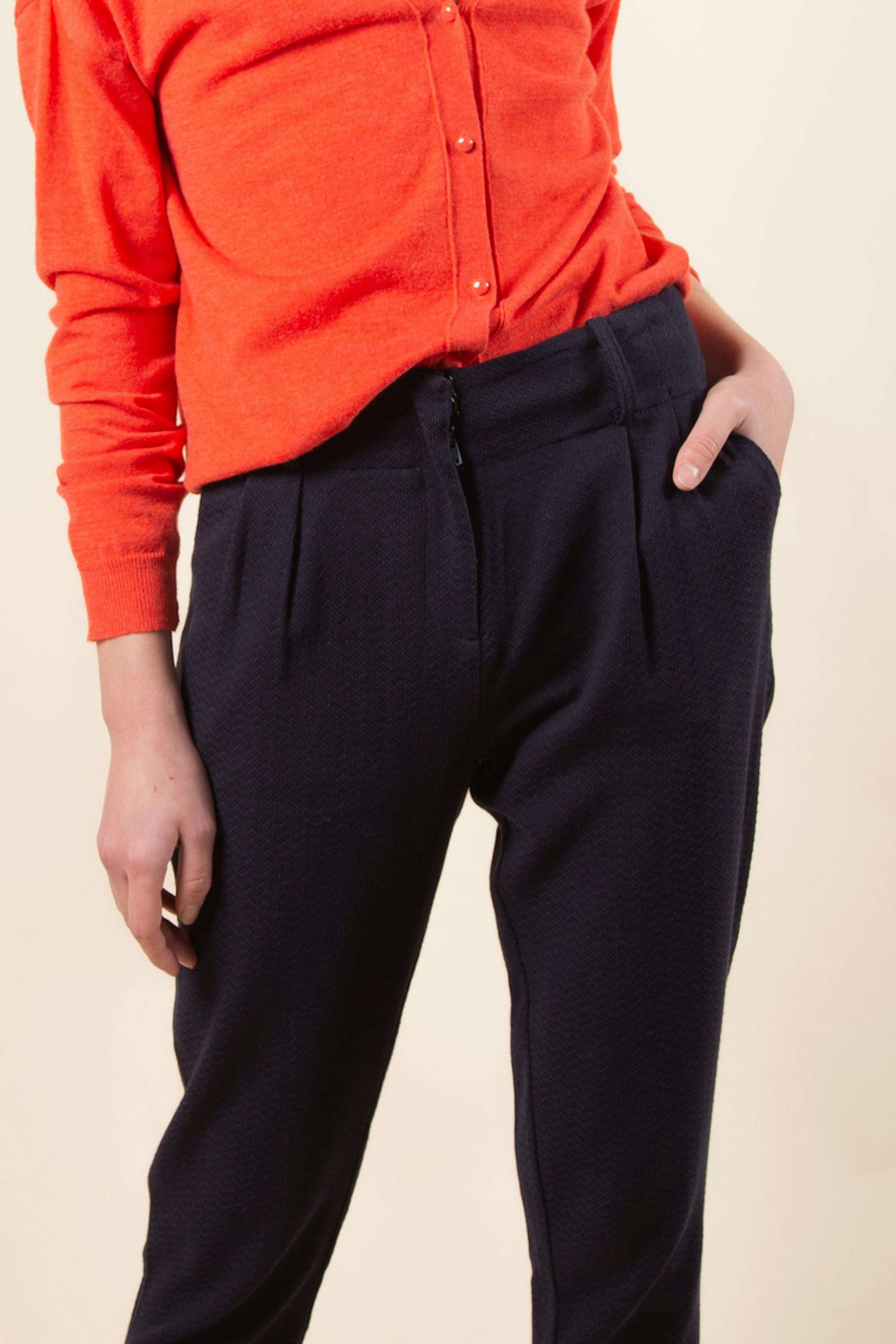 Pantalon tailleur รก taille mi-haute, coupe carotte.