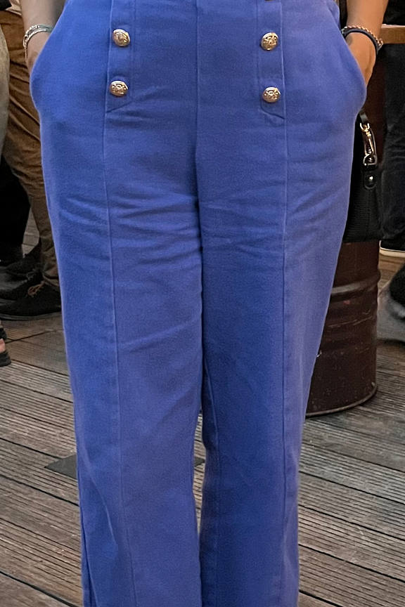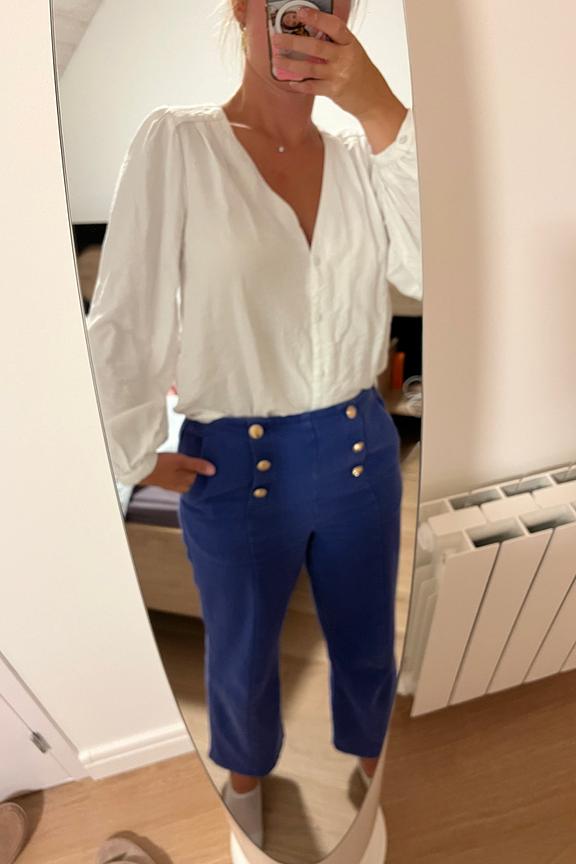 โข Pantalon bleu pimpant โข Jambes 7/8 larges โข Taille resserrรฉe โข Dรฉtails de boutons dorรฉs sur la taille โข Poches latรฉrales โข Coupe flare