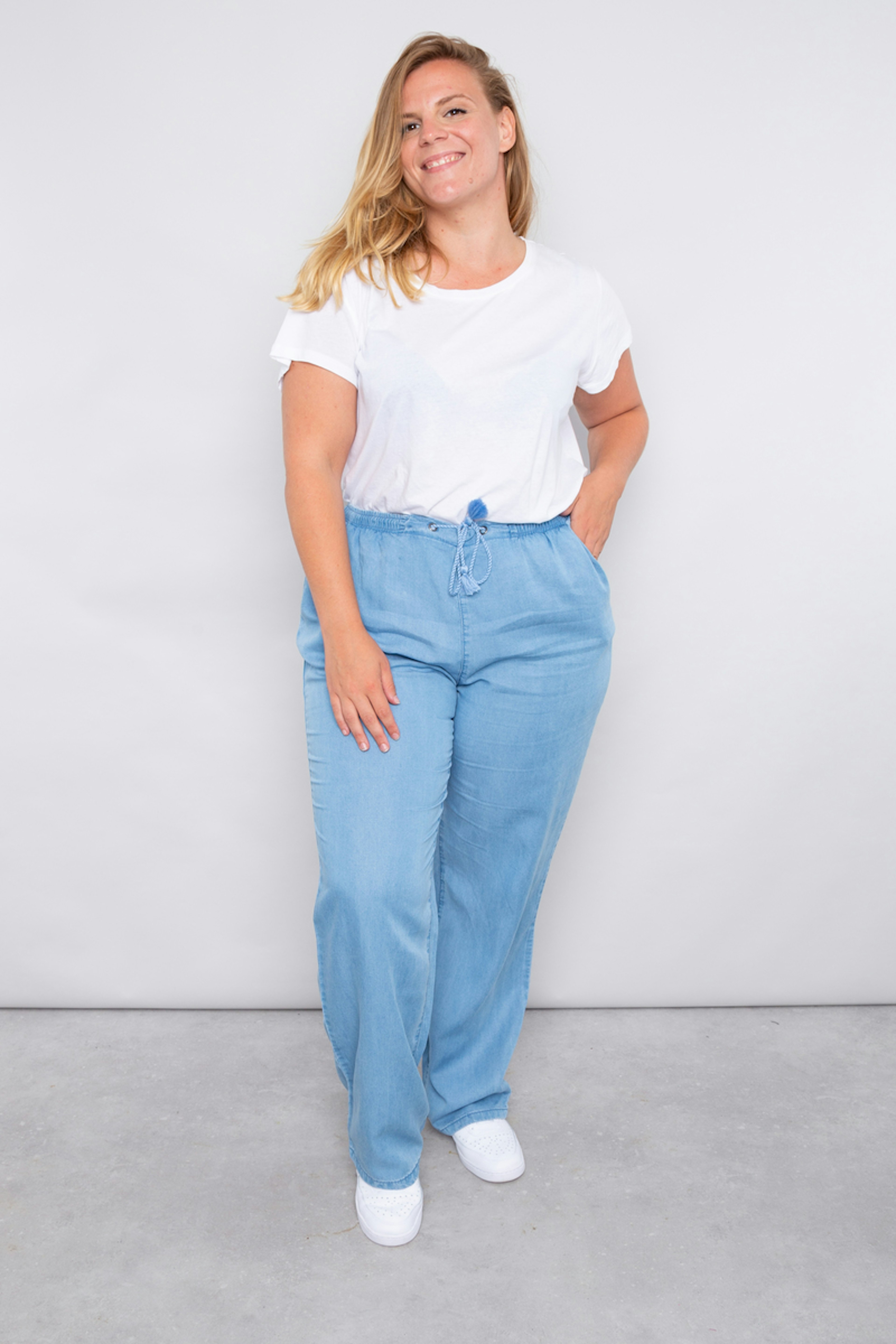 โข Pantalon d'รฉtรฉ fluide en tencel โข Taille รฉlastiquรฉe โข Ceinture fantaisie avec pompons โข Poches