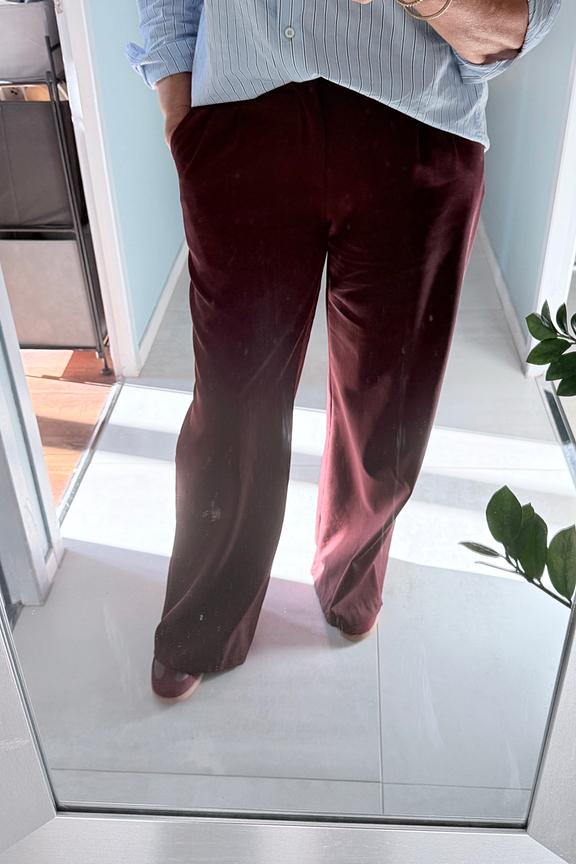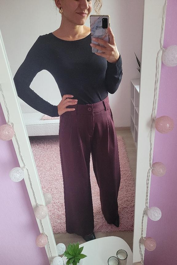 Associez ce pantalon avec un pull en cachemire crème pour un look chic d'hiver. Ajoutez des bottines en cuir pour une touche moderne. • Pantalon taille haute • Coupe large et fluide • Jambes longues • Fermeture à bouton • Poches latérales pratiques