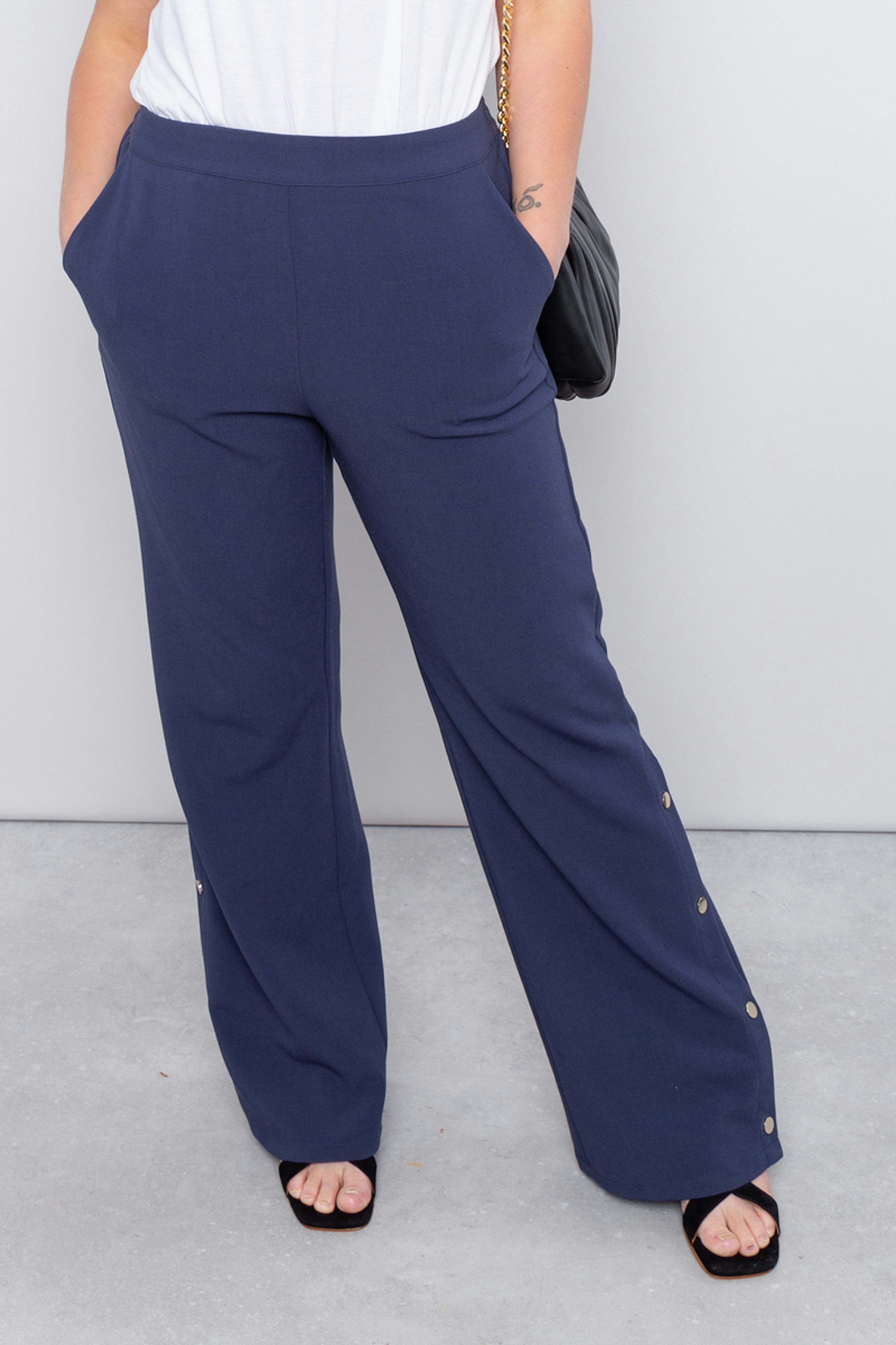 โข Pantalon marine รฉvasรฉ au look moderne โข Boutons en mรฉtal au bas sur le cรดtรฉ โข Jambe รฉvasรฉe โข Ceinture รฉlastiquรฉe โข Poches ouvertes sur les cรดtรฉs โข Jersey confortable