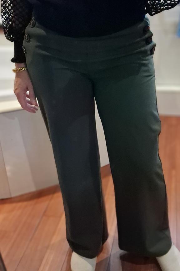 Optez pour un look chic avec ce pantalon kaki. Associez-le à un chemisier fluide et des bottines en cuir pour une allure élégante cet hiver. • Pantalon coupe droite • Taille haute • Jambes larges • Détail boutons sur le côté • Couleur kaki élégante