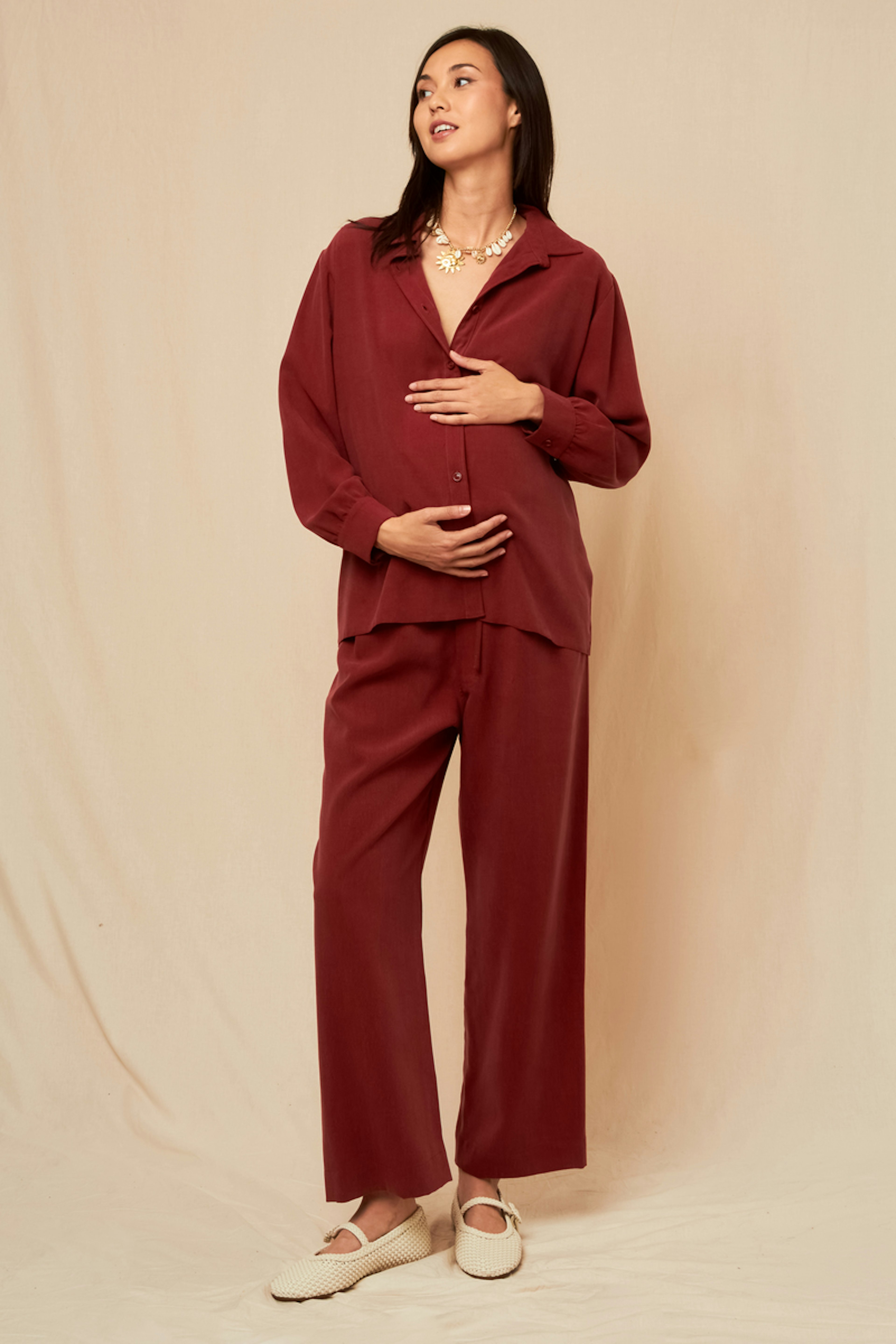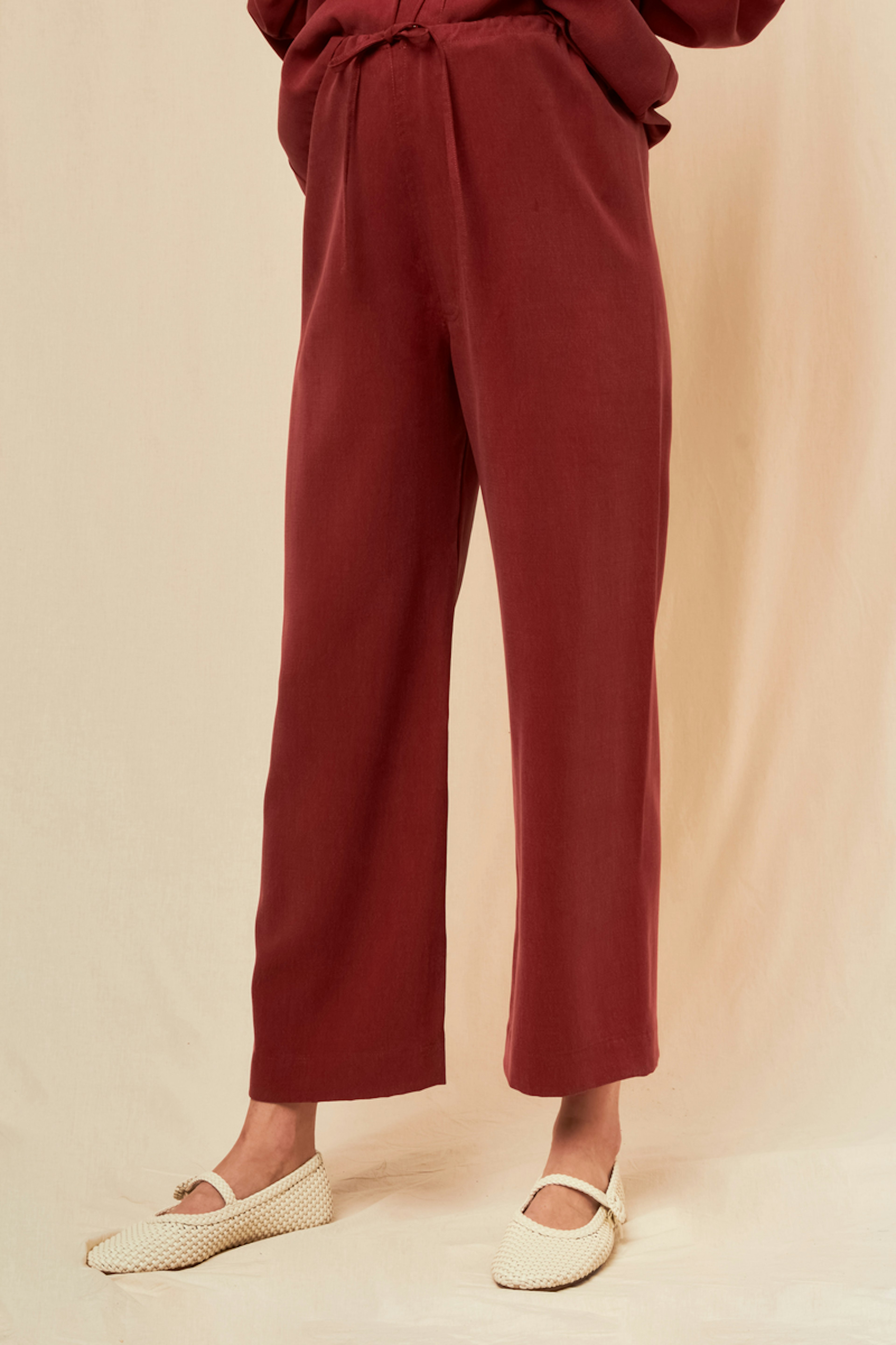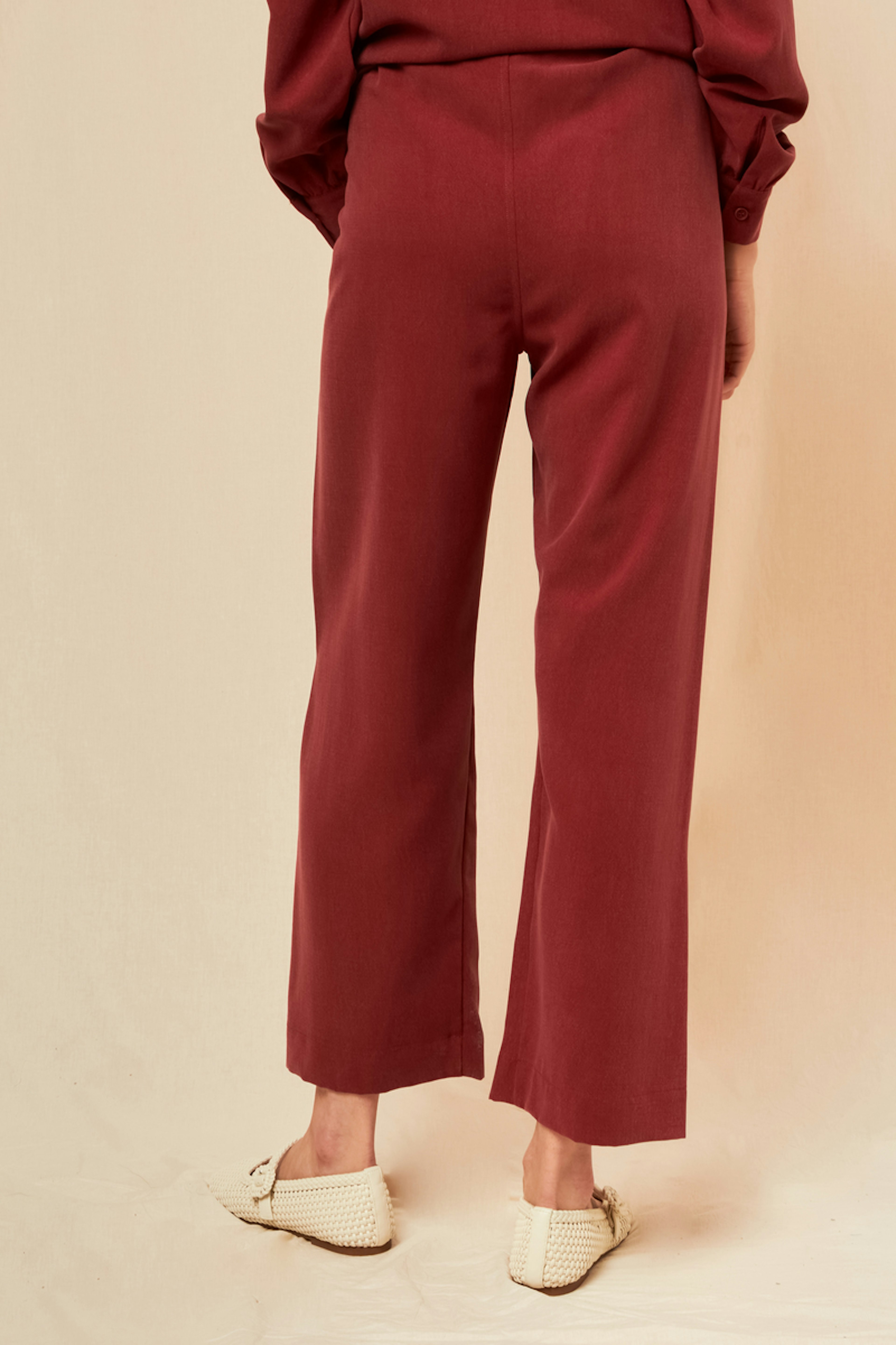 Associez ce pantalon fluide avec un haut léger et des sandales pour un look estival chic. Parfait en toute saison. • Pantalon en laine • Taille haute avec ceinture à nouer • Jambes larges et fluides • Longueur cheville • Couleur rouge élégante