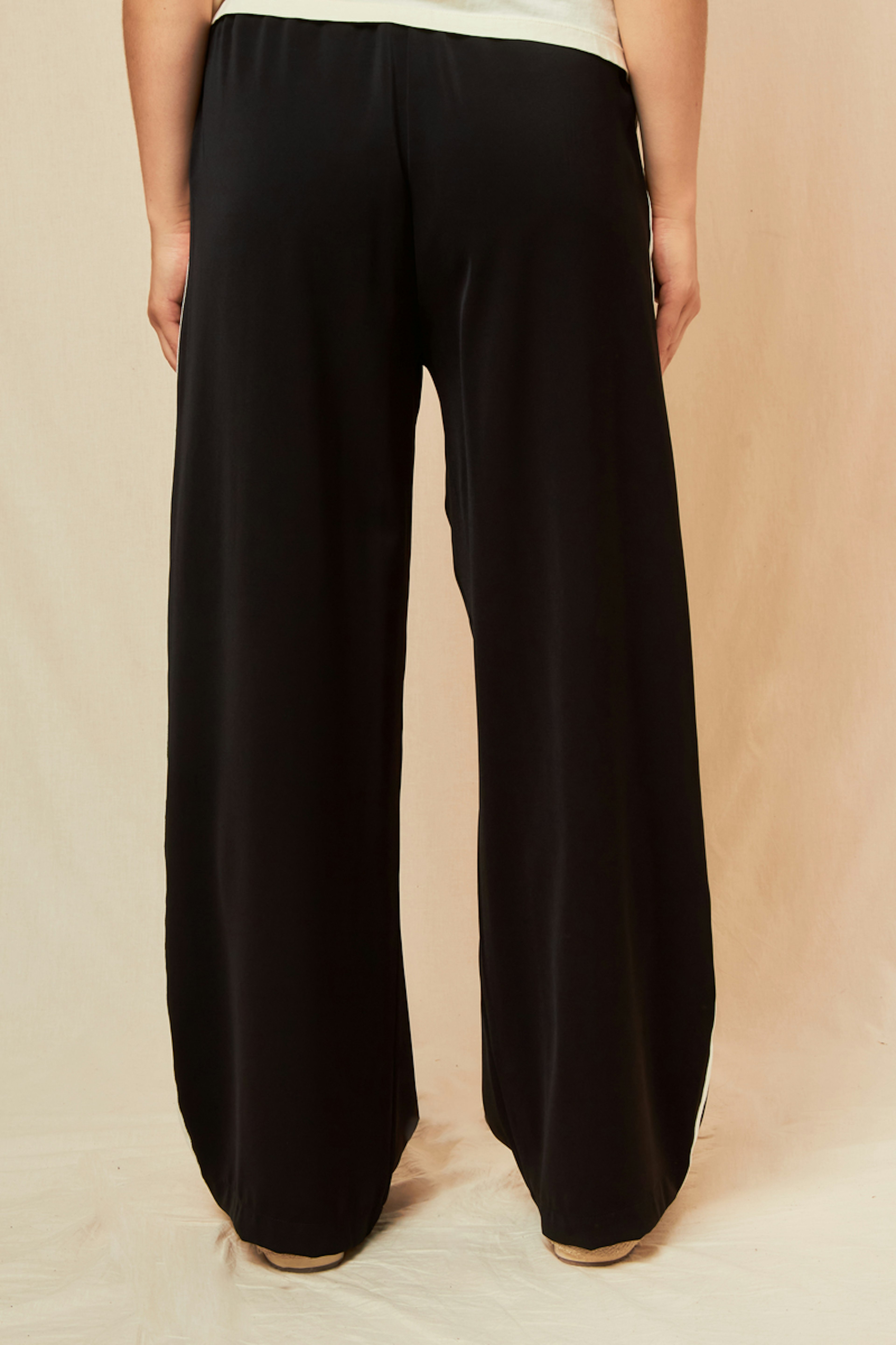 Associez ce pantalon large à un tee shirt clair pour un look confortable. Parfait en toute saison. • Lignes contrastantes blanches sur le côté • Coupe évasée flatteuse • Longueur longue • Conçu pour la maternité