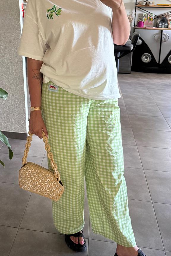 Associez ce pantalon vichy avec un haut blanc et des sandales pour un look estival frais et confortable. • Pantalon en coton • Coupe large • Taille élastiquée et ajustable • Jambes longues • Motif vichy vert et écru