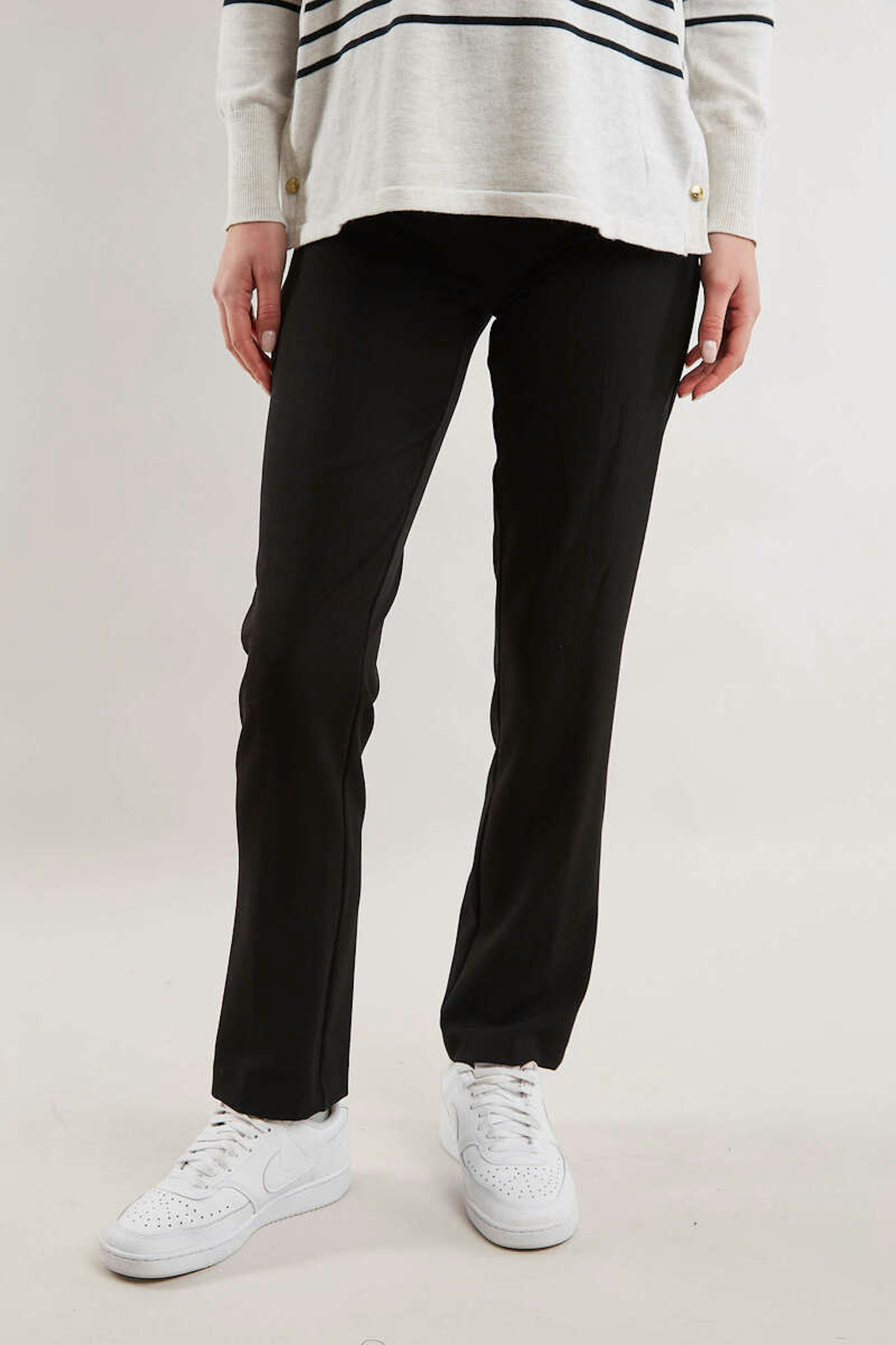 โข Ce pantalon grossesse coupe droite noir est un indispensable pour le bureau โข La coupe droite de ce pantalon allonge vos jambes et les sublime tout en offrant un look professionnel et รฉlรฉgant en toute simplicitรฉ โข ร placer au-dessus du ventre, il ne descend pas et vous rendra รฉblouissante avant, pendant et aprรจs votre grossesse โข Portez-le avec un chemisier et des escarpins pour un look impeccable au travail ! โข La Bande: 95% Viscose, 5% รlasthanne โข Bandeau haut sur le ventre โข Coupe droite โข Pinces sur le devant โข Lรฉger drapรฉ โข Tissu stretch