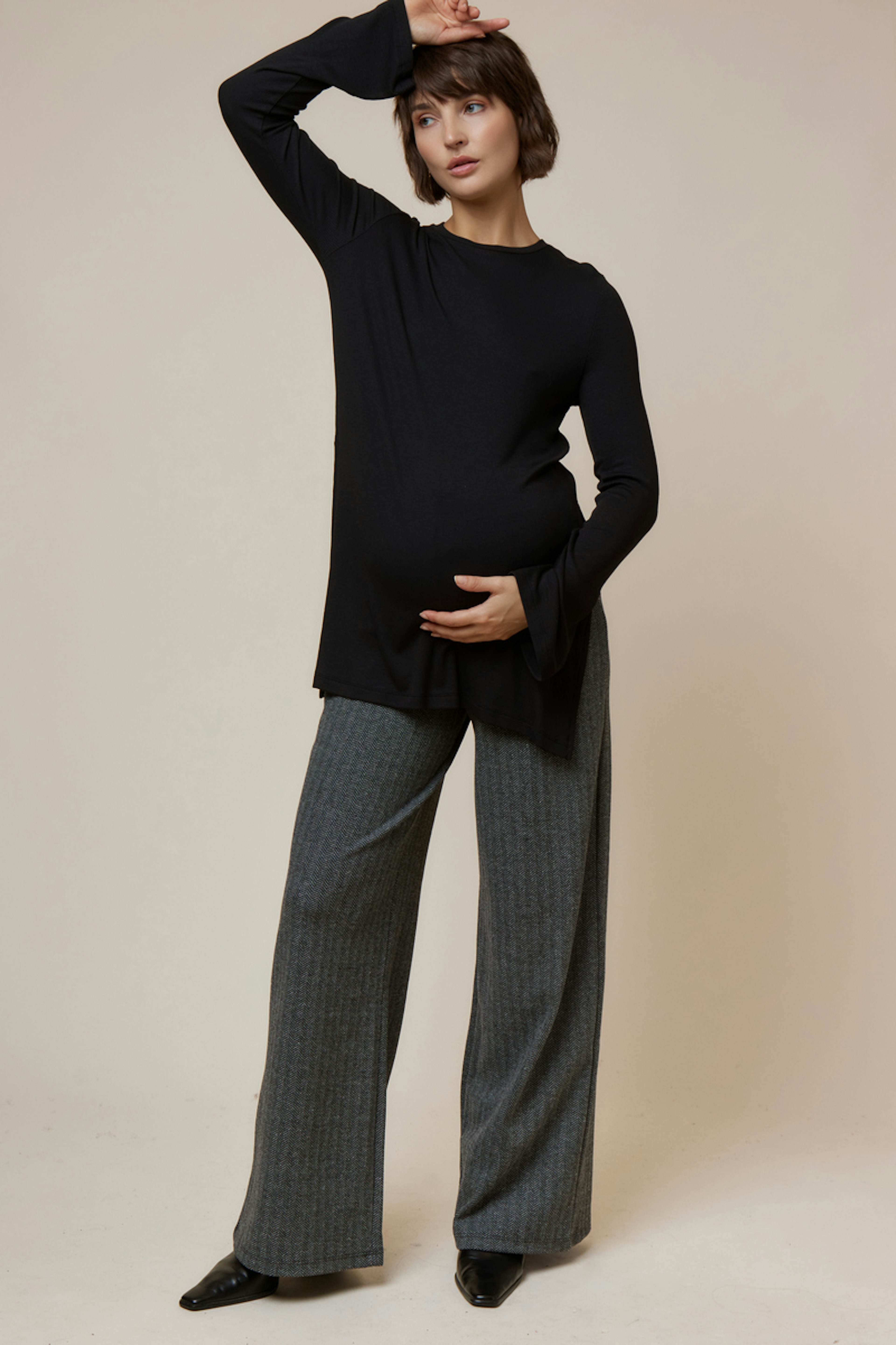 Associez ce pantalon avec un pull en maille douce et des bottines élégantes pour un look chic et confortable, parfait en toute saison. • Pantalon ample • Coupe large • Taille élastiquée • Motif à chevrons • Confort de maternité