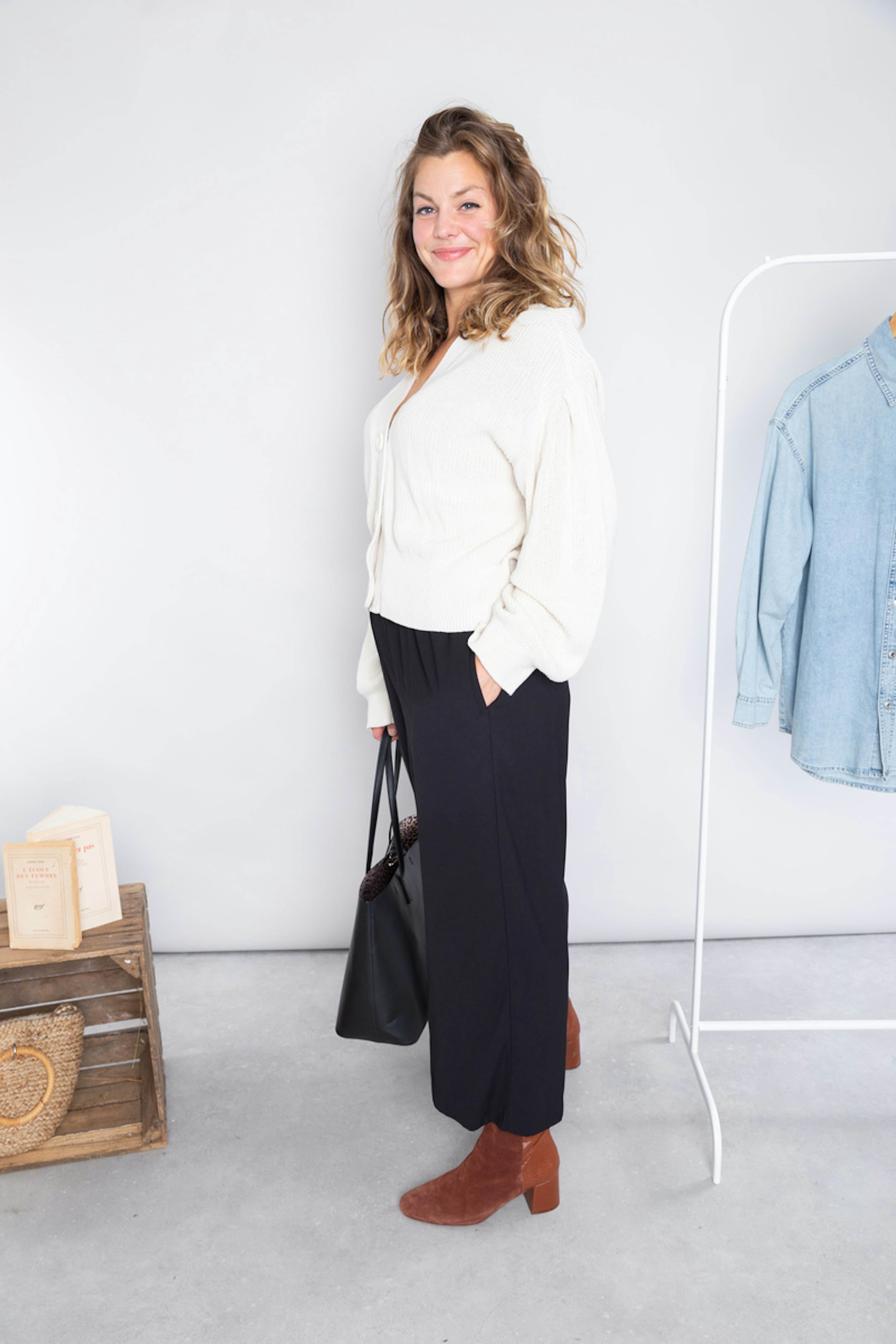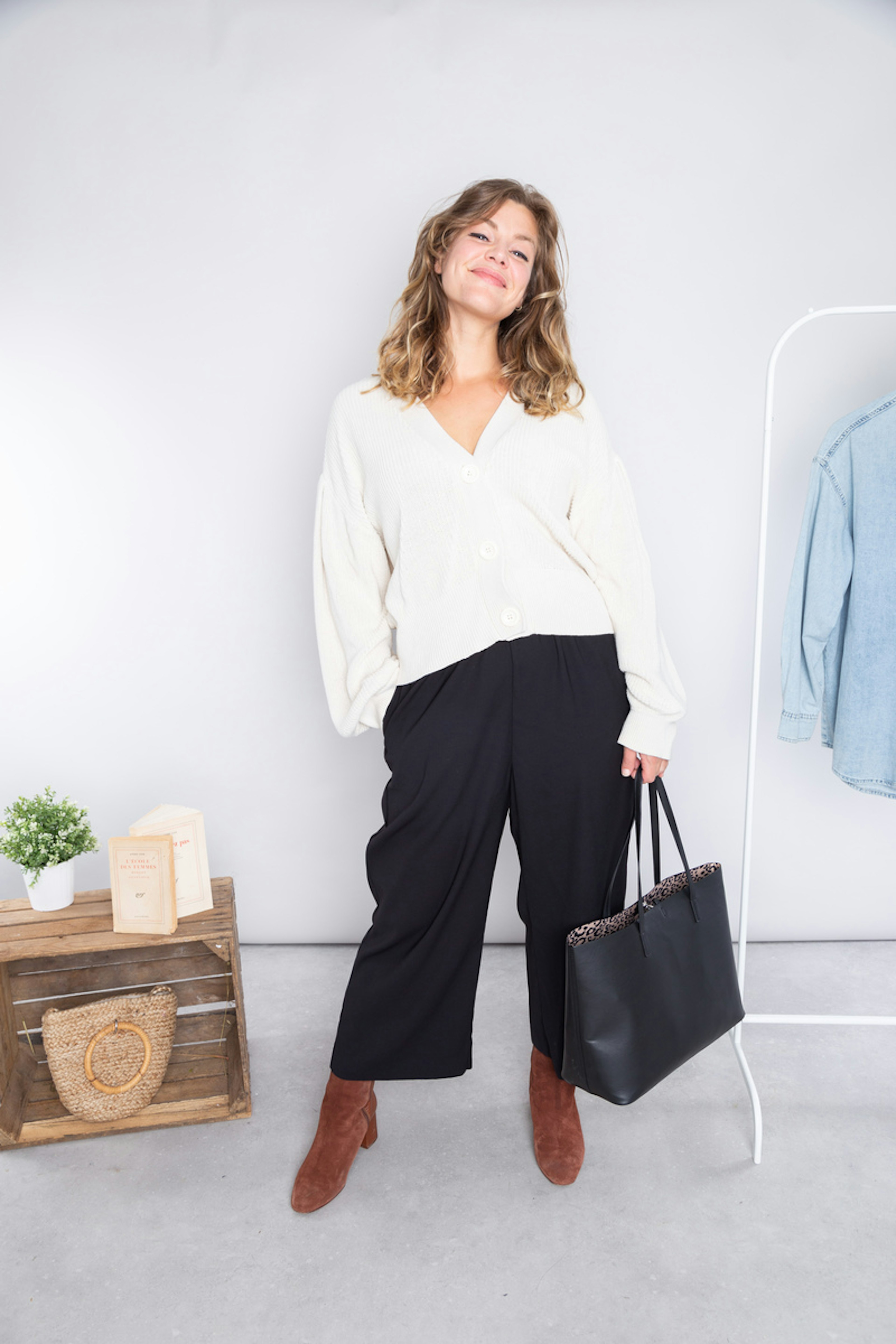 โข Pantalon noir fluide โข Coupe large โข Longueur 7/8 โข Poches