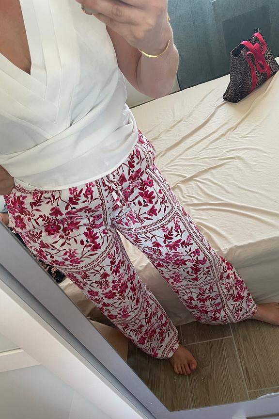 Associez ce pantalon imprimé à un haut uni pour un look estival frais. Ajoutez des sandales dorées pour une touche d'élégance. • Pantalon large • Taille à cordon • Imprimé floral • Jambe ample • Longueur cheville