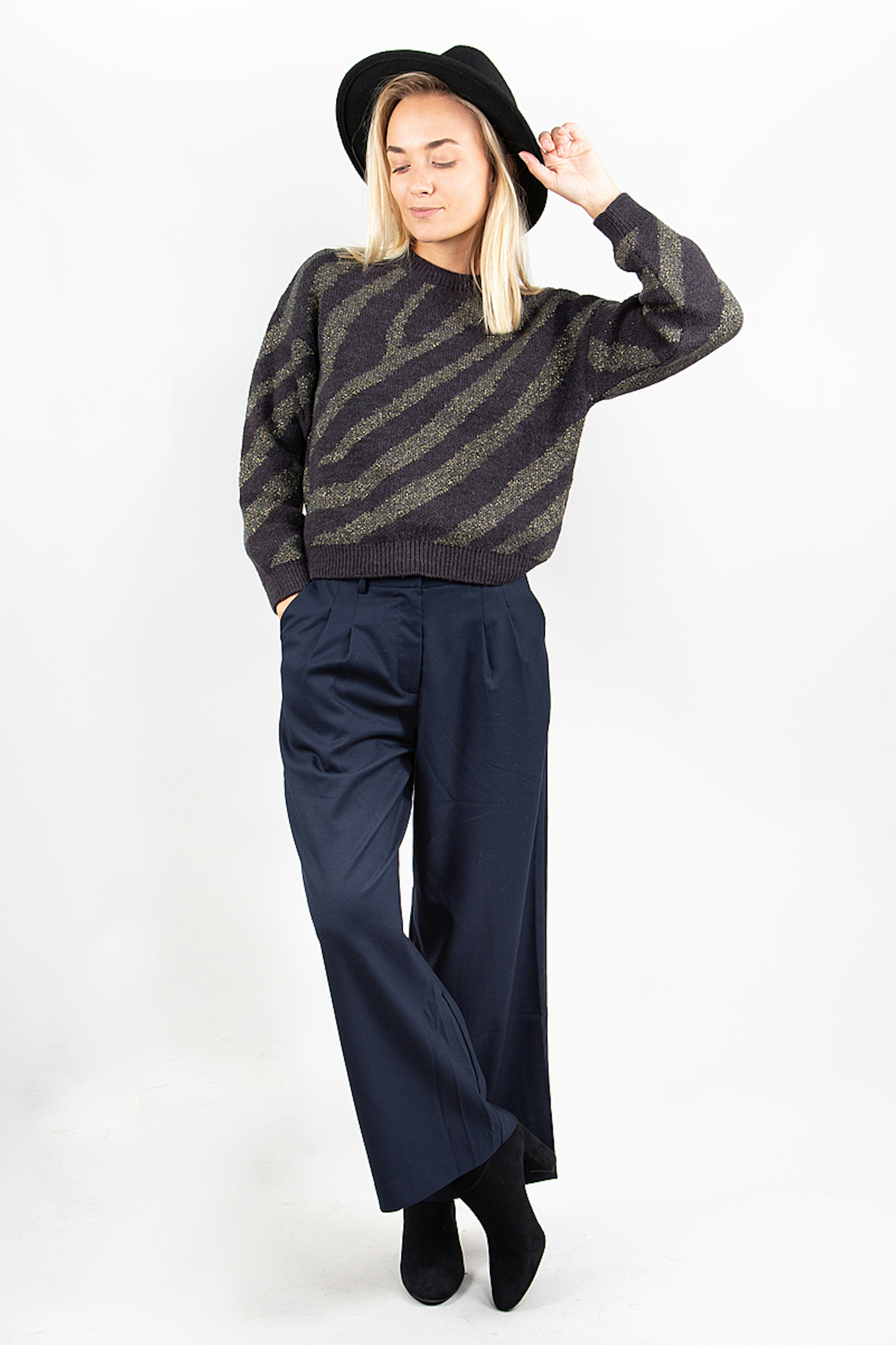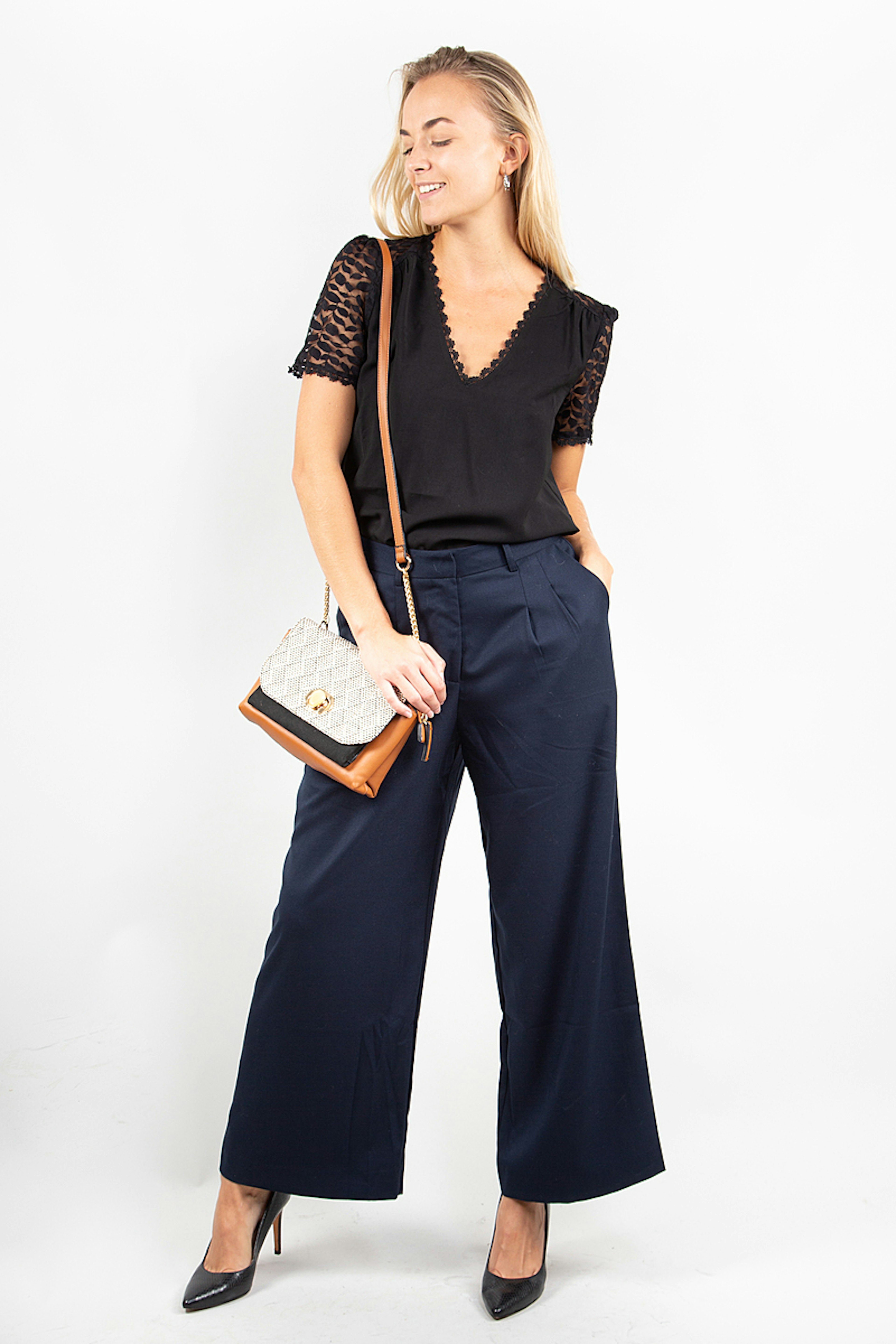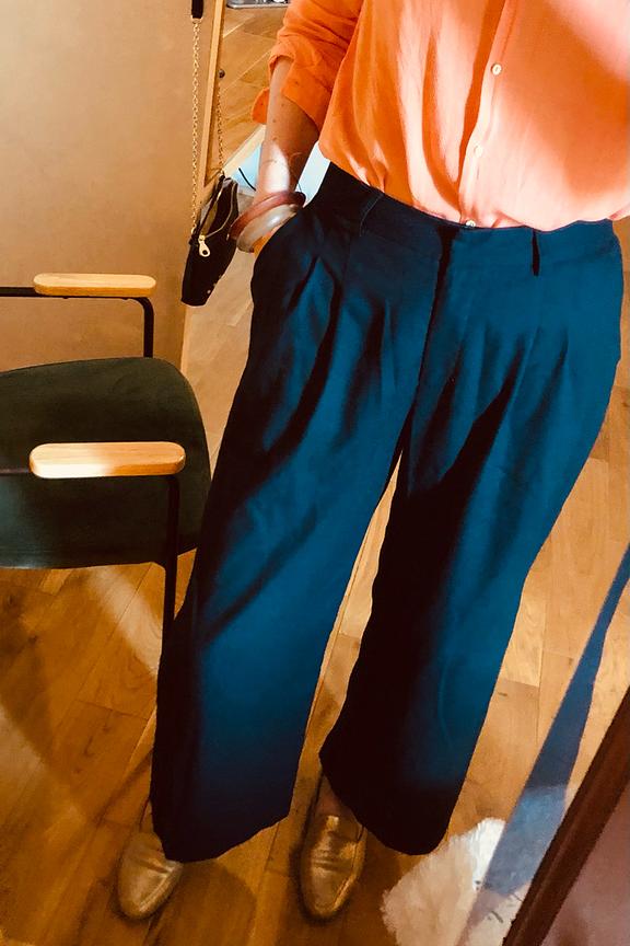 Mirazio est un pantalon ร pinces bleu marine รฉlรฉgant. On l'associe avec un chemisier blanc pour un look working girl chic. โข Pantalon ร pinces bleu marine taille haute coupe droite, รฉvasรฉ aux jambes โข Longueur 7/8รจme โข Passants pour y glisser une ceinture โข Fermeture par crochet et zip
