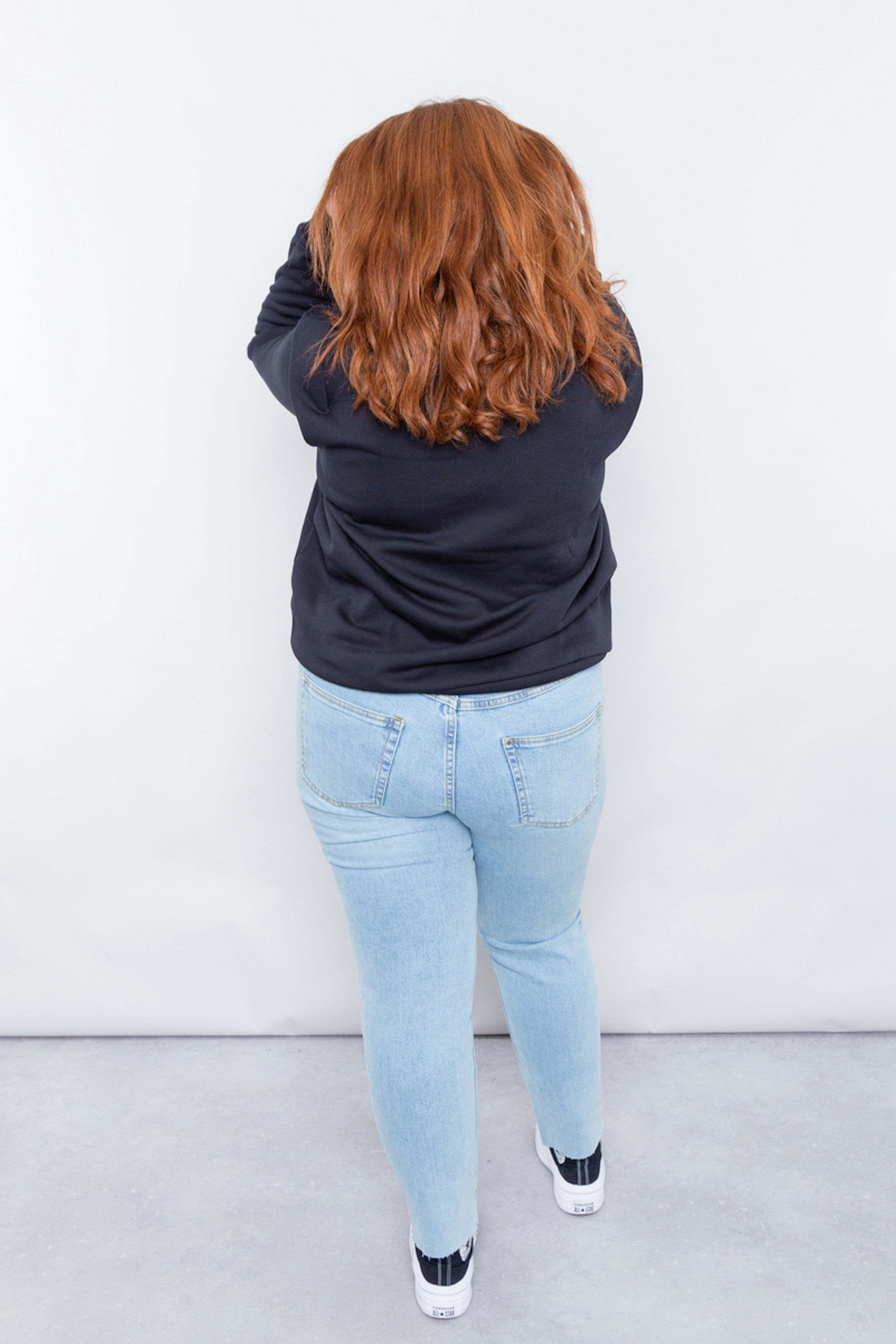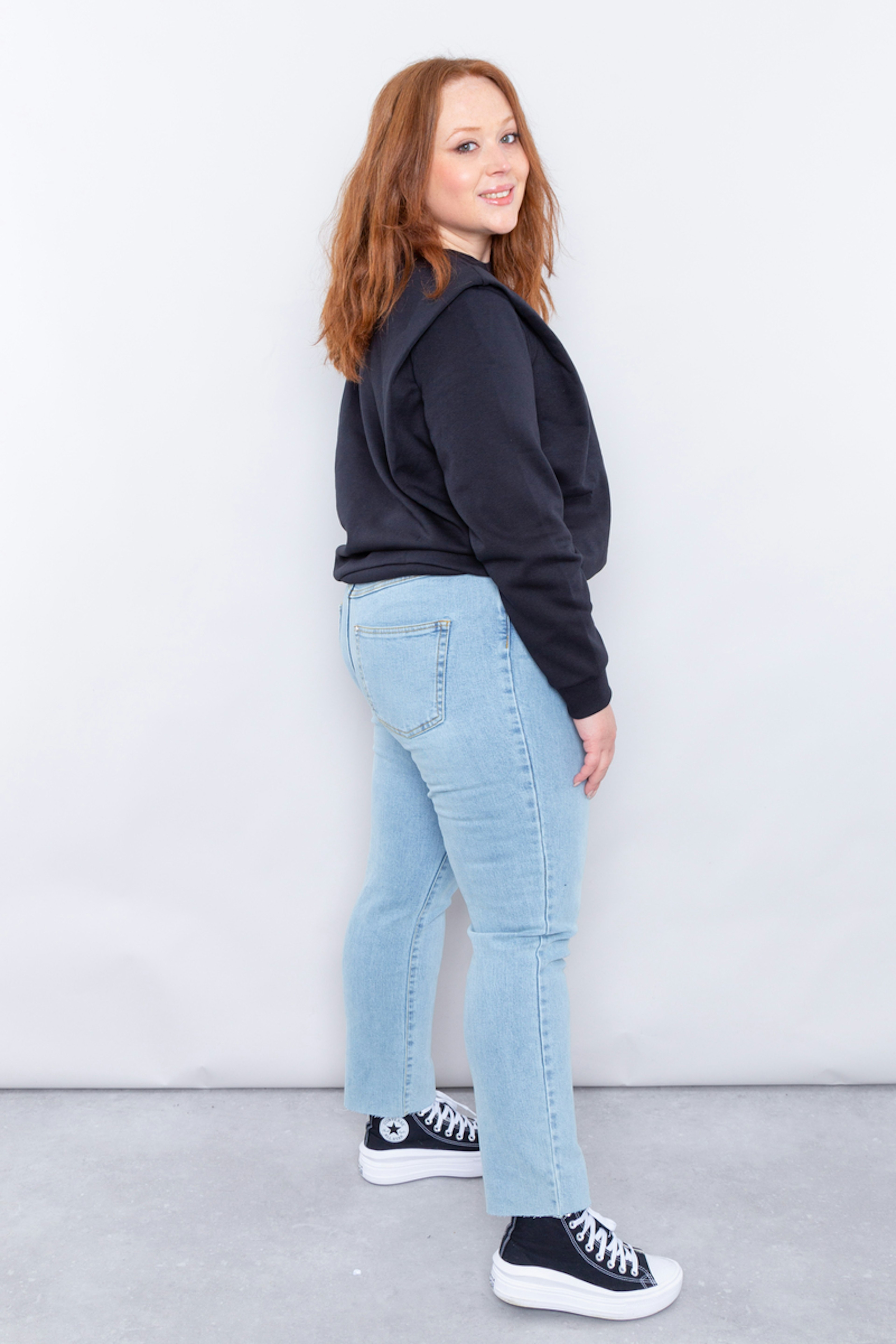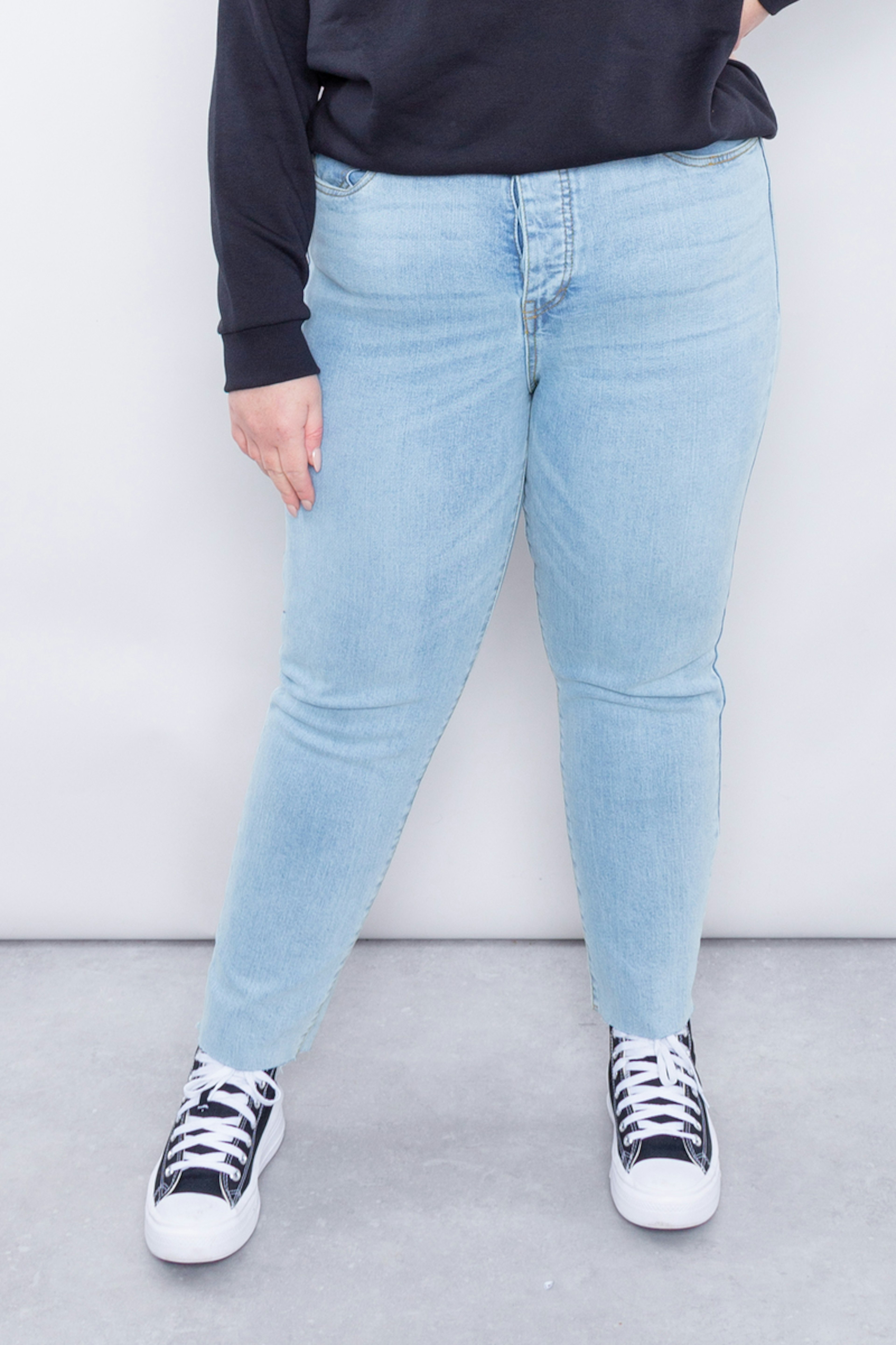 โข Jean droit bleu clair โข Taille mi-haute โข Braguette zippรฉe โข 5 poches โข Contient de l'รฉlasthanne
