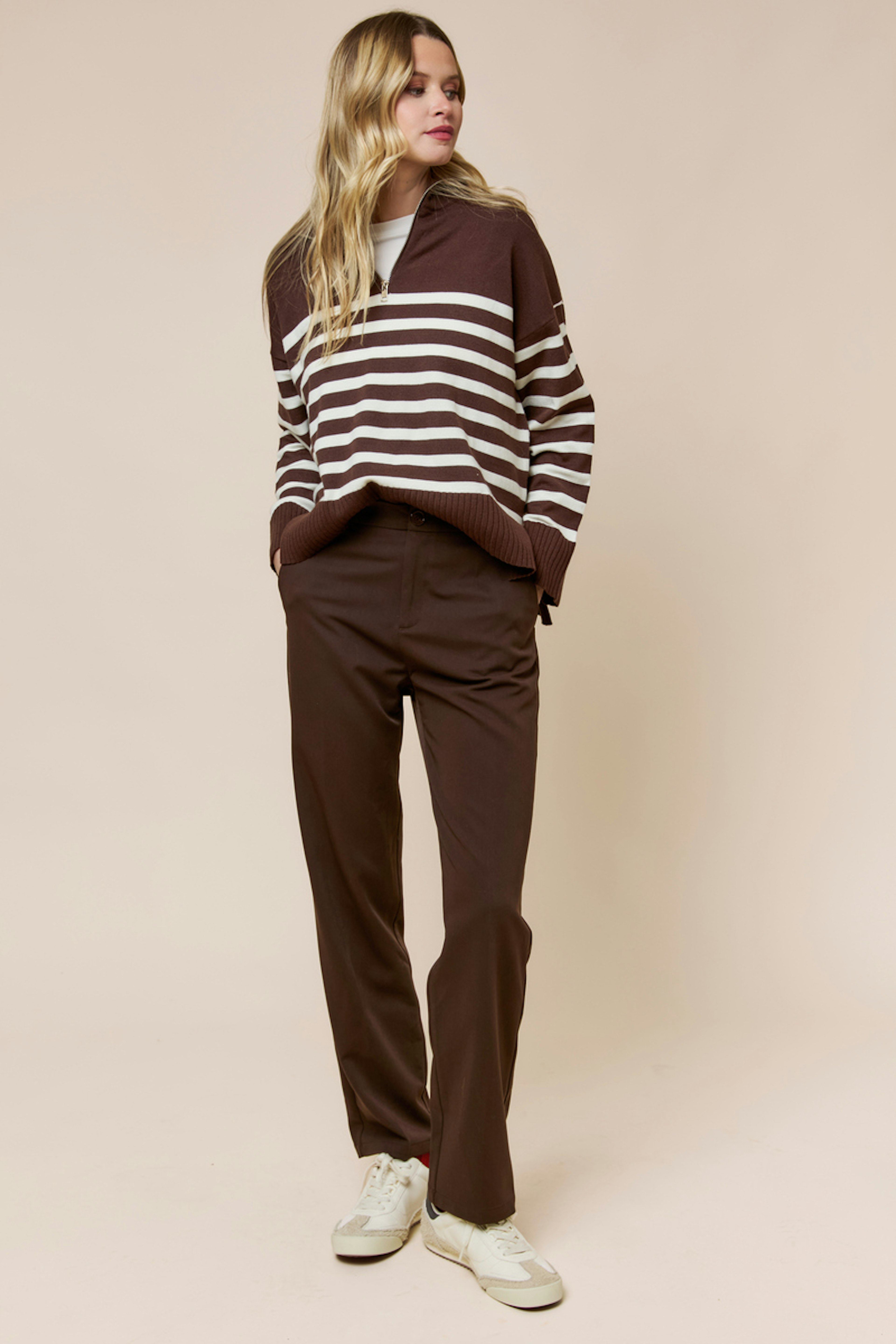 Associez-le avec un pull oversize pour un look décontracté et chic. Parfait en toute saison. • Pantalon marron • Coupe droite • Taille mi-haute • Jambes légèrement évasées • Fermeture invisible