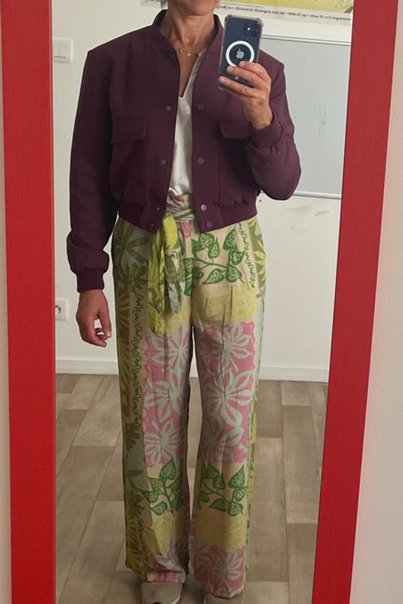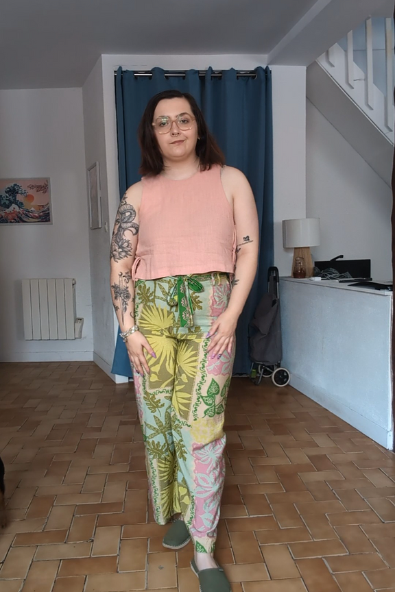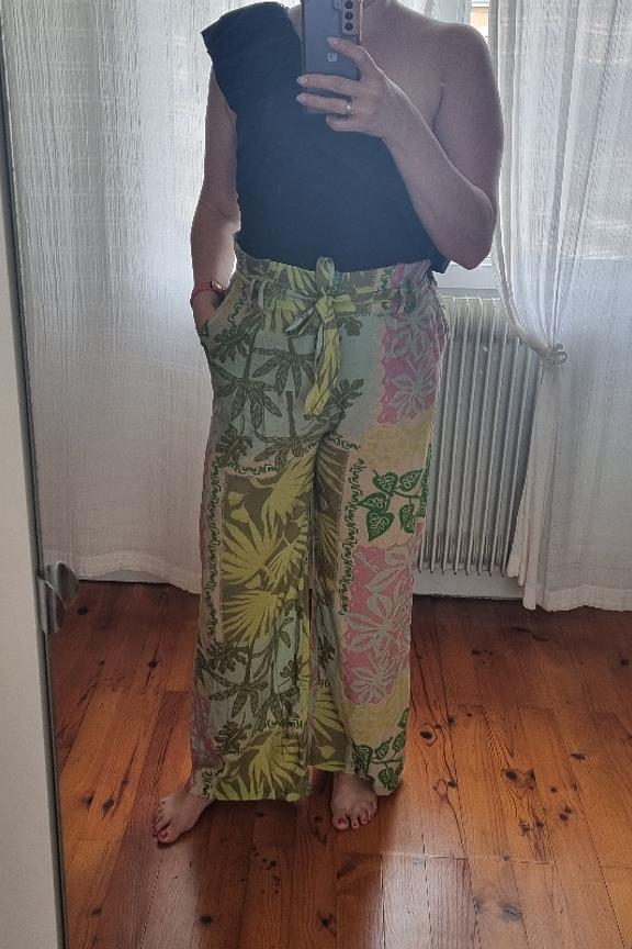 Ajoutez un top léger et des sandales pour une allure estivale décontractée. • Pantalon fluide en Tencel • Taille haute avec ceinture à nouer • Jambes larges et aériennes • Imprimé tropical vibrant • Parfait pour une touche d'exotisme