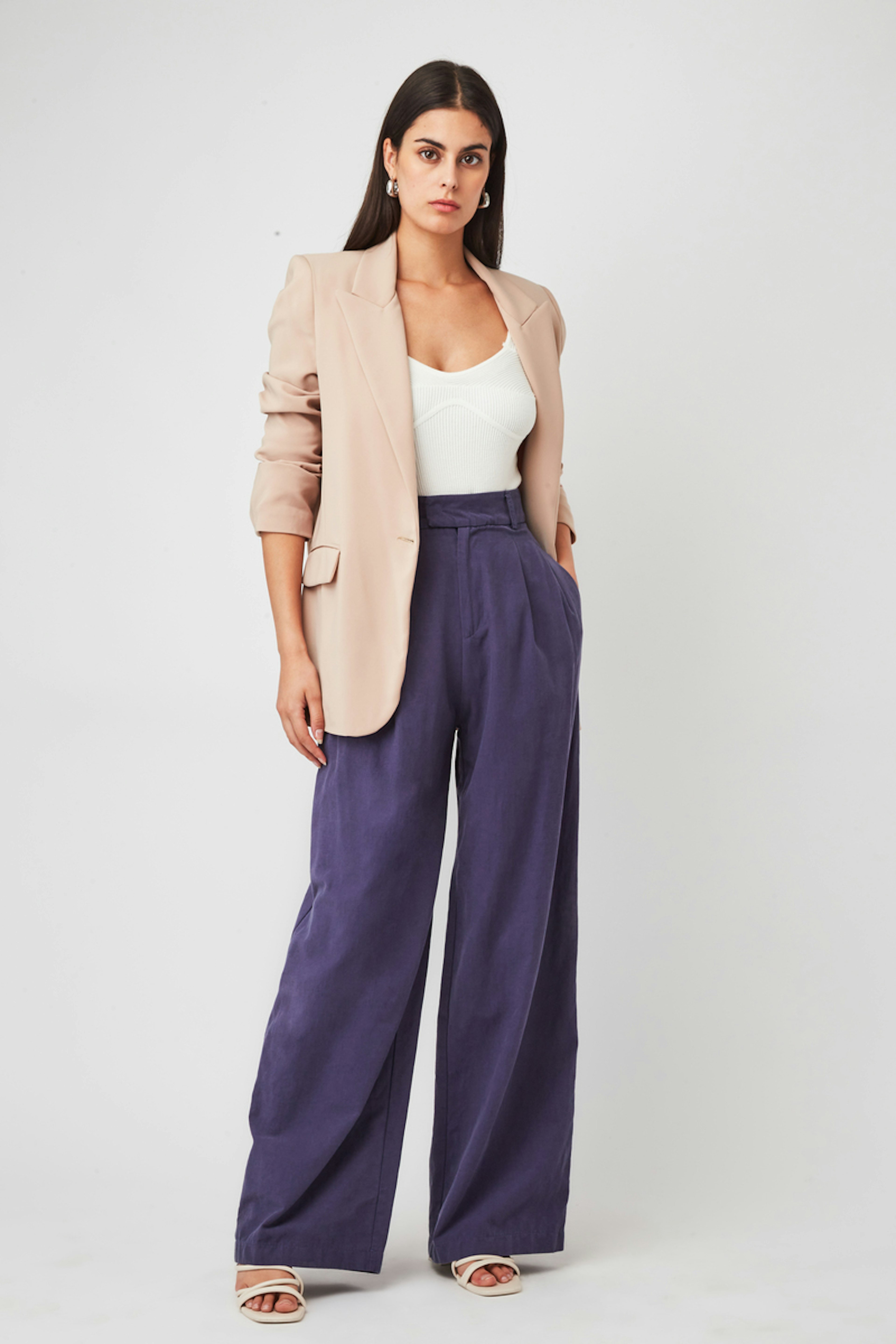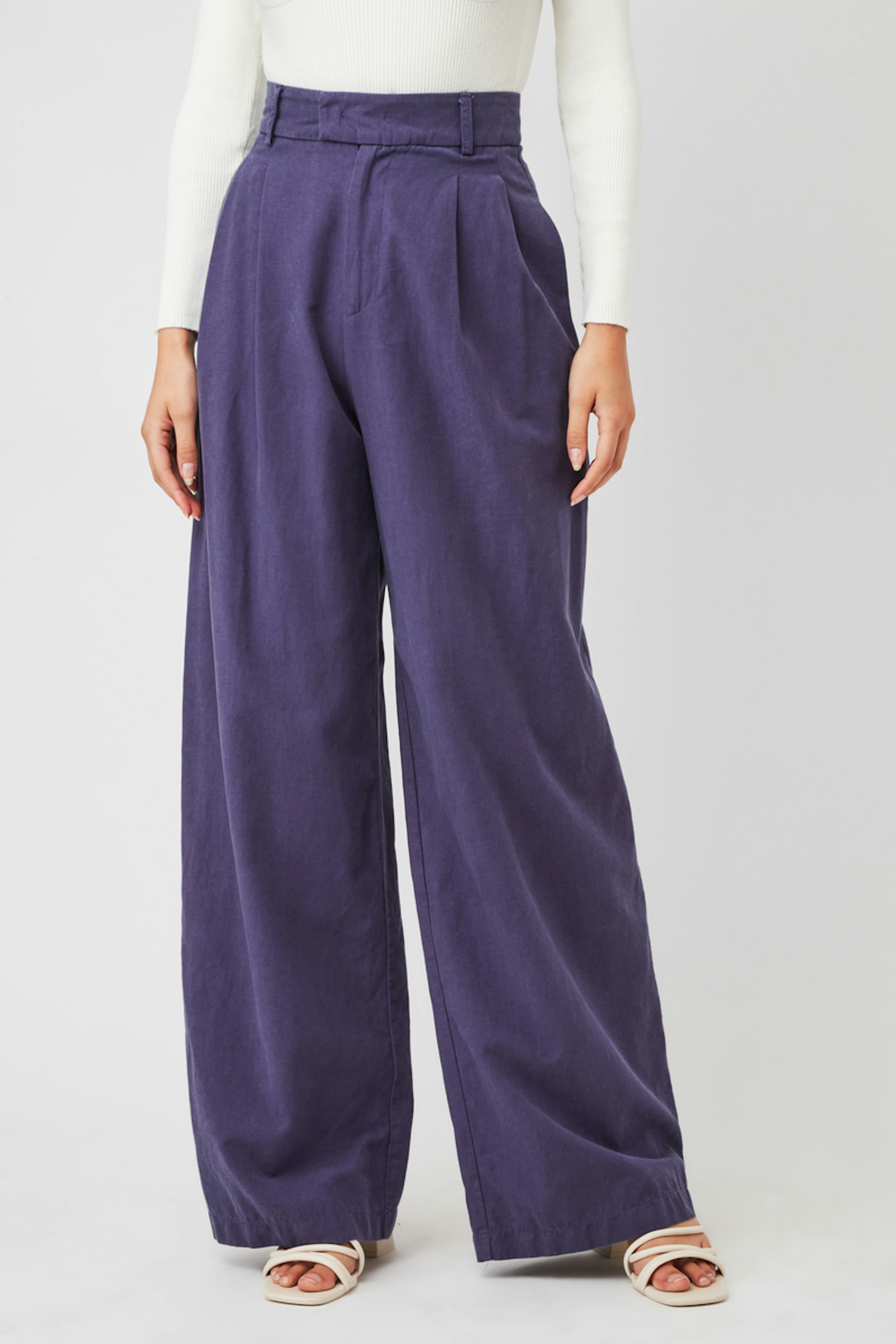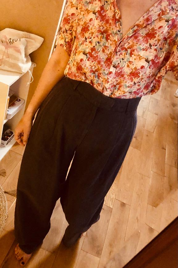 โข Pantalon bleu coupe tailleur ร jambes larges โข Matiรจre de type lin โข Taille haute โข Plis ร l'avant mettant en valeur la taille marquรฉe โข Coupe droite flatteuse โข ยจPassants pour ceinture