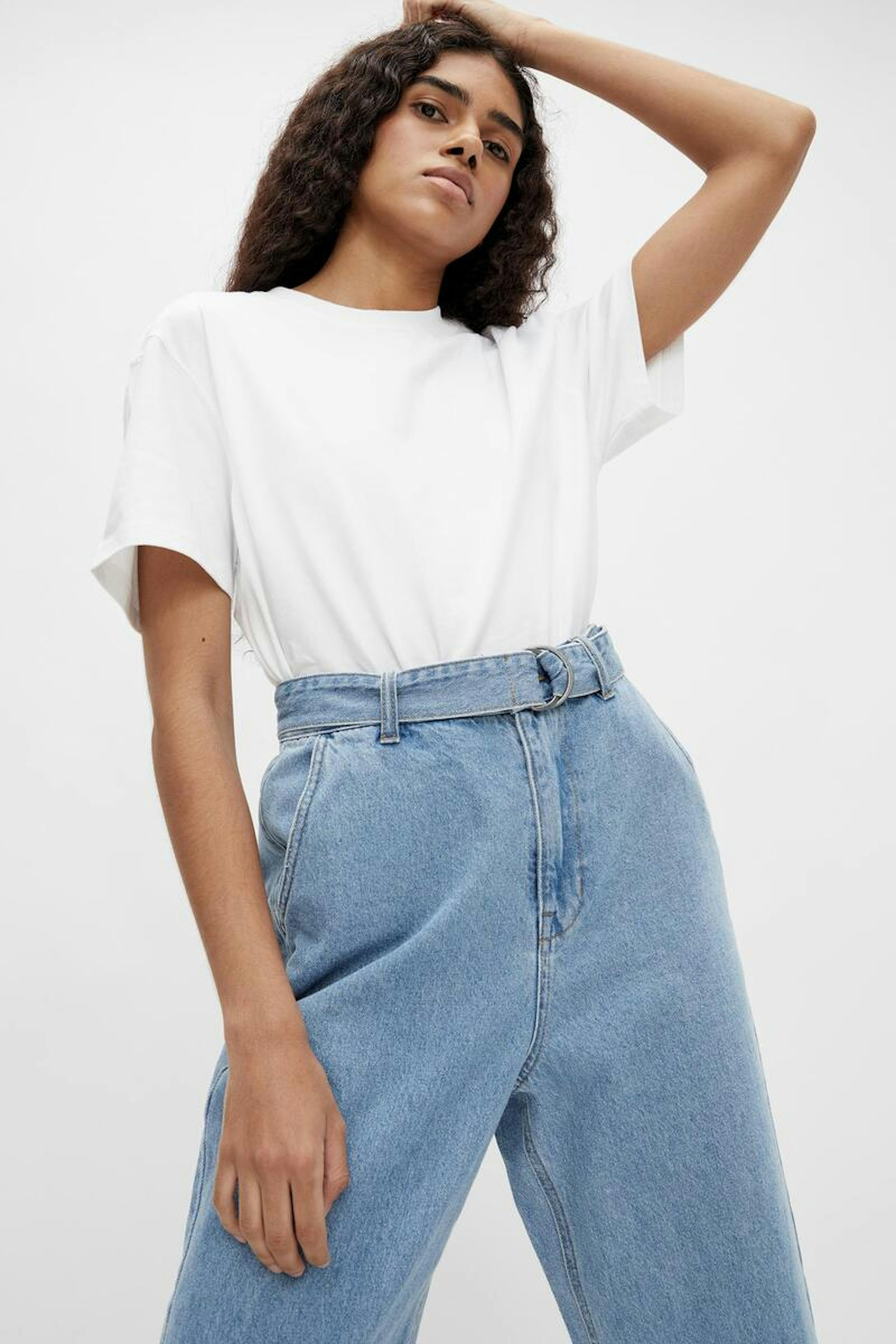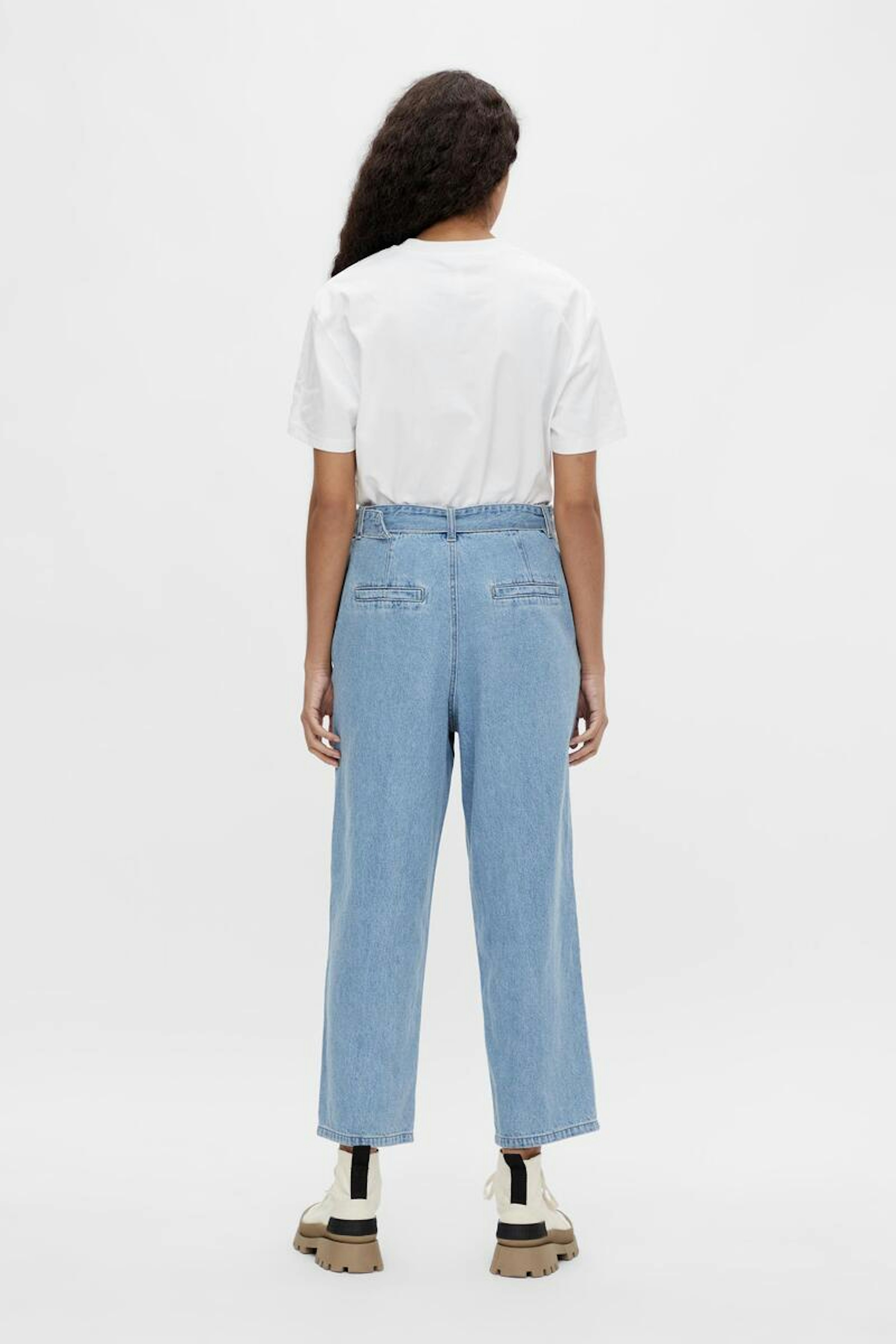โข Pantalon en denim โข Taille haute โข Ceinture avec boucle โข Coupe large โข Fabriquรฉ dans un tissu en coton bio