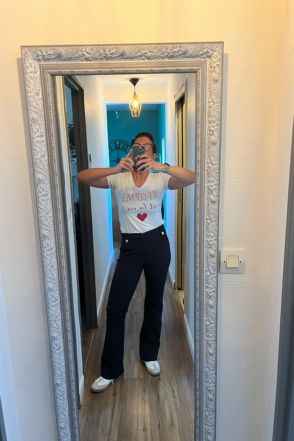 “J aime beaucoup le détail des boutons qui donnent un côté pantalon marin.”