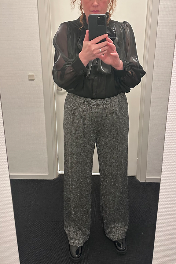 Associez ce pantalon avec une blouse fluide et des escarpins pour une allure chic et sophistiquée. Idéal pour les soirées d'hiver élégantes. • Pantalon large scintillant • Coupe ample et fluide • Taille haute élastiquée • Jambe droite • Tissu gris argenté lumineux