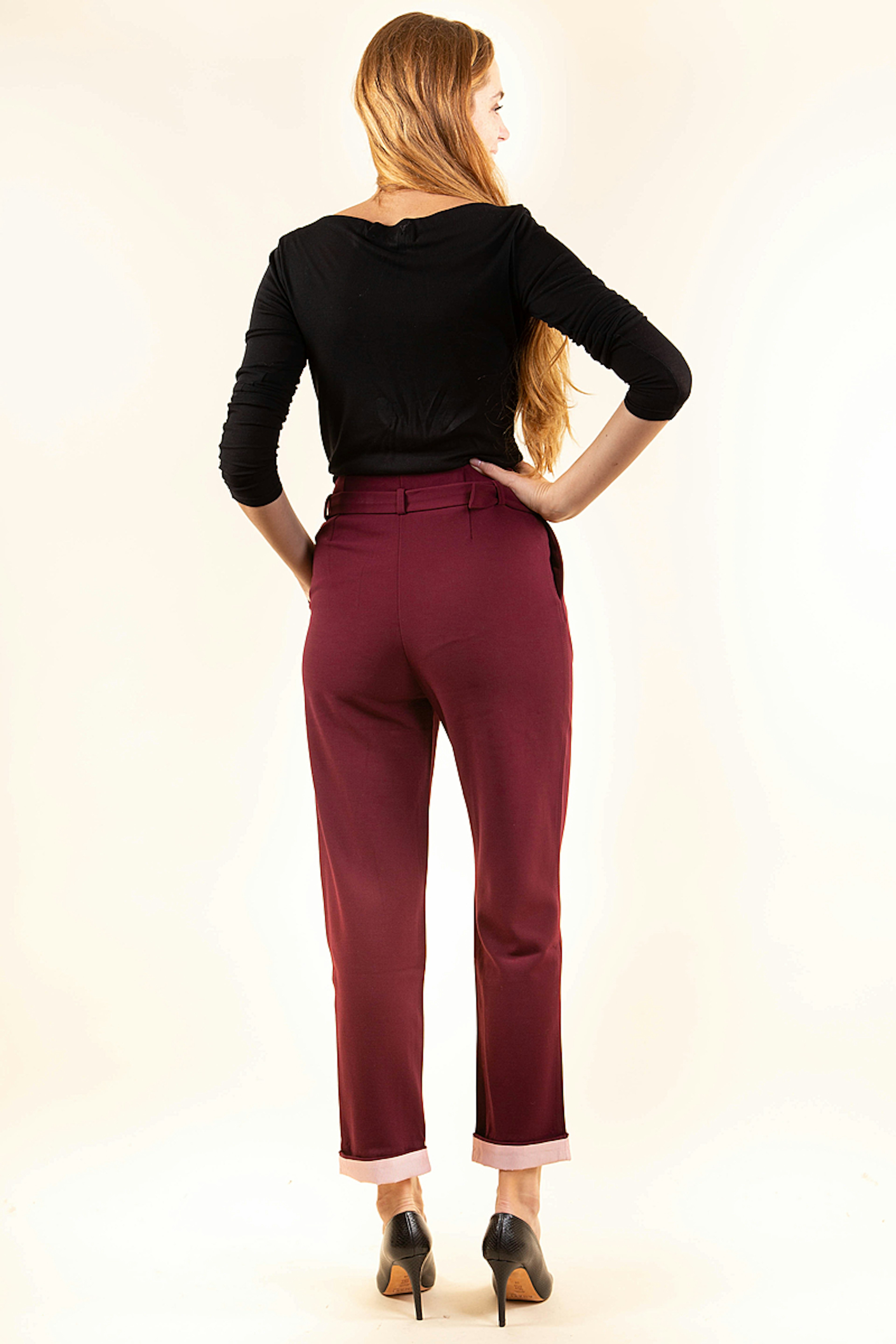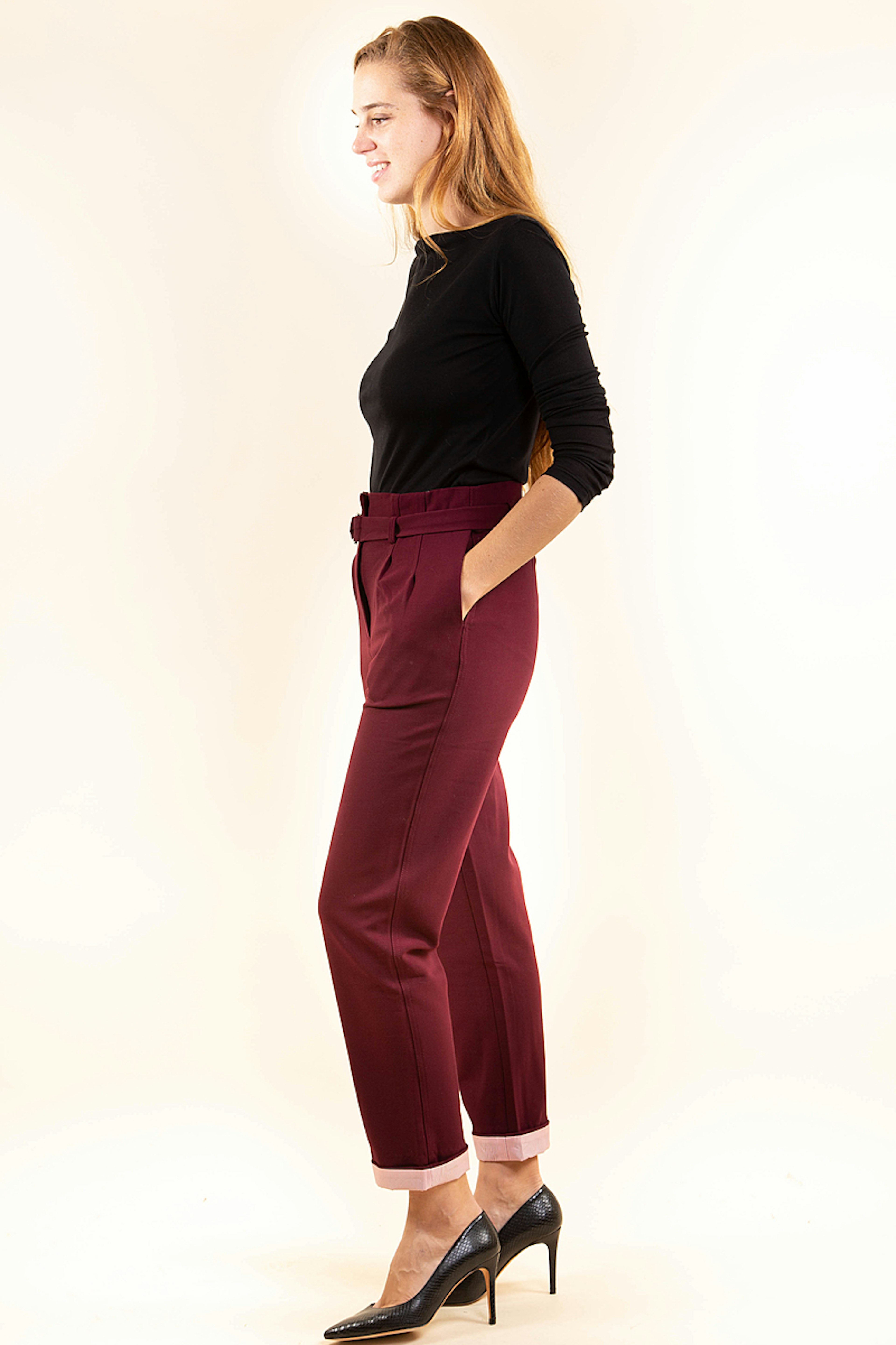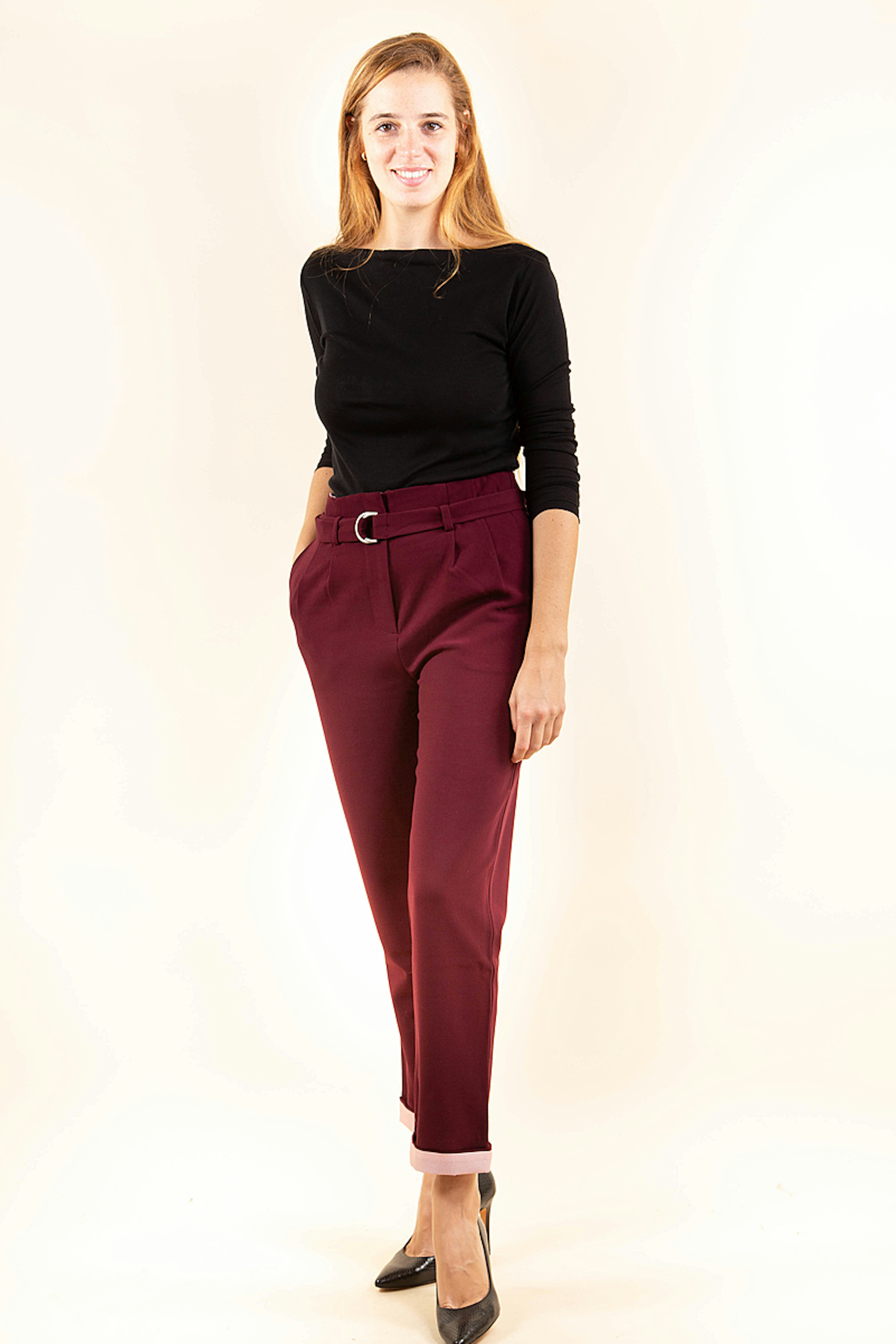 Coup de coeur pour ce pantalon habillรฉ bordeaux de la marque Yuka. On aime particuliรจrement sa forme carotte et sa ceinture assortie. Portez-le avec un petit pull en maille noir pour un effet chic effortless.