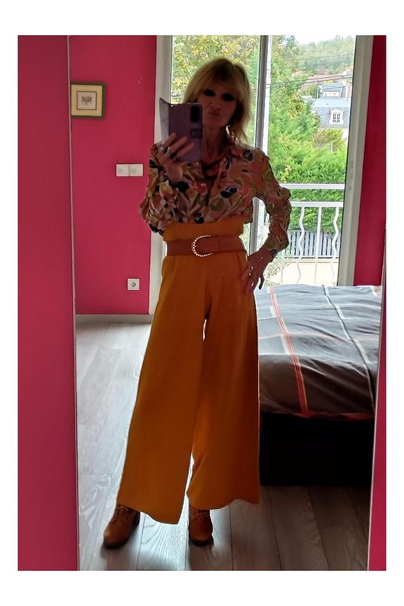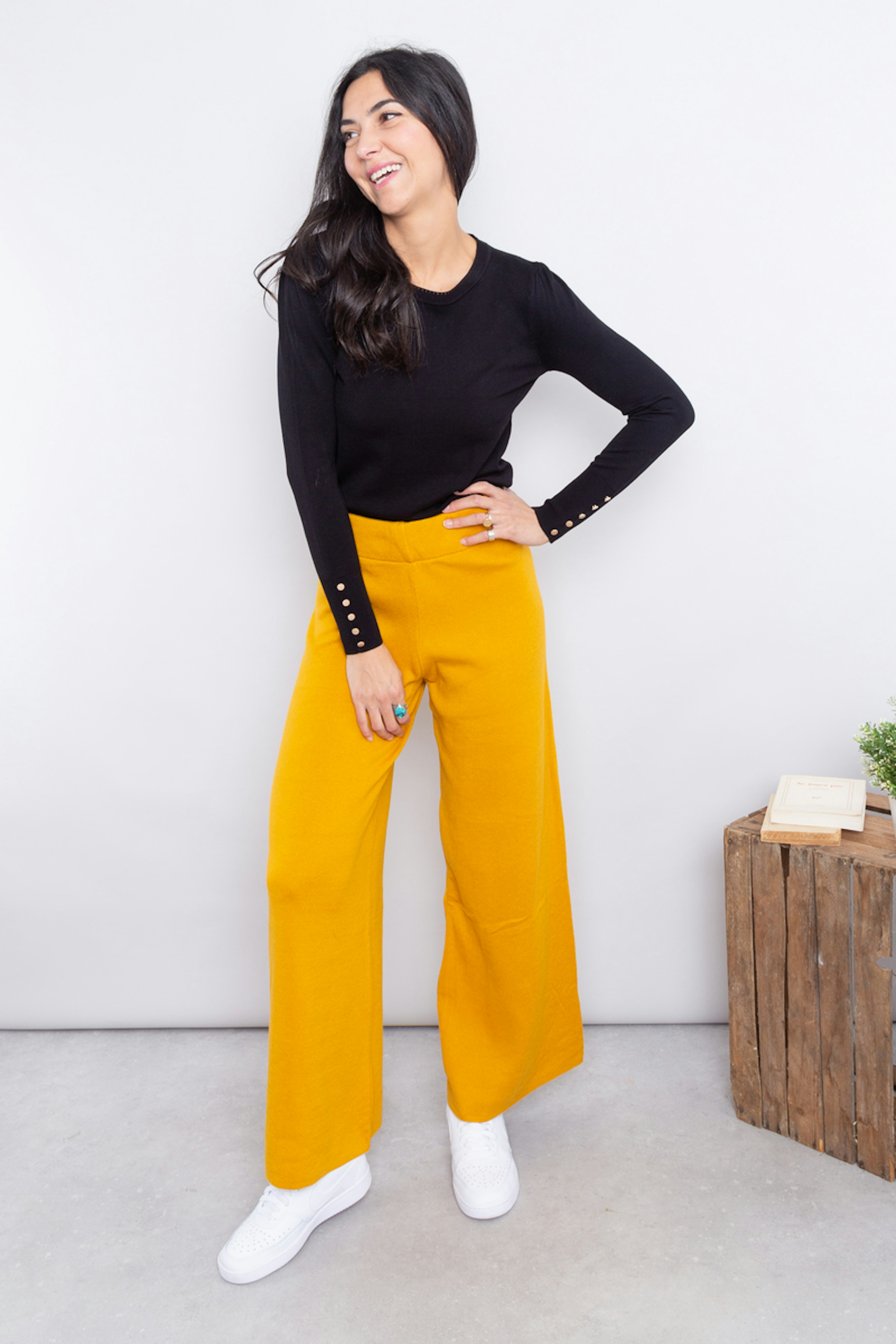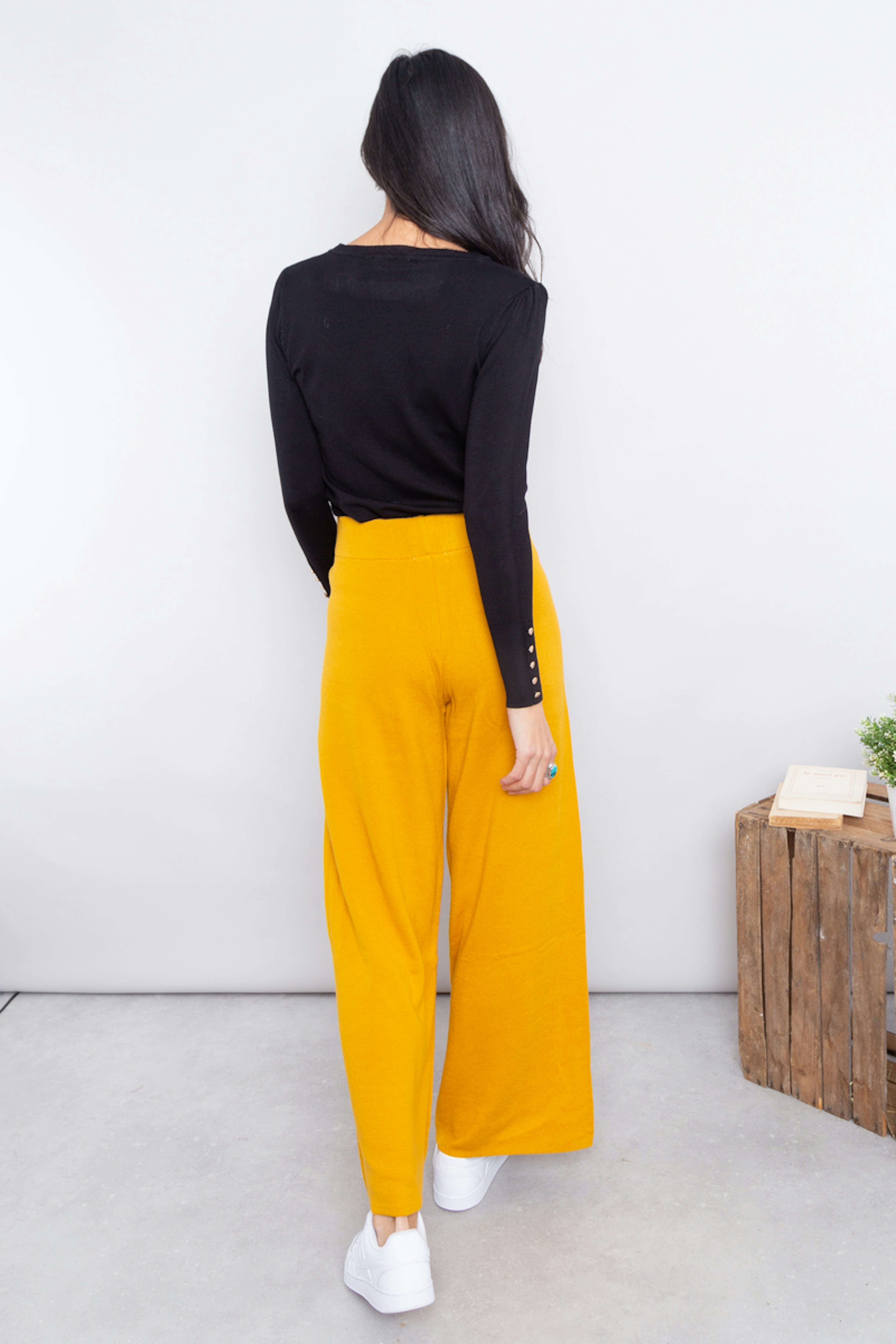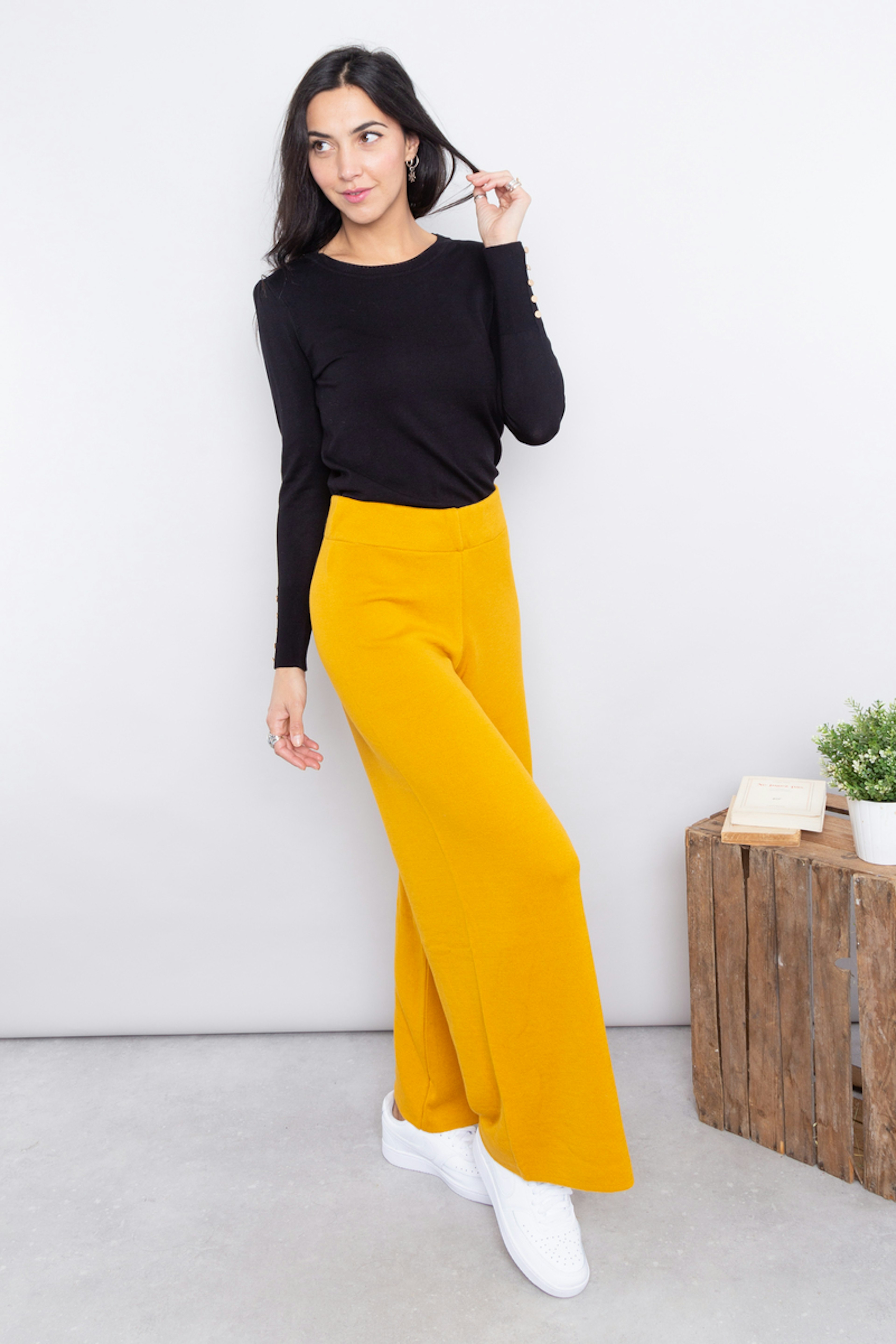 โข Pantalon jaune moutarde โข Taille haute รฉlastiquรฉe โข Coupe large