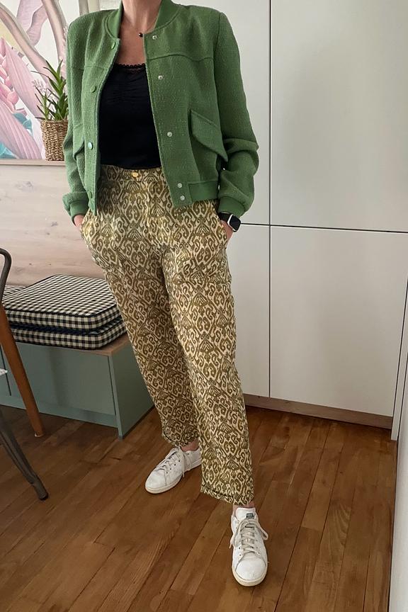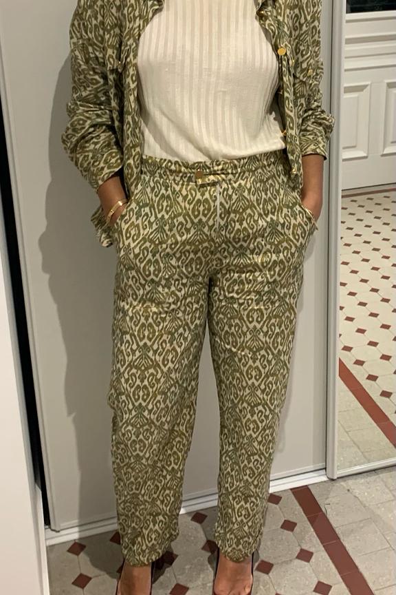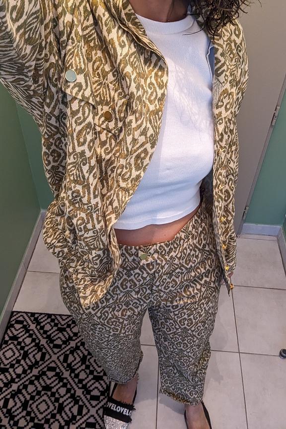 Illuminez votre quotidien avec ce pantalon dorรฉ et kaki, parfait pour toute saison. ร associer avec un haut uni pour un look chic et รฉquilibrรฉ. โข Pantalon jacquard Lurex โข Longueur cheville โข Poches plaquรฉes โข Taille รฉlastiquรฉe dos โข Revers bas de jambe โข Bouton mรฉtalisรฉ dorรฉ