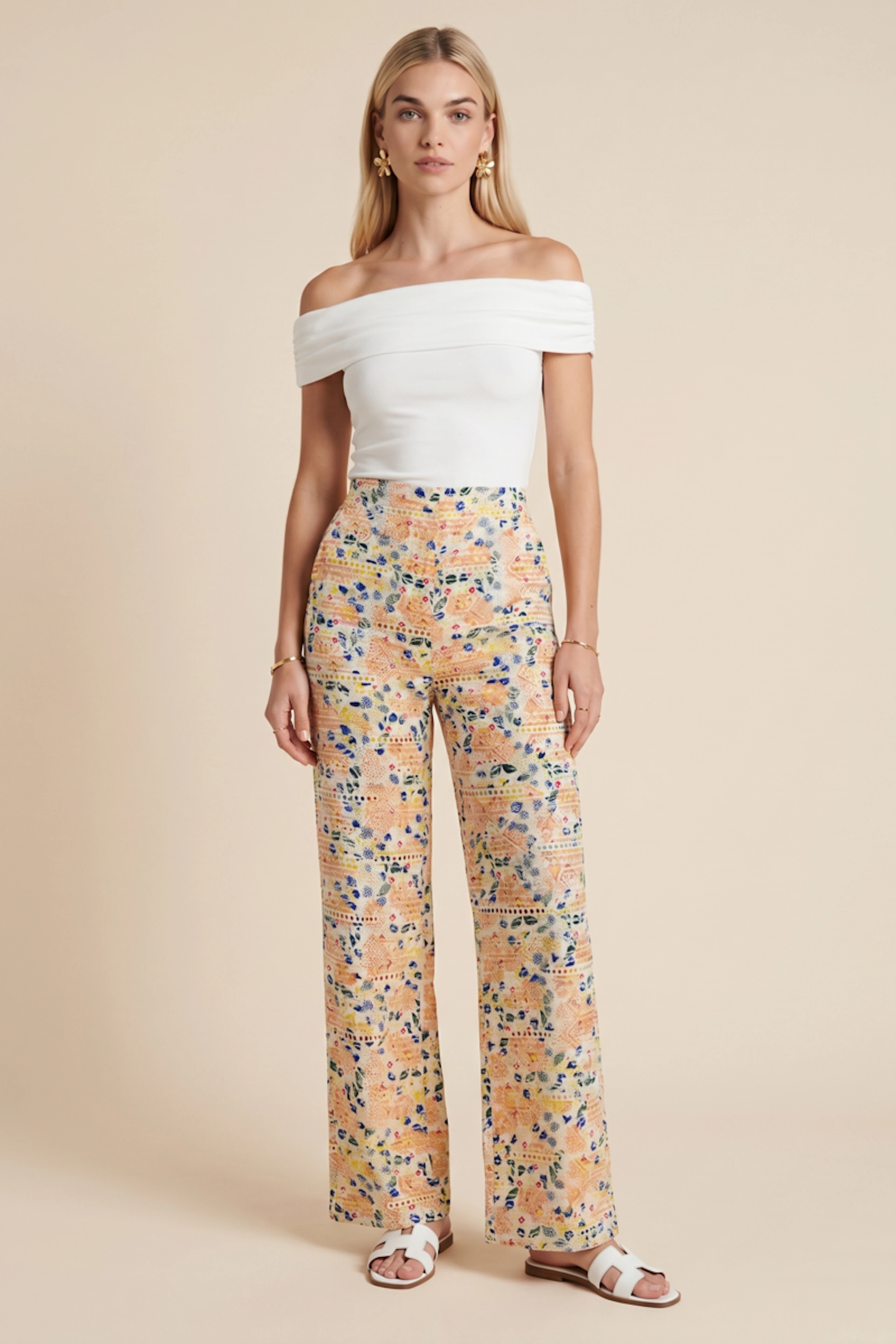 Optez pour un look chic avec un haut à bretelles et des sandales à talons pour une sortie estivale élégante. • Pantalon coupe droite florale • Motif fleuri attrayant • Taille haute pour un effet élancé • Jambe ample et fluide • Fermeture éclair discrète sur le côté
