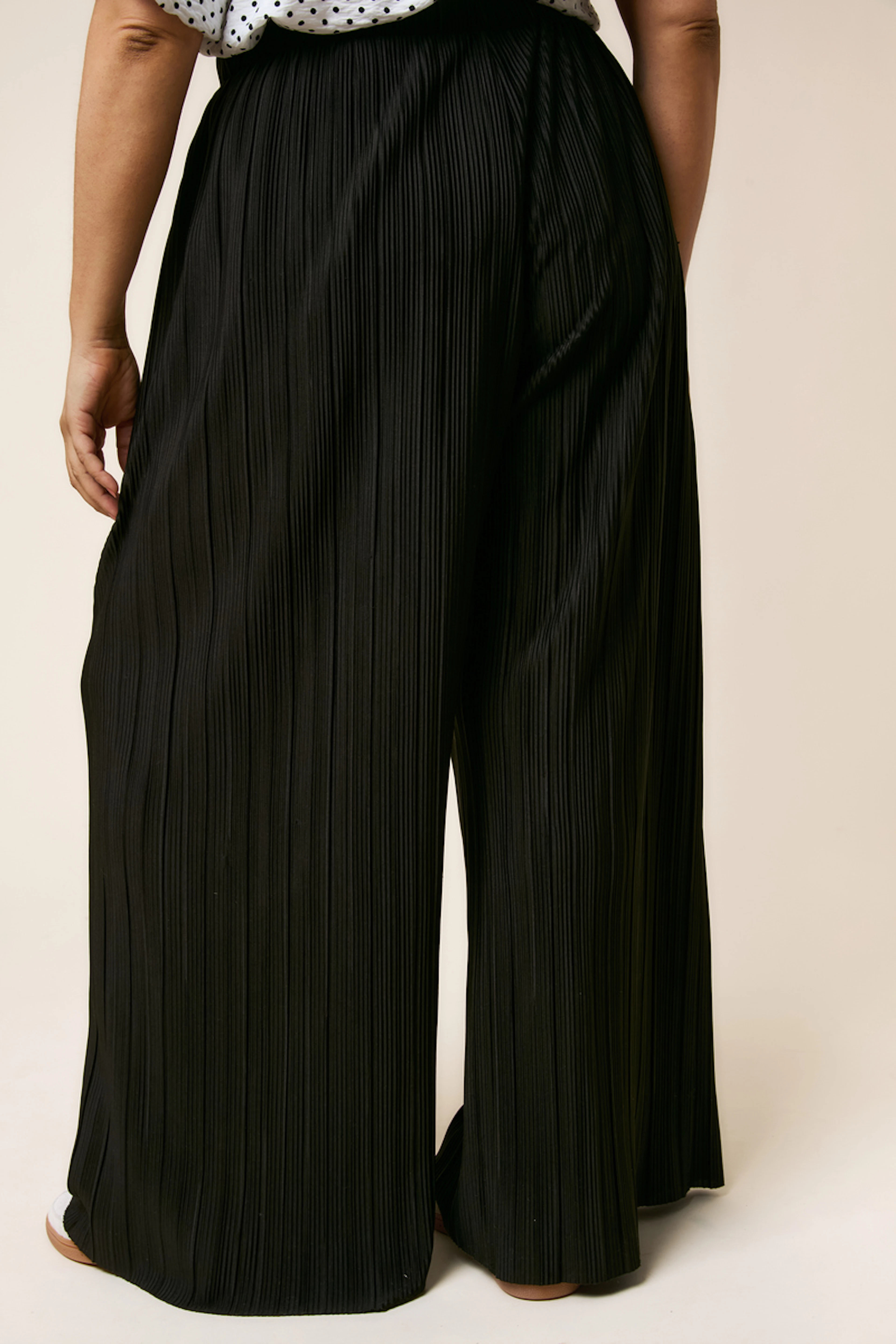 Associez ce pantalon plissé noir avec un haut ajusté et des sandales à talons pour une allure chic et décontractée. Parfait en toute saison. • Pantalon plissé • Coupe regular • Ceinture élastiquée • Jambes larges • Texture plissée élégante