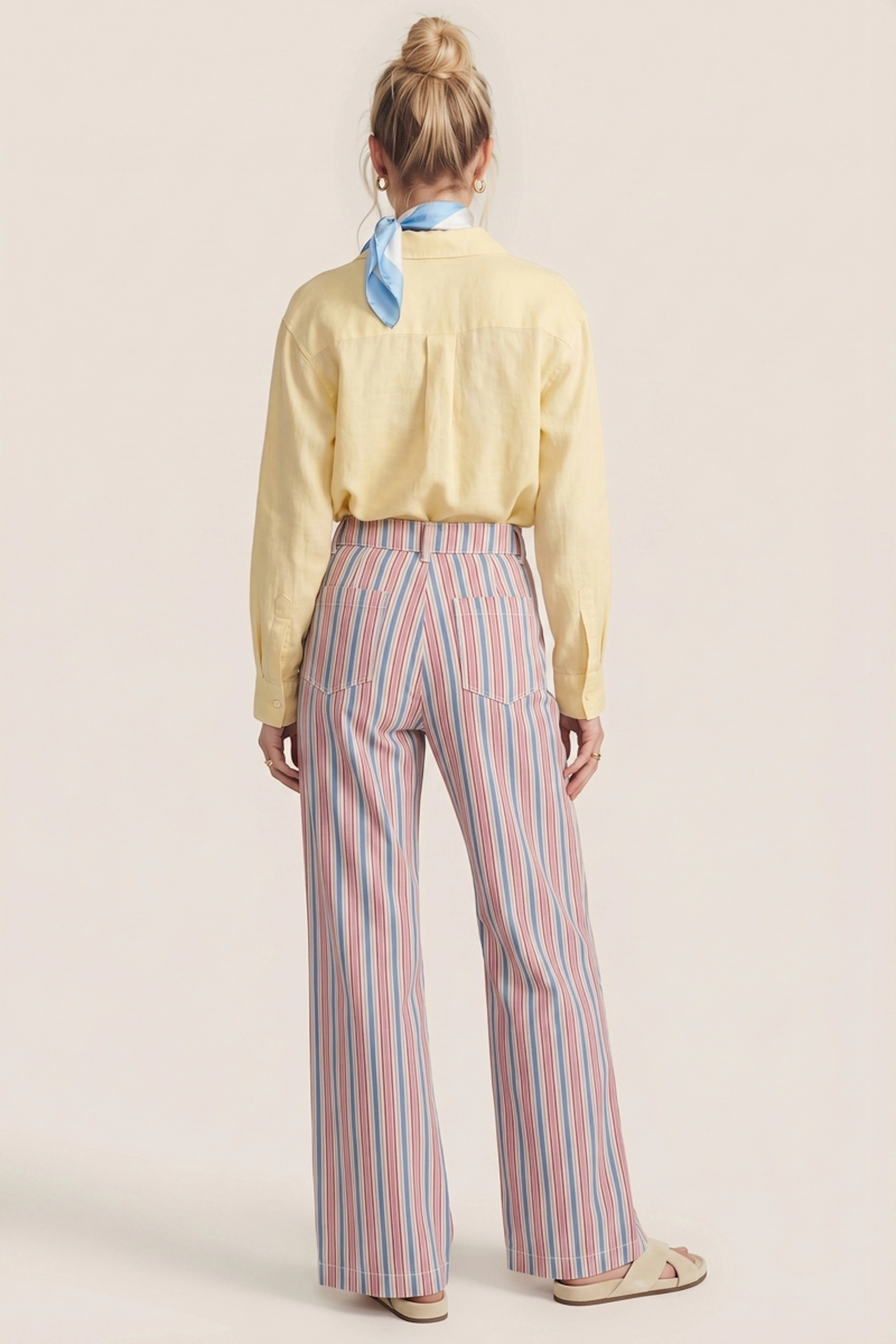 Associez ce pantalon à une blouse légère pour une allure fraîche parfaite en été. Ajoutez des sandales pour accentuer le look estival. • Pantalon large en coton • Taille haute flatteuse • Jambes amples fluides • Motif rayé coloré • Fermeture boutonnée à l'avant